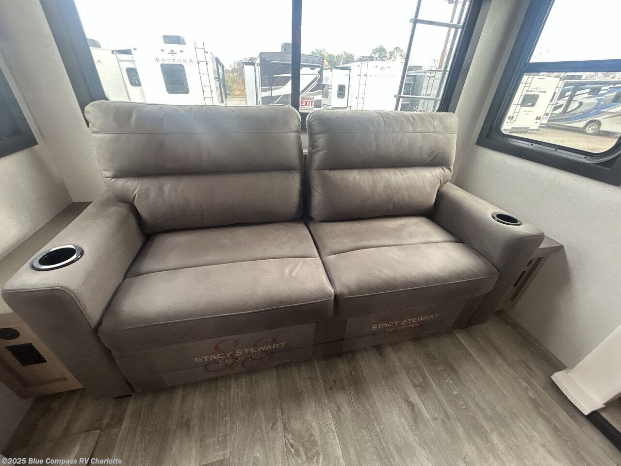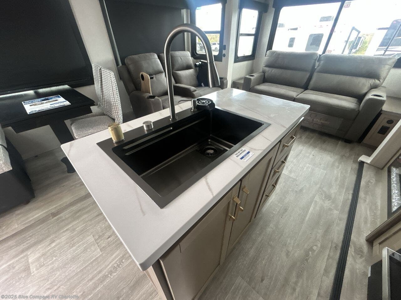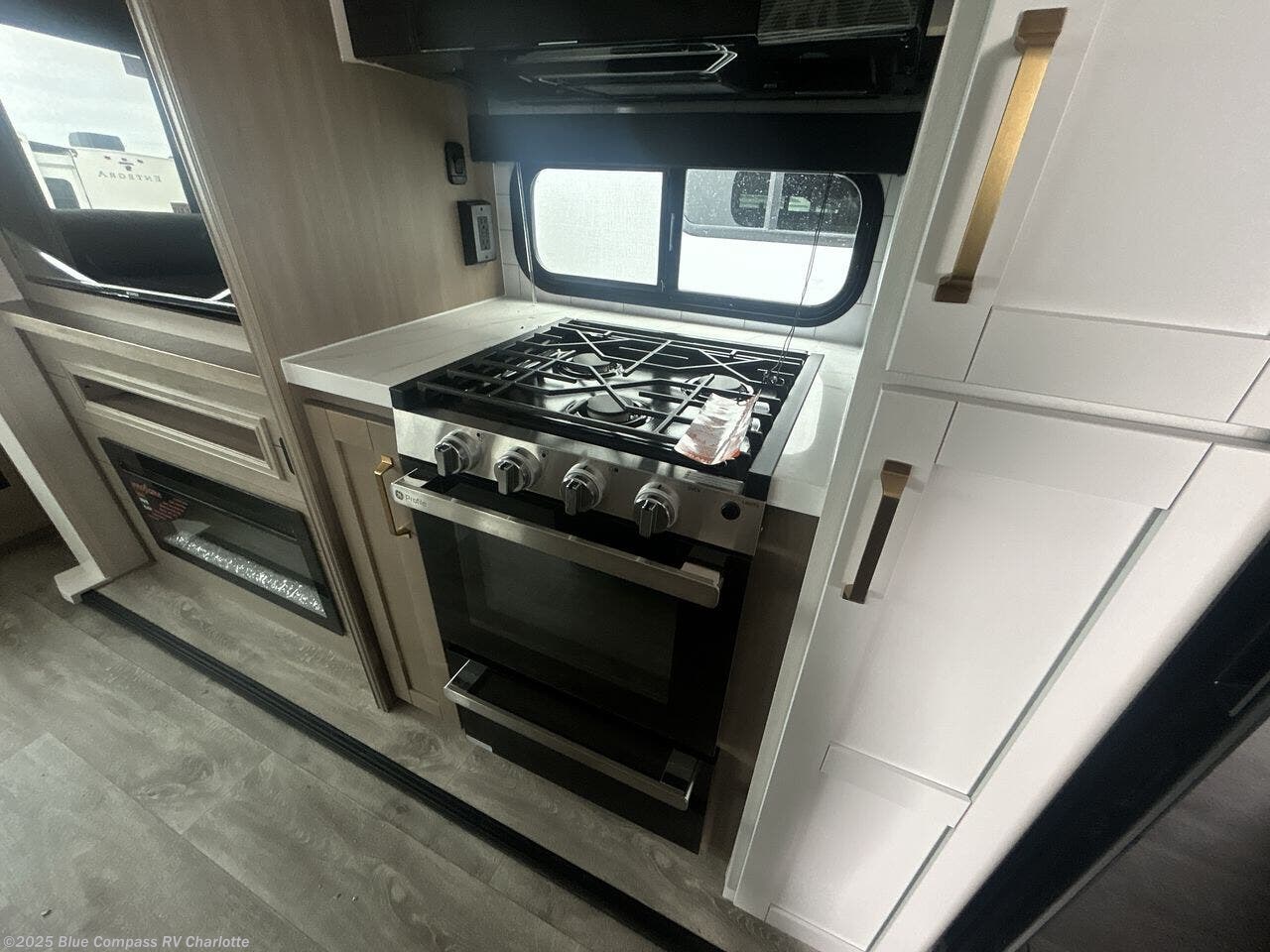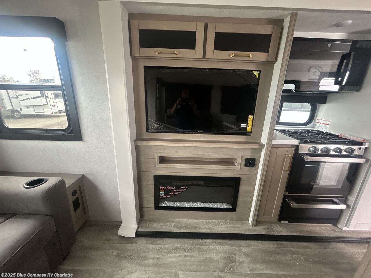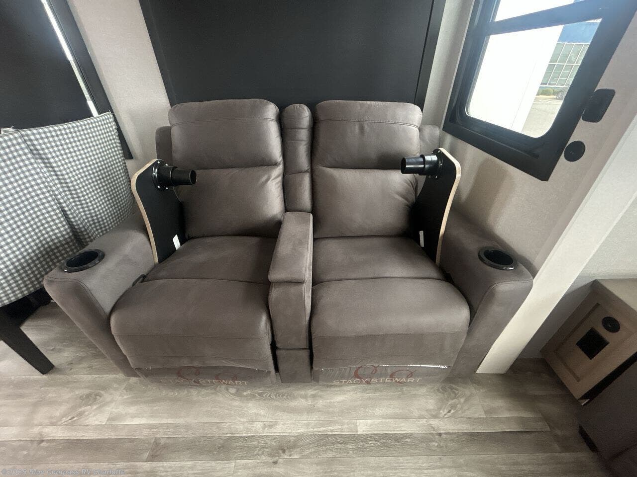 You will feel right at home camping in this travel trailer! It features a front private bedroom with an Olympic queen bed slide for more interior space, a dresser, a front wardrobe to hang your clothes, and a wardrobe that is prepped to add an optional washer and dryer. Start each morning getting squeaky clean in the full bathroom with the shower and then head to the kitchen to fry up some eggs on the stainless steel range. The kitchen island with a multi-functional sink will help make meal prepping easier too, plus there is a hutch to store your dishes. Enjoy a relaxing evening by the fireplace and watch your favorite movie with the entertainment center while sitting on either the rear tri-fold sofa or the theater seating!