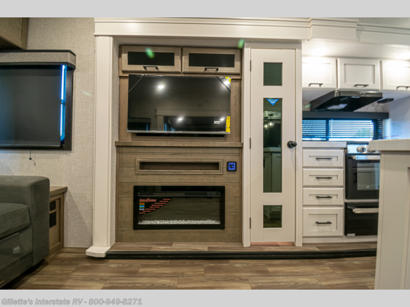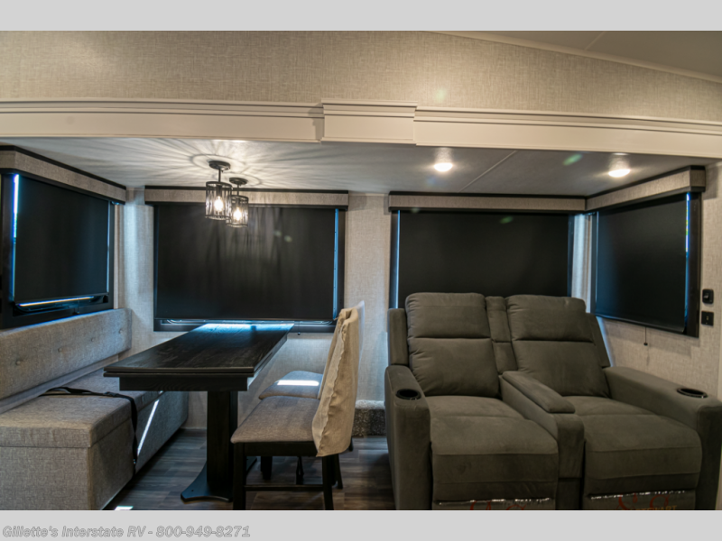 You will love how much interior space you have in this fifth wheel thanks to the dual opposing slides in the combined kitchen and living area! While your crew is relaxing on the theater seat or tri-fold sofa, you can prepare dinner on the GE black and stainless 21" range. There is also an entertainment center and fireplace across from the theater seat for easy viewing, and the table and chairs with a bench will be the perfect place to play a board game at. Head to the front to enjoy the private bedroom with an Olympic queen bed, and the full bath is close by for easy nighttime use!