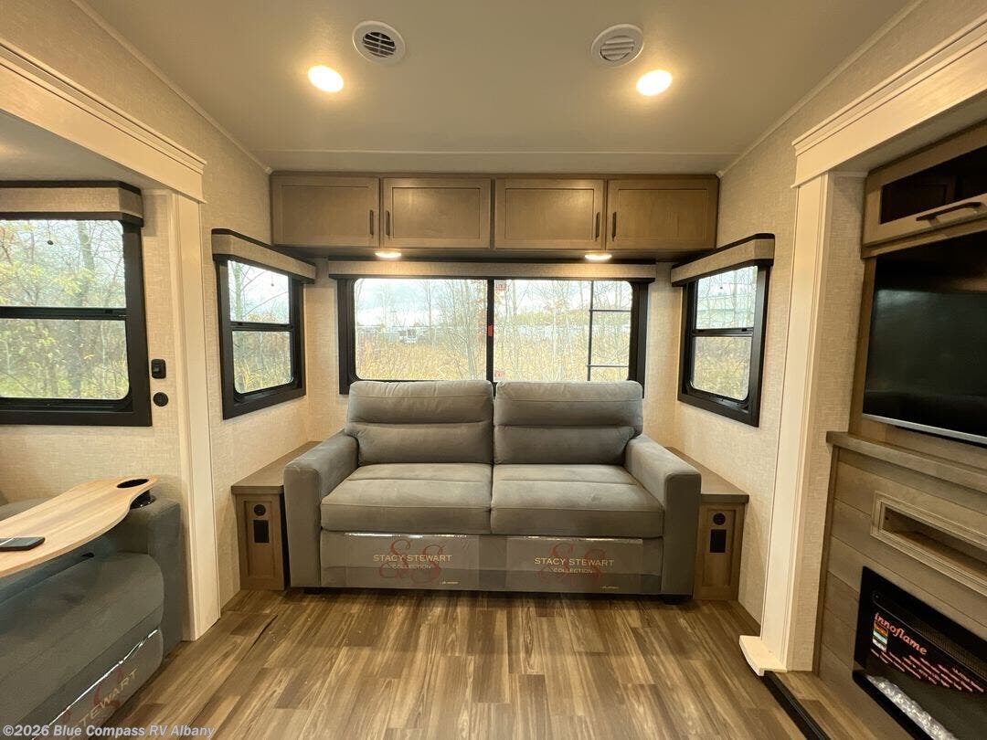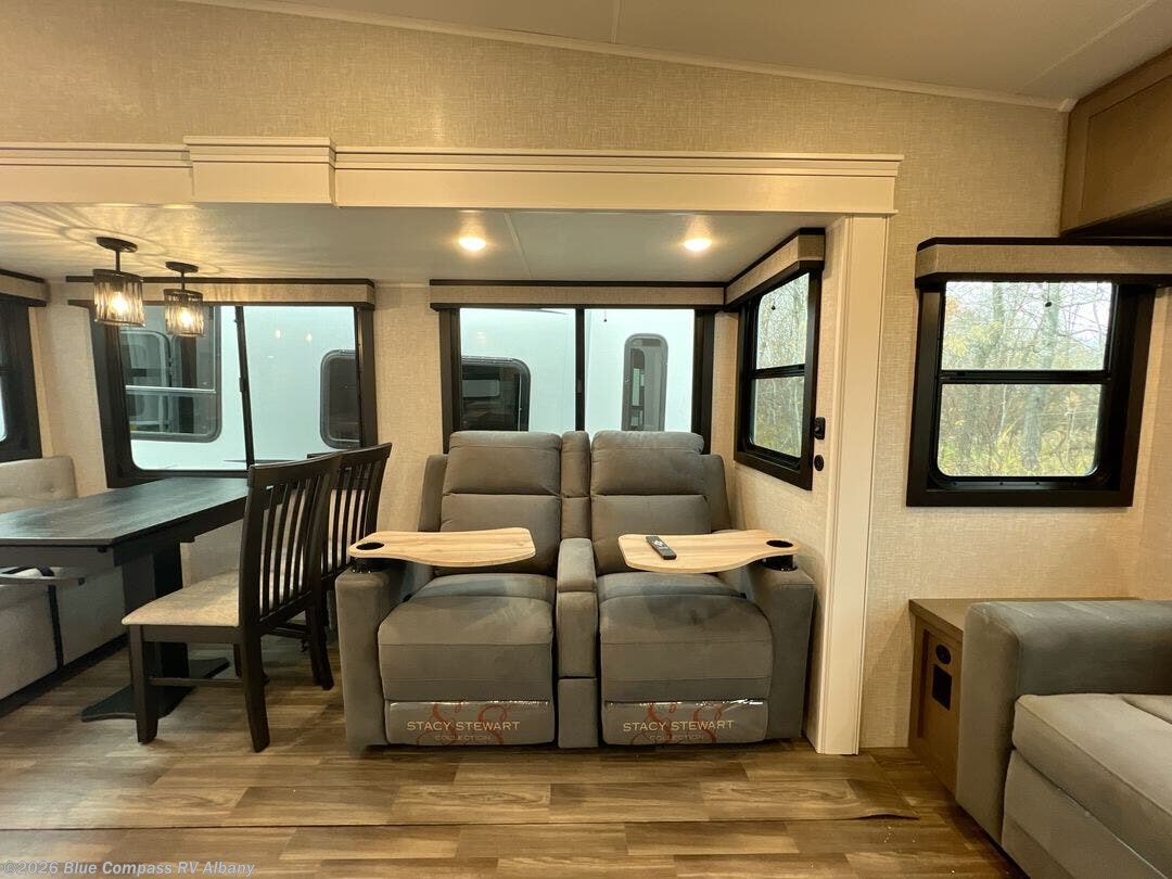 You will love how much interior space you have in this fifth wheel thanks to the dual opposing slides in the combined kitchen and living area! While your crew is relaxing on the theater seat or tri-fold sofa, you can prepare dinner on the GE black and stainless 21" range. There is also an entertainment center and fireplace across from the theater seat for easy viewing, and the table and chairs with a bench will be the perfect place to play a board game at. Head to the front to enjoy the private bedroom with an Olympic queen bed, and the full bath is close by for easy nighttime use!