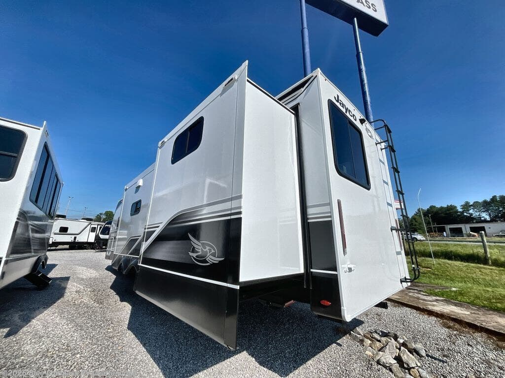 With any Eagle HT fifth wheel or travel trailer by Jayco you will enjoy a smooth drive thanks to the 4 Star Handling Package, Goodyear Endurance tires, and MORryde CRE-3000 rubberized suspension. The Customer Value Package includes amenities that are sure to make camping easier than ever, like the 60K on-demand water heater, Keyed-Alike lock system, 15,000 BTU "Whisper Quiet" A/C, and more. Handcrafted and glazed door/drawer fronts will make your space feel more like home, along with residential vinyl flooring throughout, GE appliances, and blackout roller shades with reflective side throughout to keep the sun out when you want to sleep in. Each model also includes a NuVo H2O water treatment system with filters included, interior and exterior "Blue Sync" audio connect with MB Quart Sound for your TV and phone, and 100% no floor vents for added comfort and convenience!