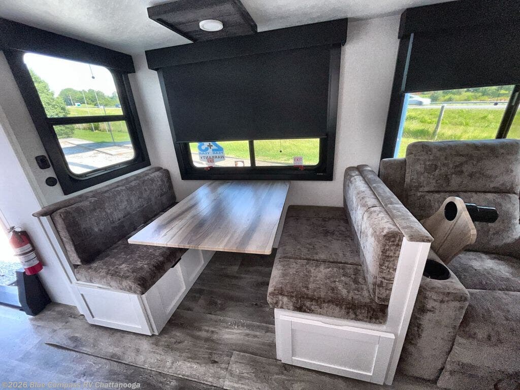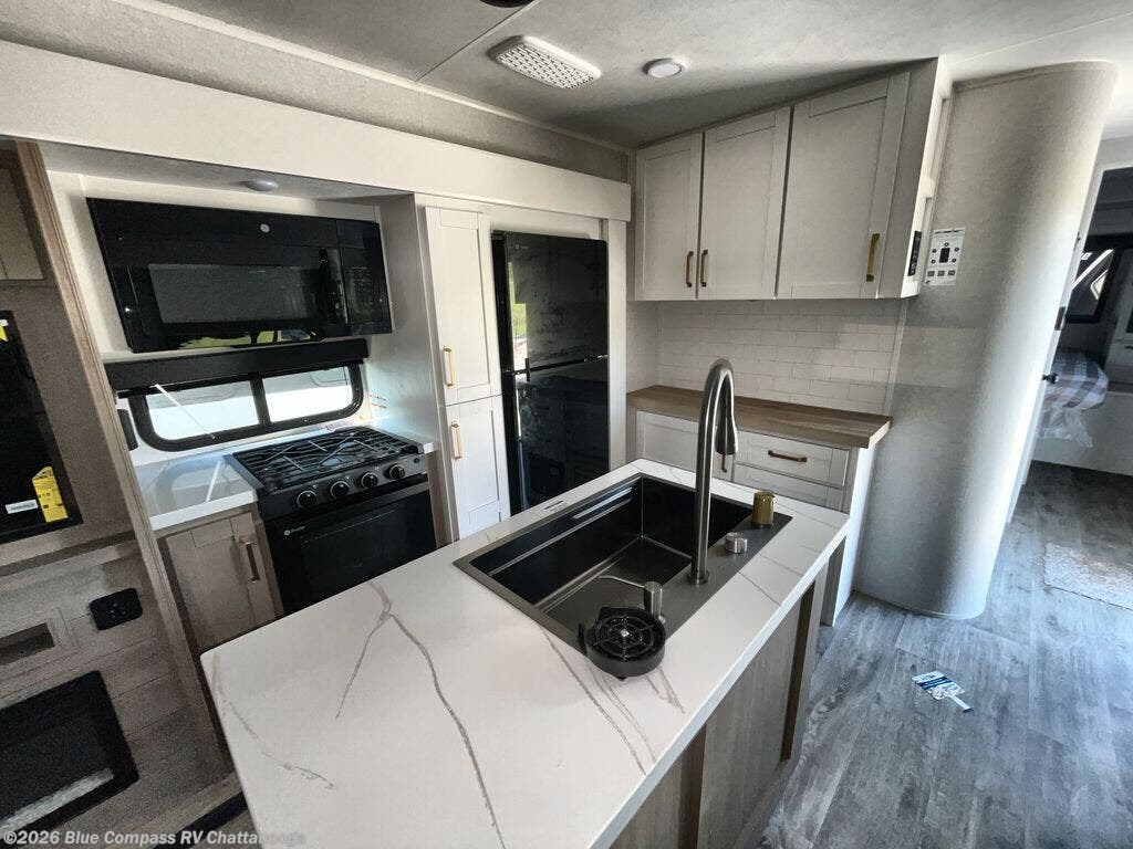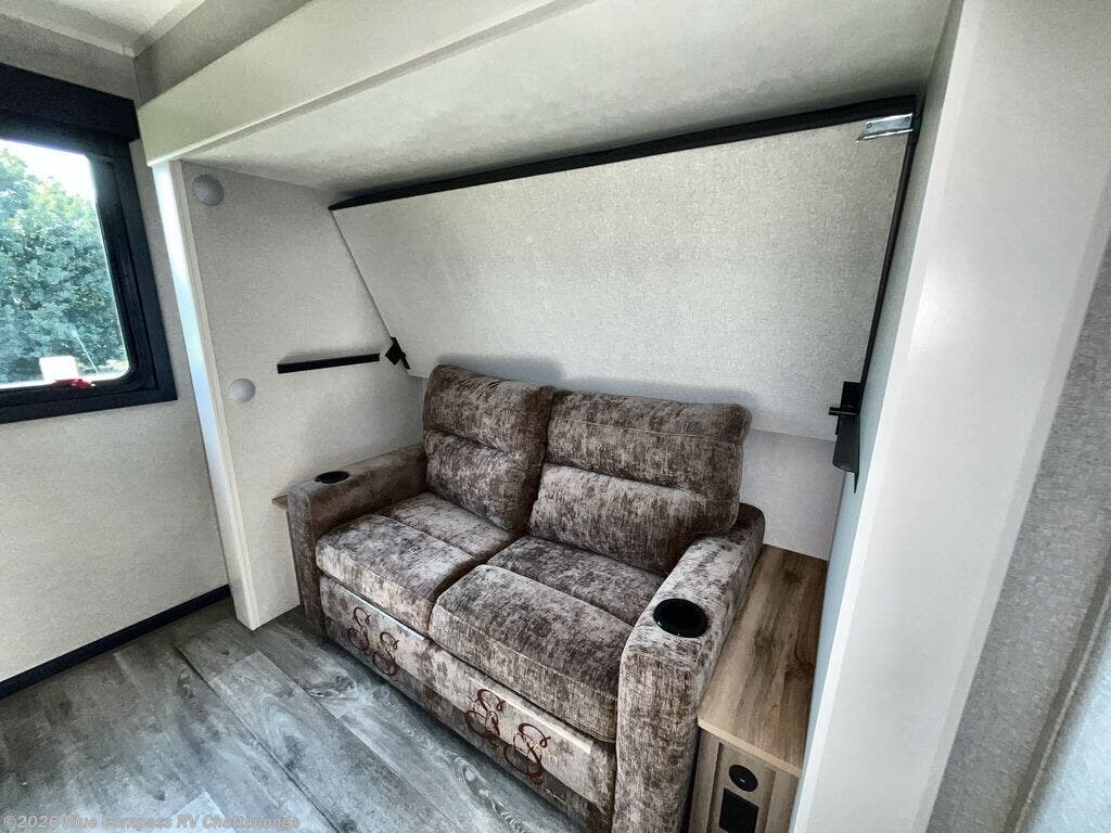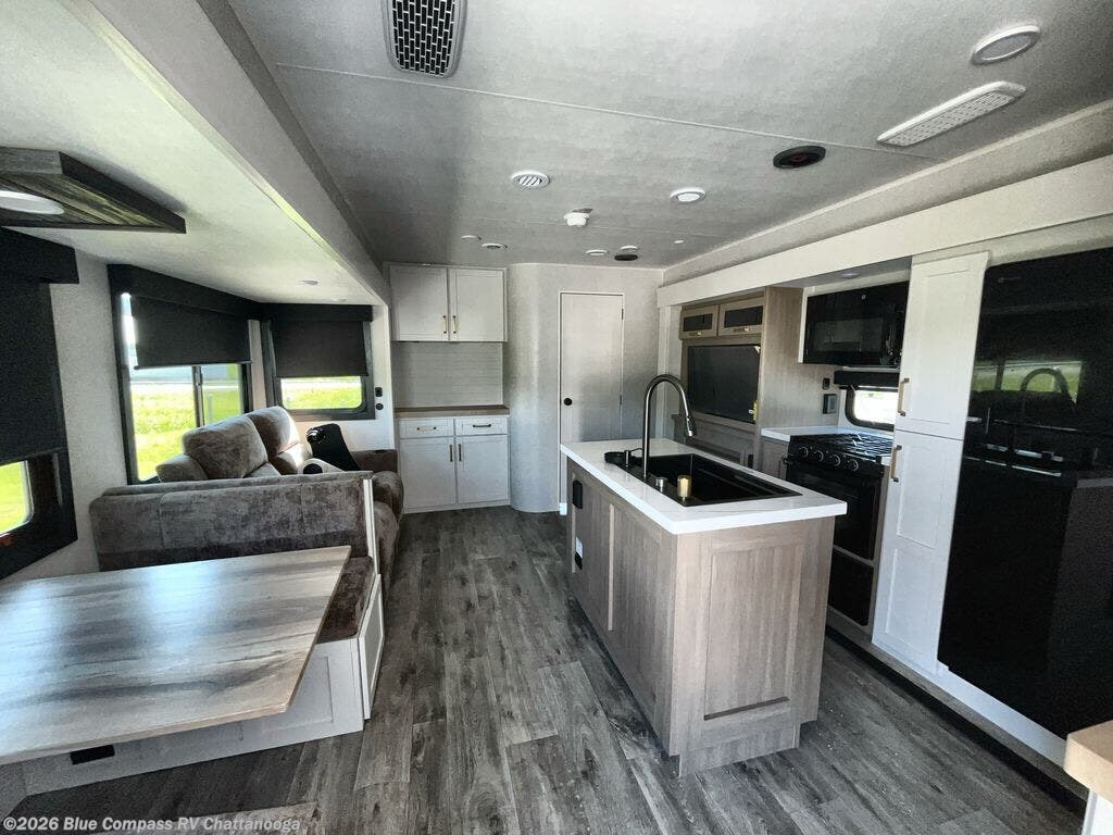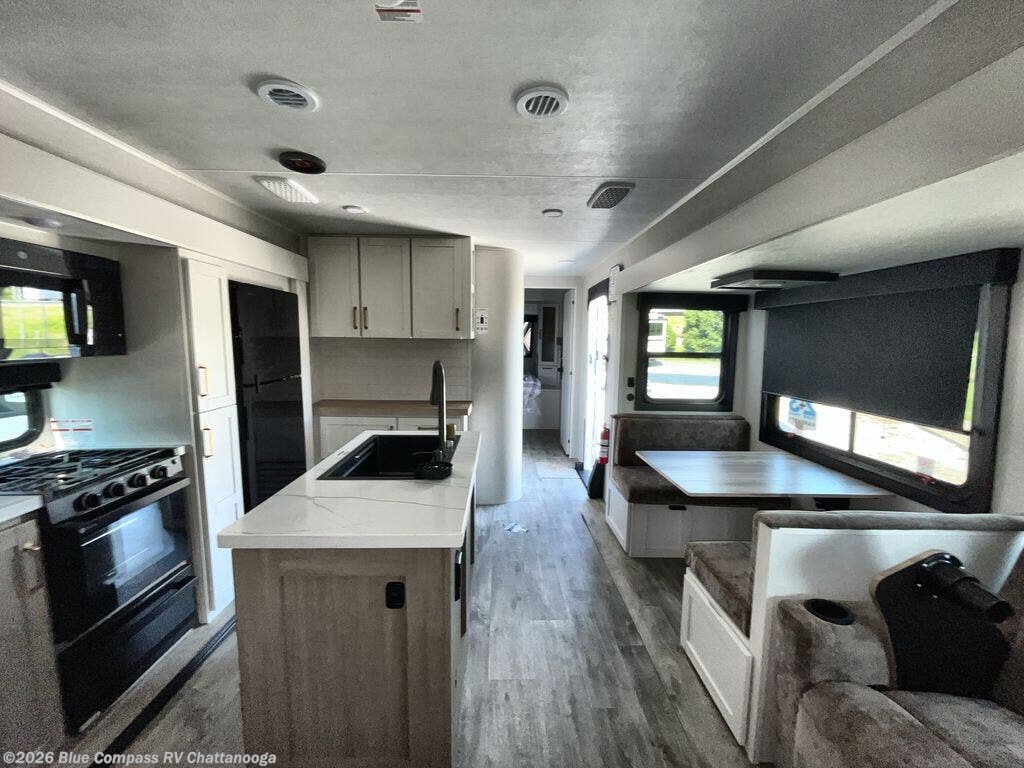 This travel trailer is perfect for your larger group or family! There is a rear private bunkhouse with two bunks, a tri-fold sofa, plus a slide out for more space. You will have the front private bedroom all to yourselves with a queen bed, and any other guests can sleep on the tri-fold sofa and booth dinette! There is also a wardrobe/linen closet with washer and dryer prep if you plan to add a washer and dyer for convenience. The chef can prepare their best meals with the kitchen island and will enjoy having two hutches to store the essentials. They could even cook at the outside kitchen to breathe in some fresh air and enjoy the beautiful scenery!