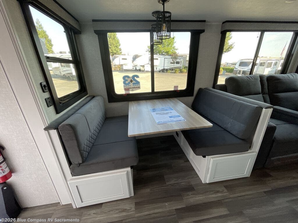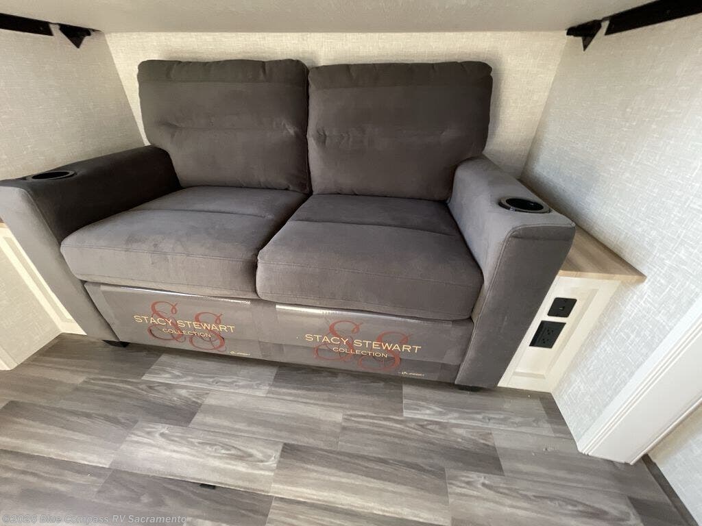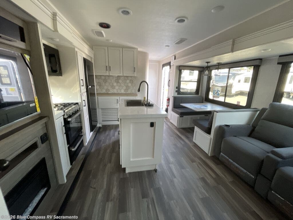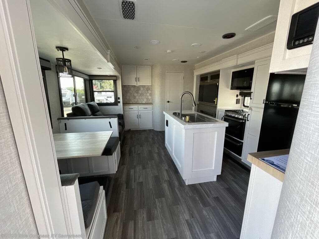 This travel trailer is perfect for your larger group or family! There is a rear private bunkhouse with two bunks, a tri-fold sofa, plus a slide out for more space. You will have the front private bedroom all to yourselves with a queen bed, and any other guests can sleep on the tri-fold sofa and booth dinette! There is also a wardrobe/linen closet with washer and dryer prep if you plan to add a washer and dyer for convenience. The chef can prepare their best meals with the kitchen island and will enjoy having two hutches to store the essentials. They could even cook at the outside kitchen to breathe in some fresh air and enjoy the beautiful scenery!
