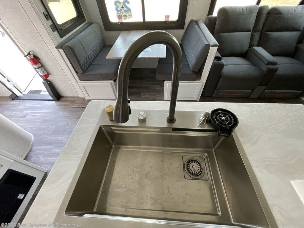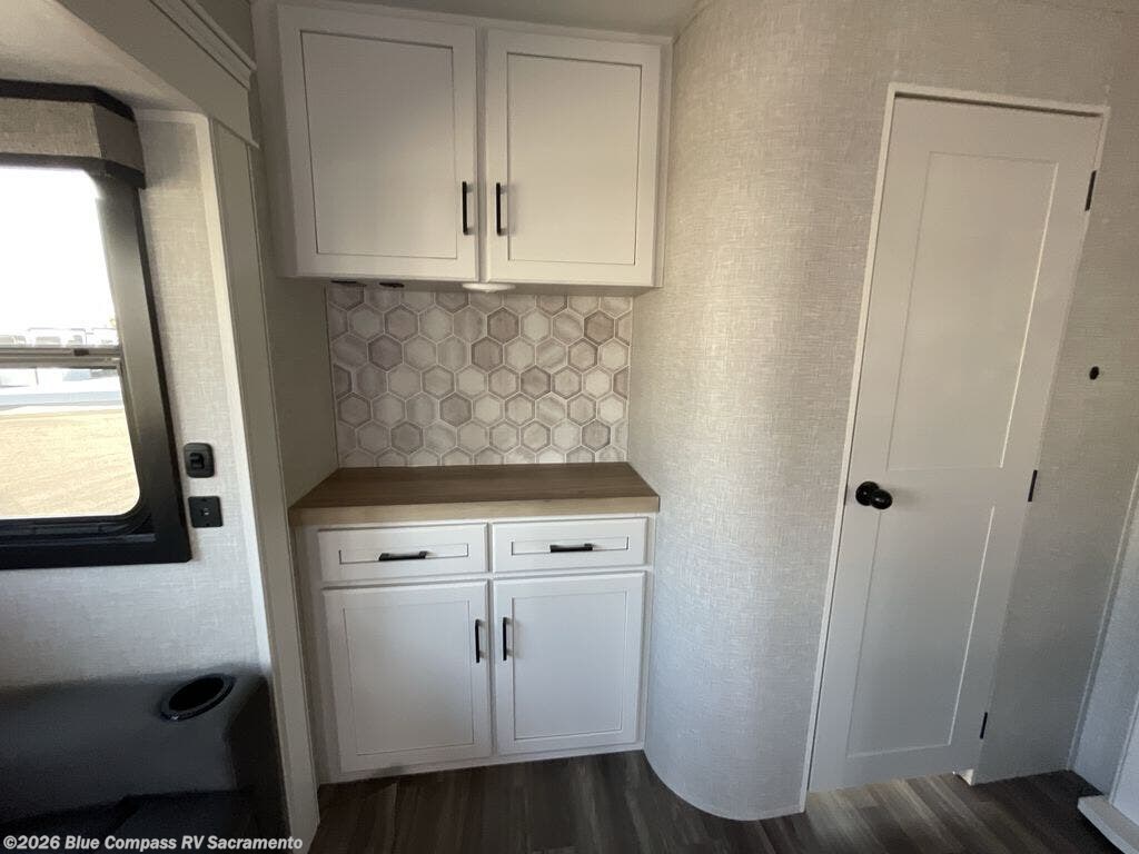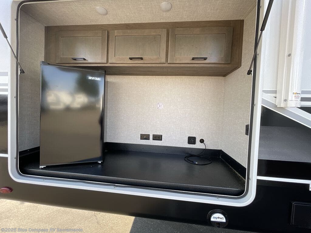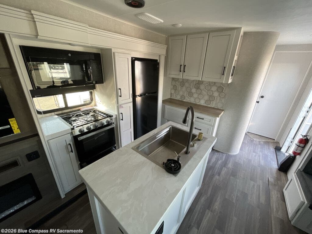 This travel trailer is perfect for your larger group or family! There is a rear private bunkhouse with two bunks, a tri-fold sofa, plus a slide out for more space. You will have the front private bedroom all to yourselves with a queen bed, and any other guests can sleep on the tri-fold sofa and booth dinette! There is also a wardrobe/linen closet with washer and dryer prep if you plan to add a washer and dyer for convenience. The chef can prepare their best meals with the kitchen island and will enjoy having two hutches to store the essentials. They could even cook at the outside kitchen to breathe in some fresh air and enjoy the beautiful scenery!
