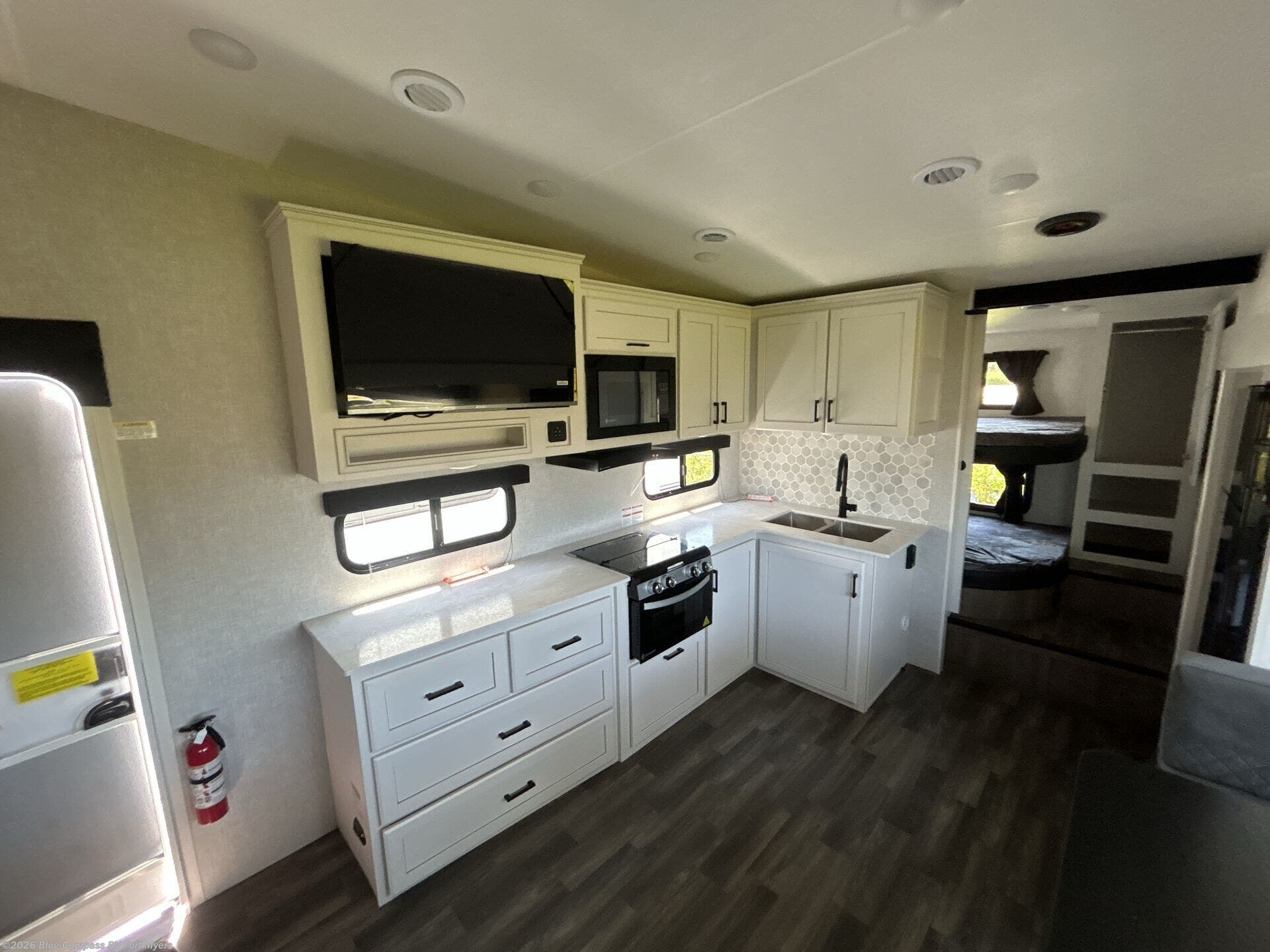If you enjoy camping with a larger group, this fifth wheel is perfect for you! The rear bunkhouse includes double-size bunks, bunk storage and a wardrobe to keep this space tidy. You'll have the front private bedroom all to yourselves with a queen bed, and if you have any other guests, they can sleep on the tri-fold sofa and U-shaped dinette in the main living area. This space is also shared with the full kitchen, complete with a microwave and range, 12V refrigerator, and plenty of overhead cabinets for storage. After dinner, head outdoors to enjoy the 19' power awning with LED lights as you relax in your camp chairs!