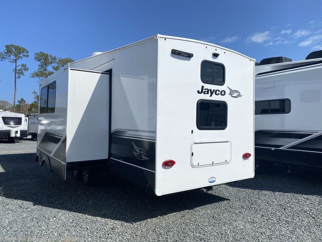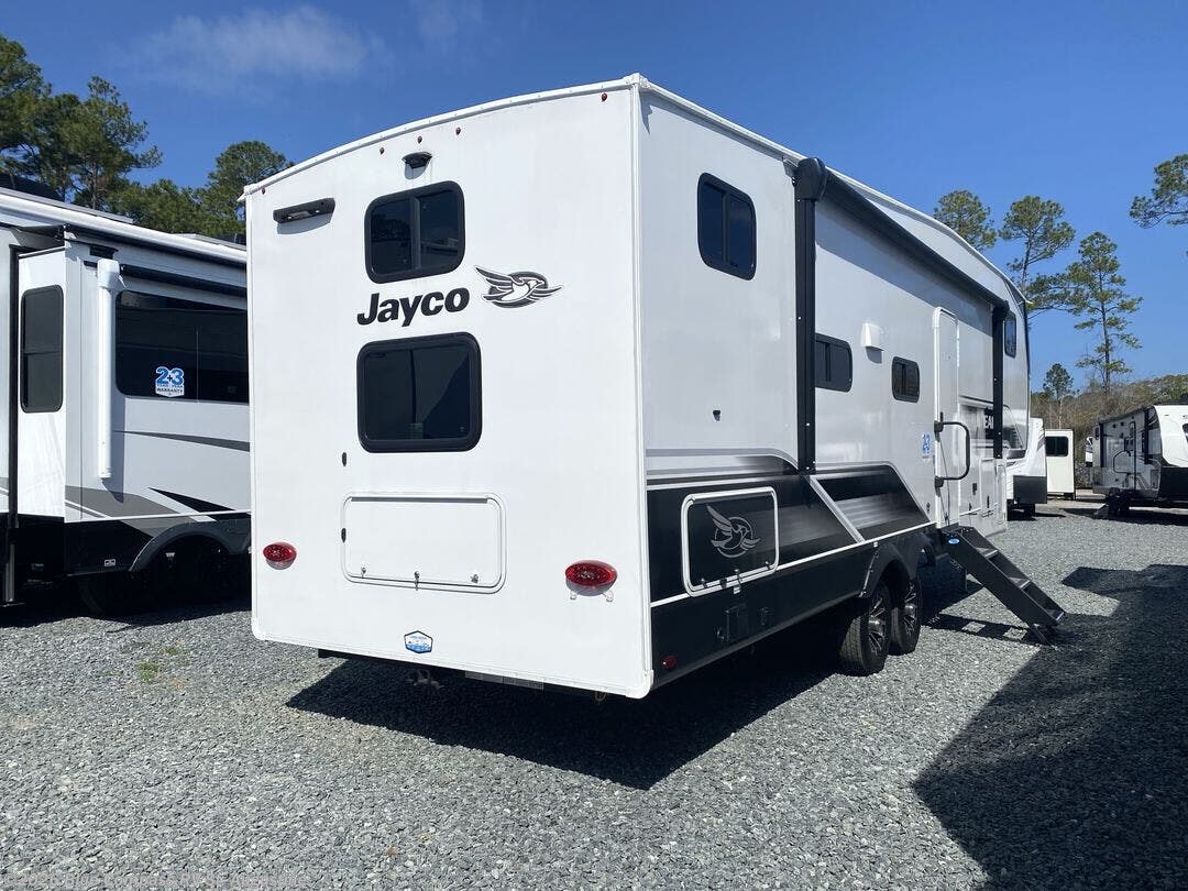 With any Eagle SLE fifth wheel by Jayco, you will enjoy a lighter tow weight, high-end finishes, and the same quality construction you've come to expect from Jayco! There is an Alpha Ply TPO roof membrane, a fully enclosed and heated underbelly, plus Stronghold VBL walls for added durability. There is also a rear 2" towing receiver outside, along with metal slam latch baggage doors, MORryde Step Above entry steps, and a Winegard Air 360 antenna with router prep if you want to stay connected as you camp. Once inside you'll enjoy the handcrafted and glazed door/drawer fronts, blackout pleated shades throughout, and residential vinyl flooring throughout with no carpet for an easier clean. The on-demand water heater, 30K BTU furnace, and 15K BTU "Whisper Quiet" A/C will ensure your comfort year around, and the optional Overland 1 Solar Package can be added if you need off-grid capabilities!