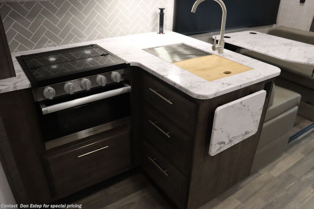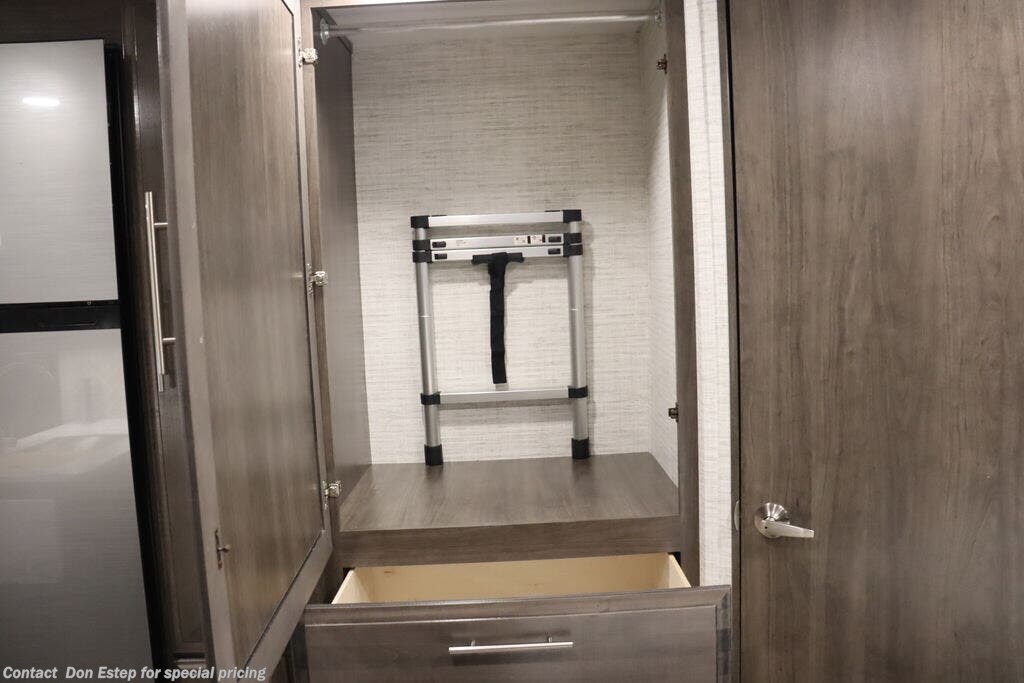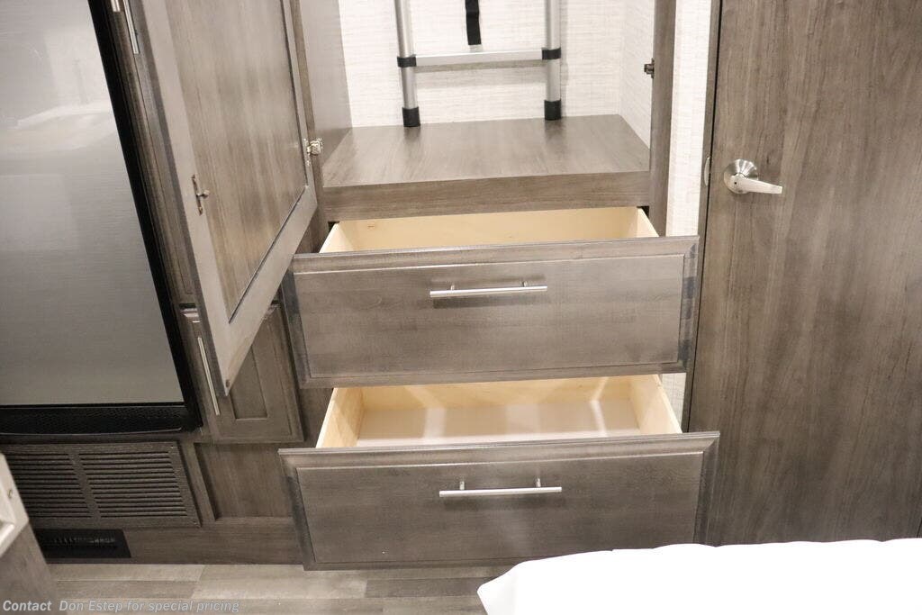 Inside, you can relax on your walk-around queen-size bed, while you charge your devices on the wireless charging pads or with the USB ports in the nightstands. The Jayco-exclusive, easy-operation legless dinette table, with safety belts and car seat tethers, easily moves from the dinette to bed position, and the sturdy table doesn’t sag under pressure during meals or family game night. The large rotocast exterior storage compartments are durable and super easy to clean—just spray them out with a hose.