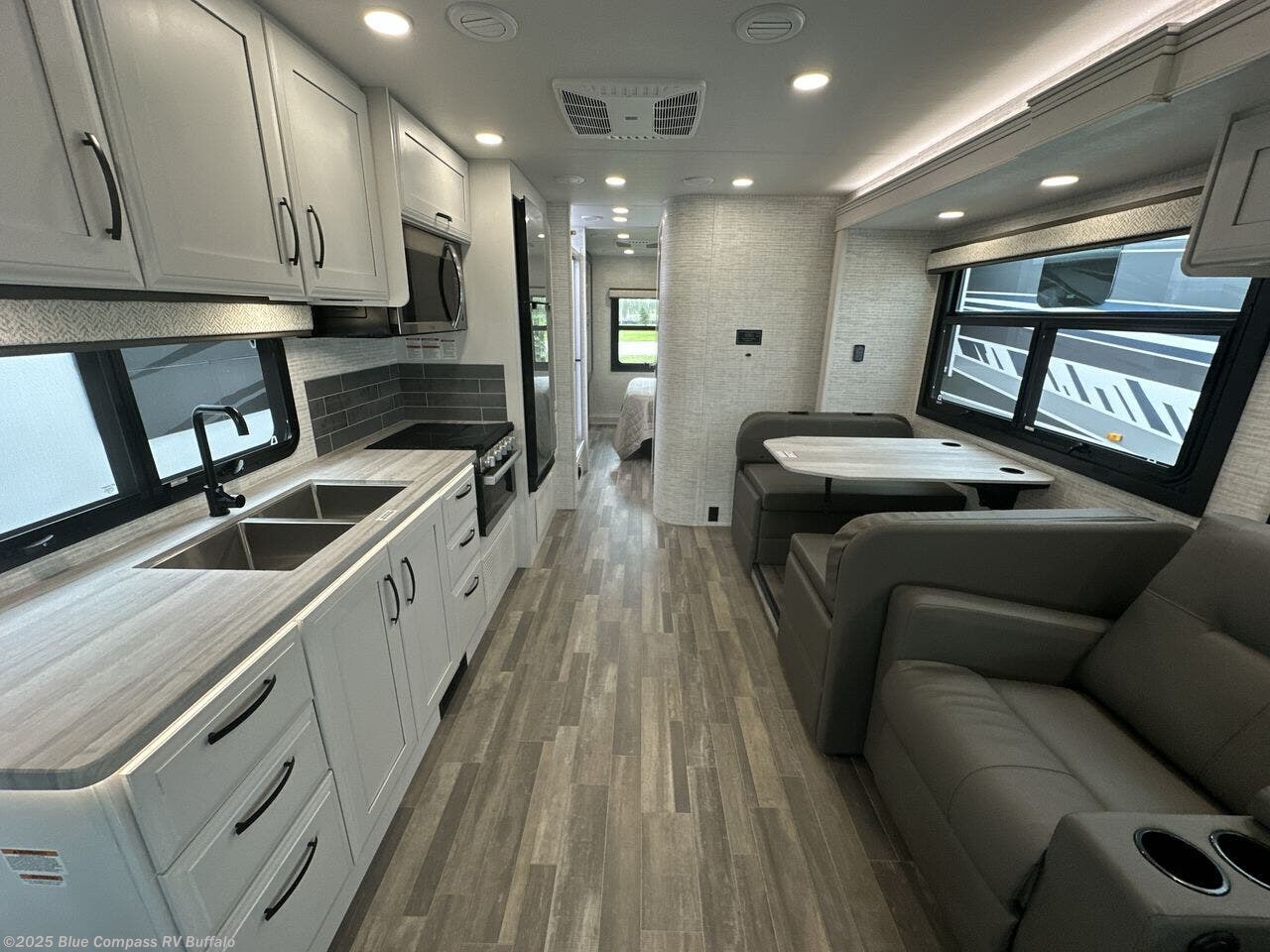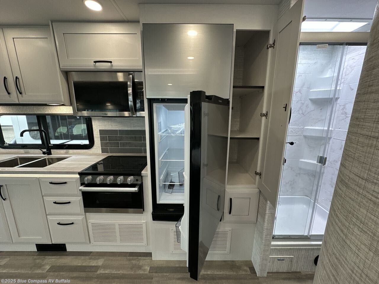 This motorhome includes double slides so you can enjoy more interior space, just like at home! The 42" x 70" booth dinette and 60" tri-fold sofa are in great view of the LED HD Smart TV, and your guests can sleep here, as well as on the cab-over bunk. This Greyhawk kitchen includes a Furrion all-in-one cooktop and oven, a residential-size microwave, and a pantry to store dry goods. You will find a convenient 30" x 36" shower, with the private toilet and sink across the hall so two people can freshen up at once. And don't overlook the rear bedroom with its queen bed slide out, dual bedroom wardrobes, and cabinet!