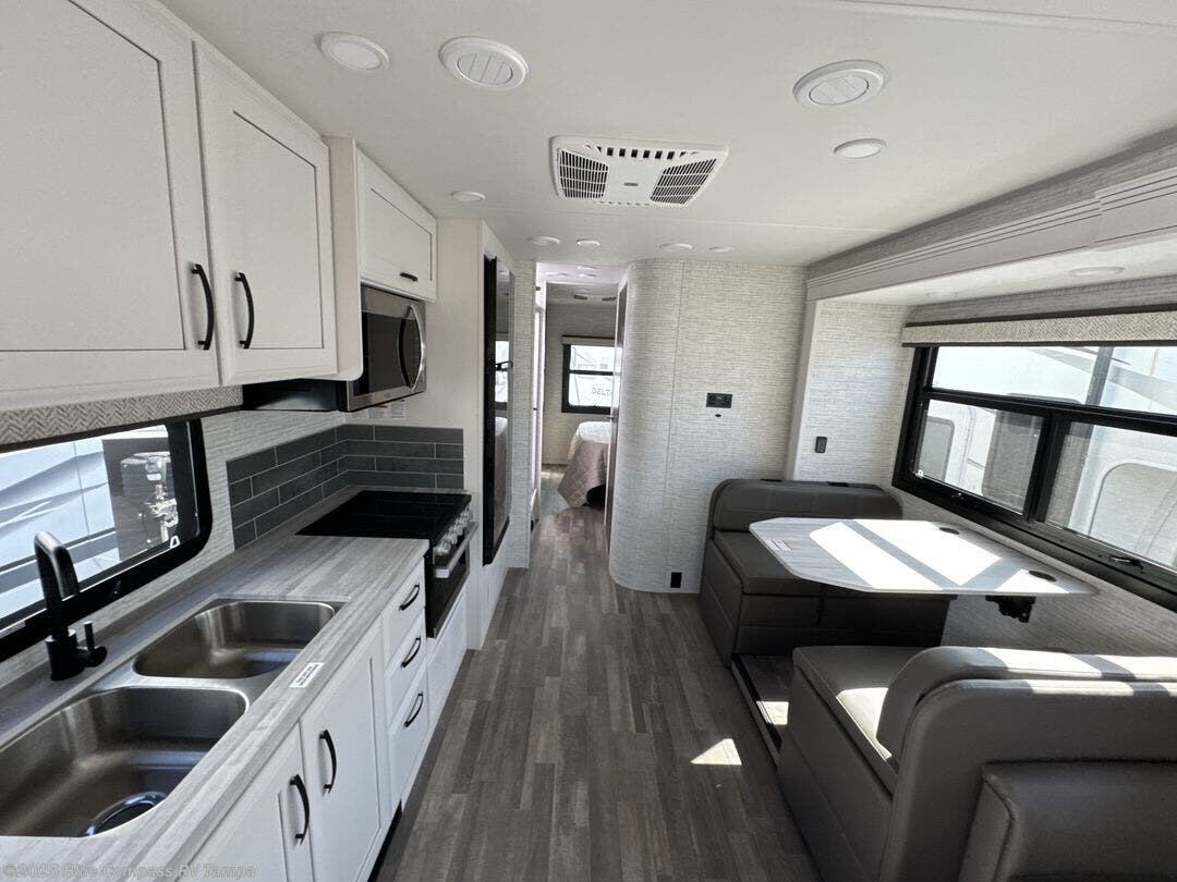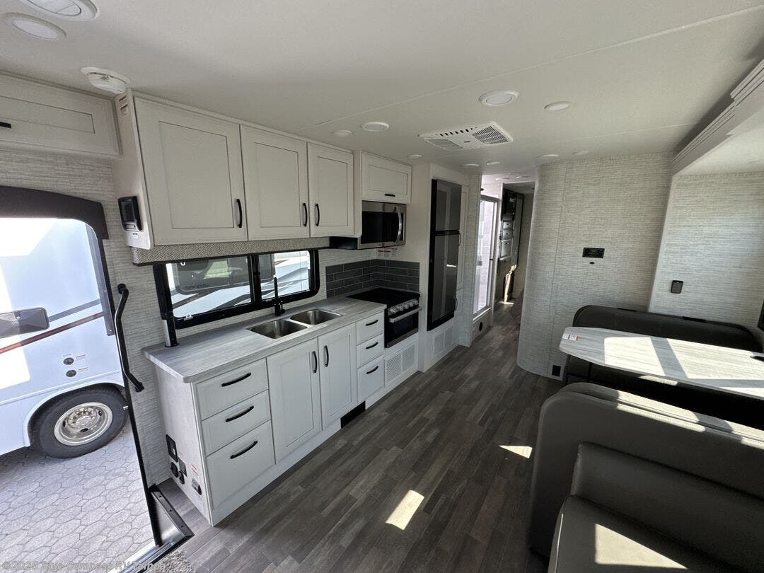 This motorhome includes double slides so you can enjoy more interior space, just like at home! The 42" x 70" booth dinette and 60" tri-fold sofa are in great view of the LED HD Smart TV, and your guests can sleep here, as well as on the cab-over bunk. This Greyhawk kitchen includes a Furrion all-in-one cooktop and oven, a residential-size microwave, and a pantry to store dry goods. You will find a convenient 30" x 36" shower, with the private toilet and sink across the hall so two people can freshen up at once. And don't overlook the rear bedroom with its queen bed slide out, dual bedroom wardrobes, and cabinet!
