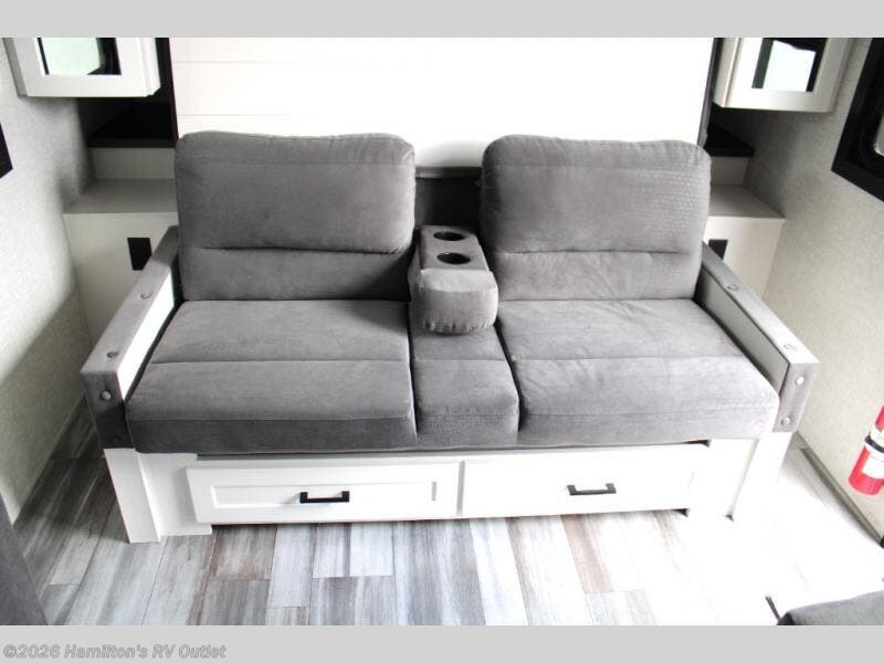 If you wish to escape the hustle and bustle of everyday life then you need this travel trailer! It features a front 60" x 75" Murphy bed with wardrobes on either side for bedtime and a jackknife sofa during the day. You can play games at the booth dinette after enjoying a delicious meal prepared with the three burner cooktop or relax at the theater seating with table trays and enjoy the LED TV. The rear corner bathroom has a shower with a skylight for you to get cleaned up in, as well as a linen closet to store your towels. There is exterior storage space to keep your outdoor gear, a 15' power awning to protect you from the elements.