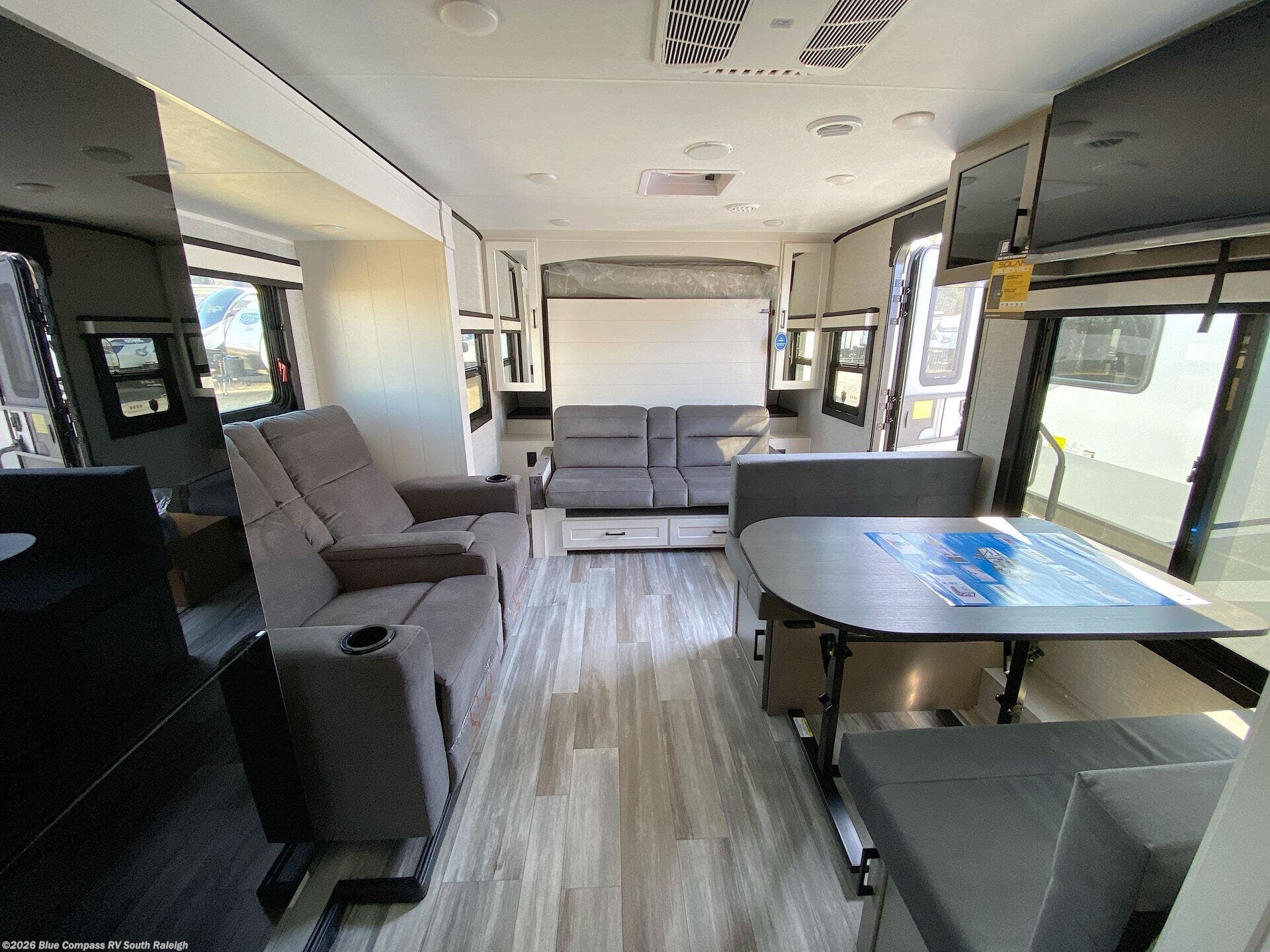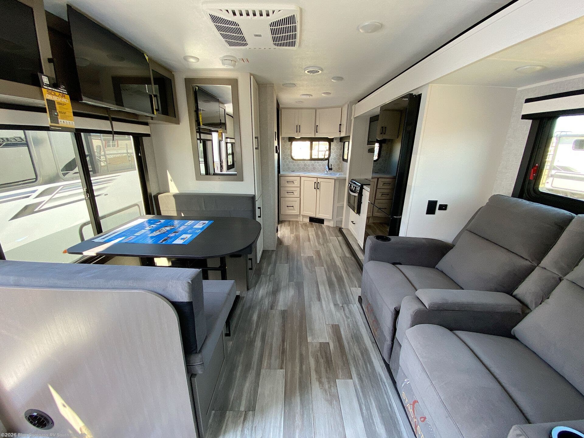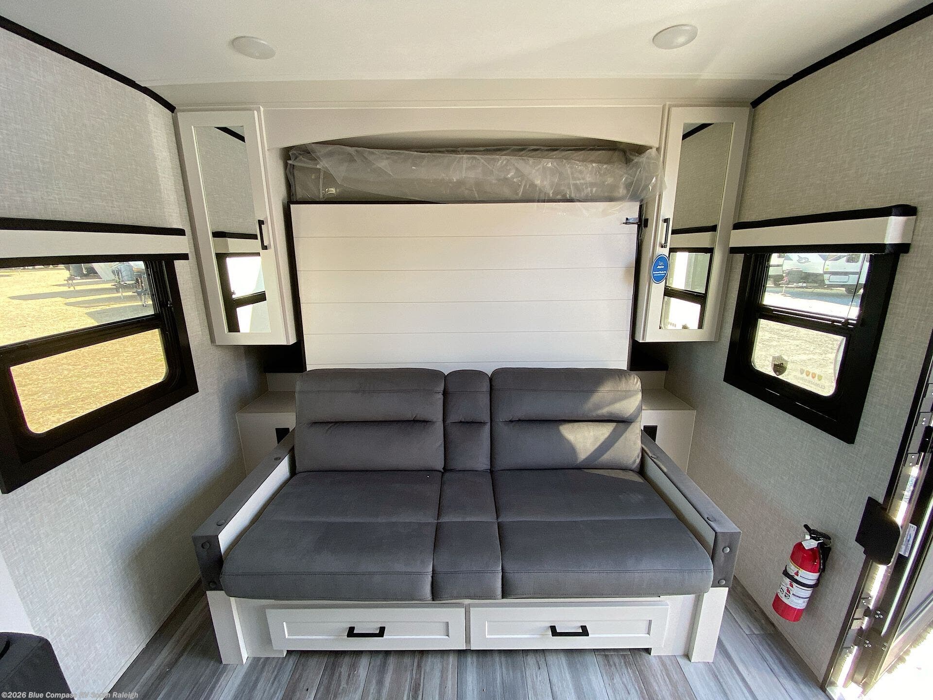 If you wish to escape the hustle and bustle of everyday life then you need this travel trailer! It features a front 60" x 75" Murphy bed with wardrobes on either side for bedtime and a jackknife sofa during the day. You can play games at the booth dinette after enjoying a delicious meal prepared with the three burner cooktop or relax at the theater seating with table trays and enjoy the LED TV. The rear corner bathroom has a shower with a skylight for you to get cleaned up in, as well as a linen closet to store your towels. There is exterior storage space to keep your outdoor gear, a 15' power awning to protect you from the elements.