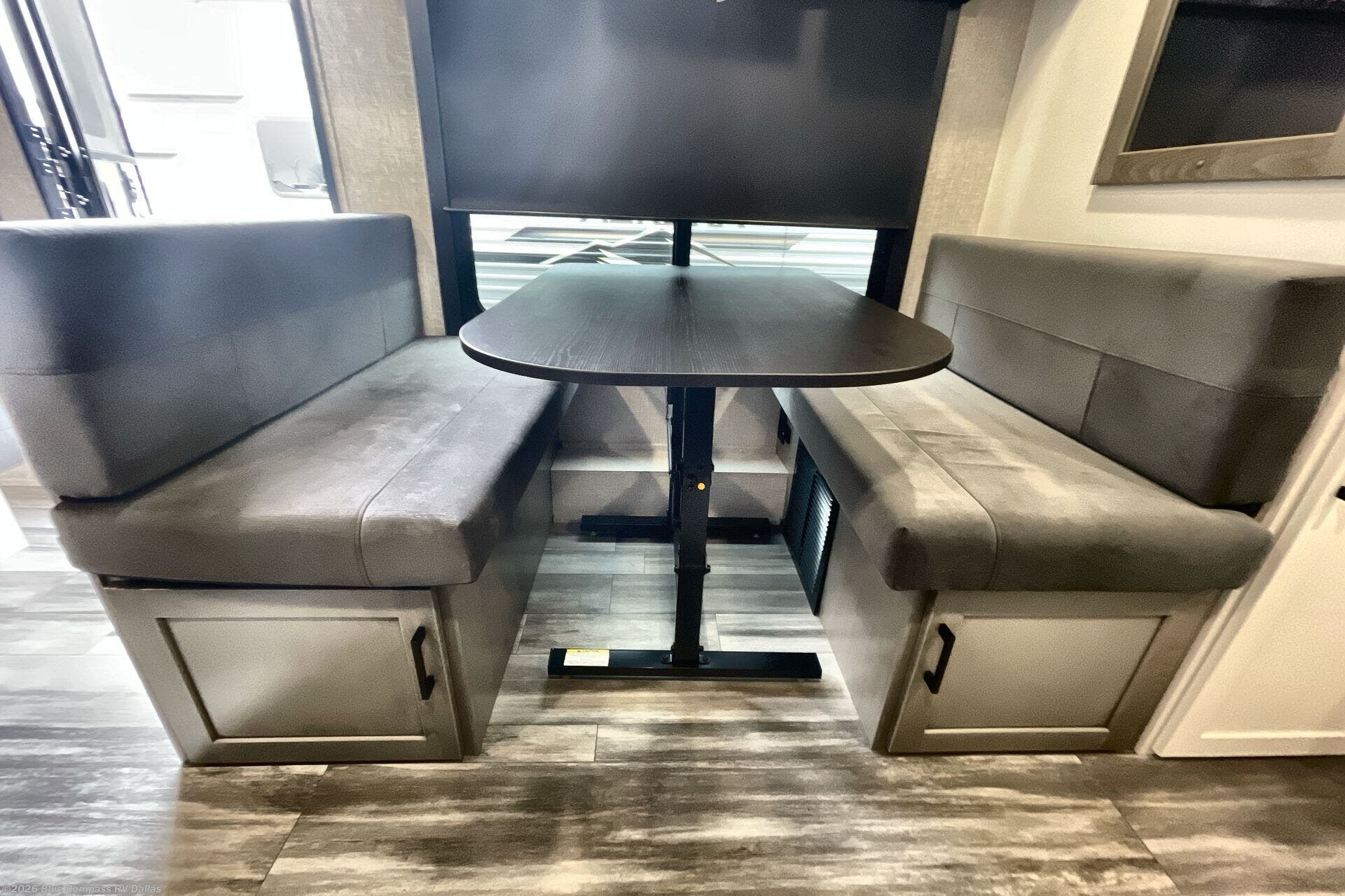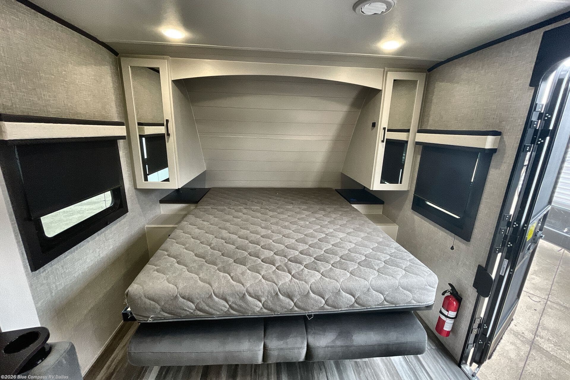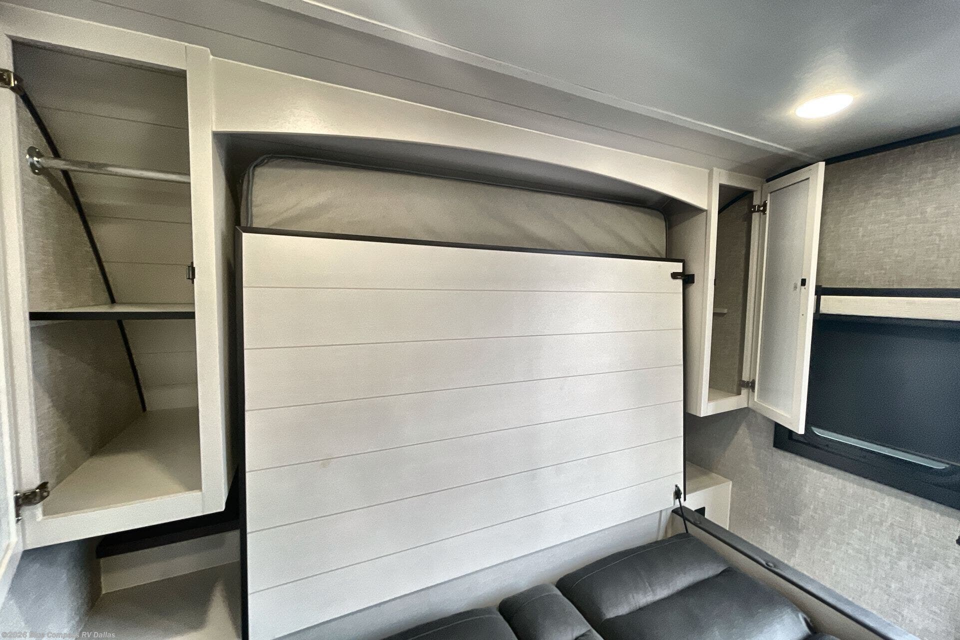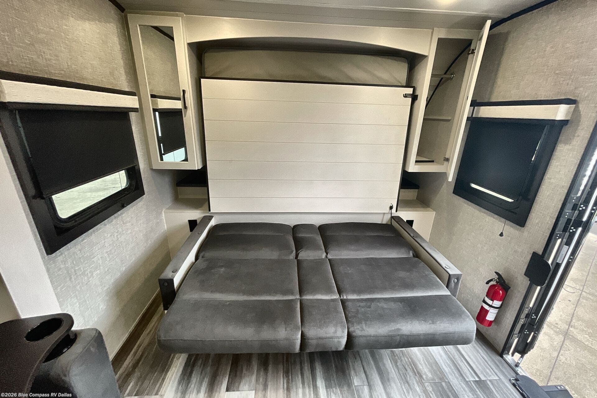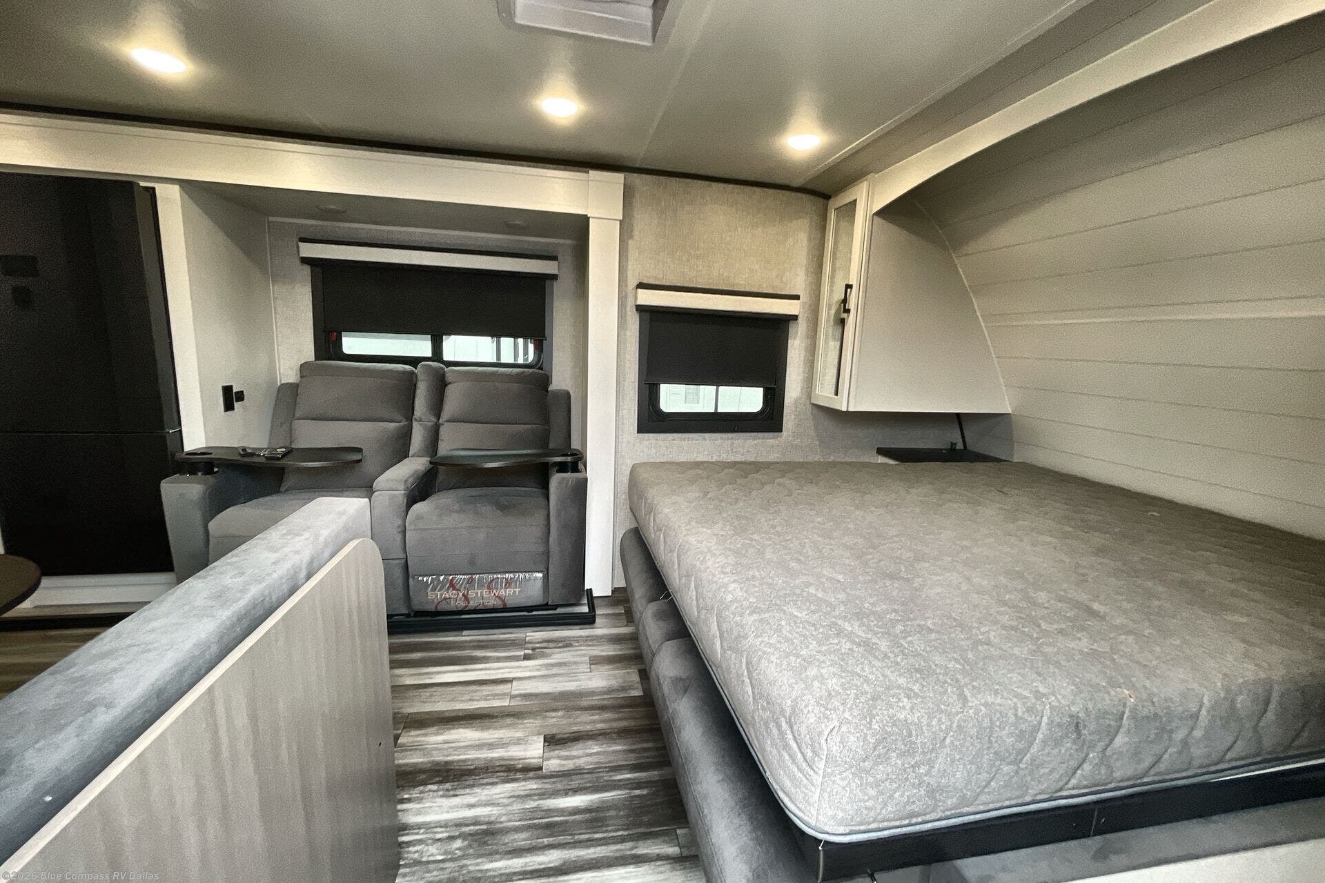 If you wish to escape the hustle and bustle of everyday life then you need this travel trailer! It features a front 60" x 75" Murphy bed with wardrobes on either side for bedtime and a jackknife sofa during the day. You can play games at the booth dinette after enjoying a delicious meal prepared with the three burner cooktop or relax at the theater seating with table trays and enjoy the LED TV. The rear corner bathroom has a shower with a skylight for you to get cleaned up in, as well as a linen closet to store your towels. There is exterior storage space to keep your outdoor gear, a 15' power awning to protect you from the elements.