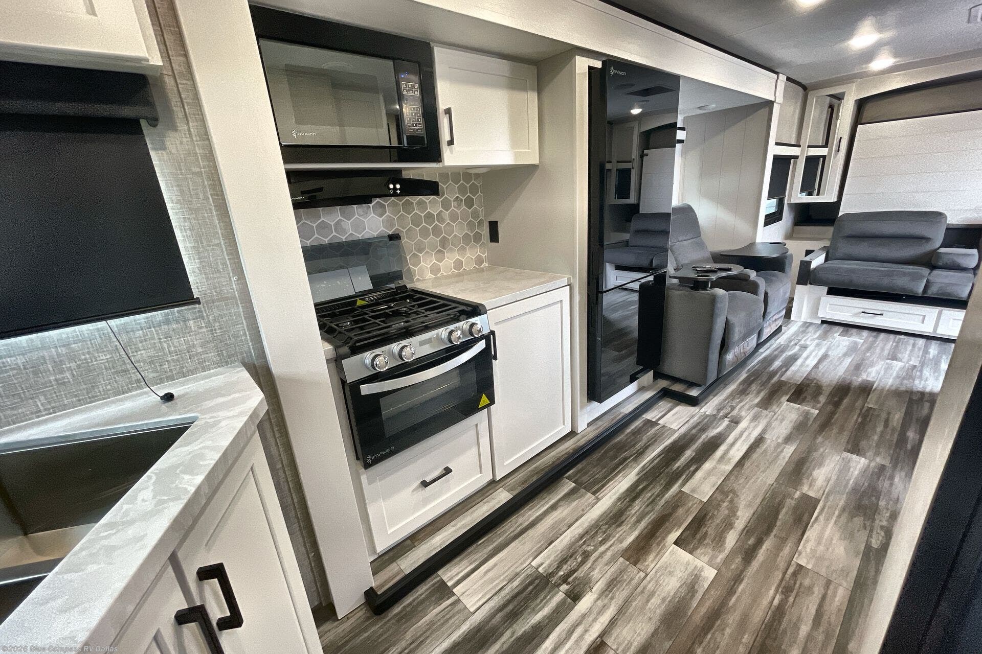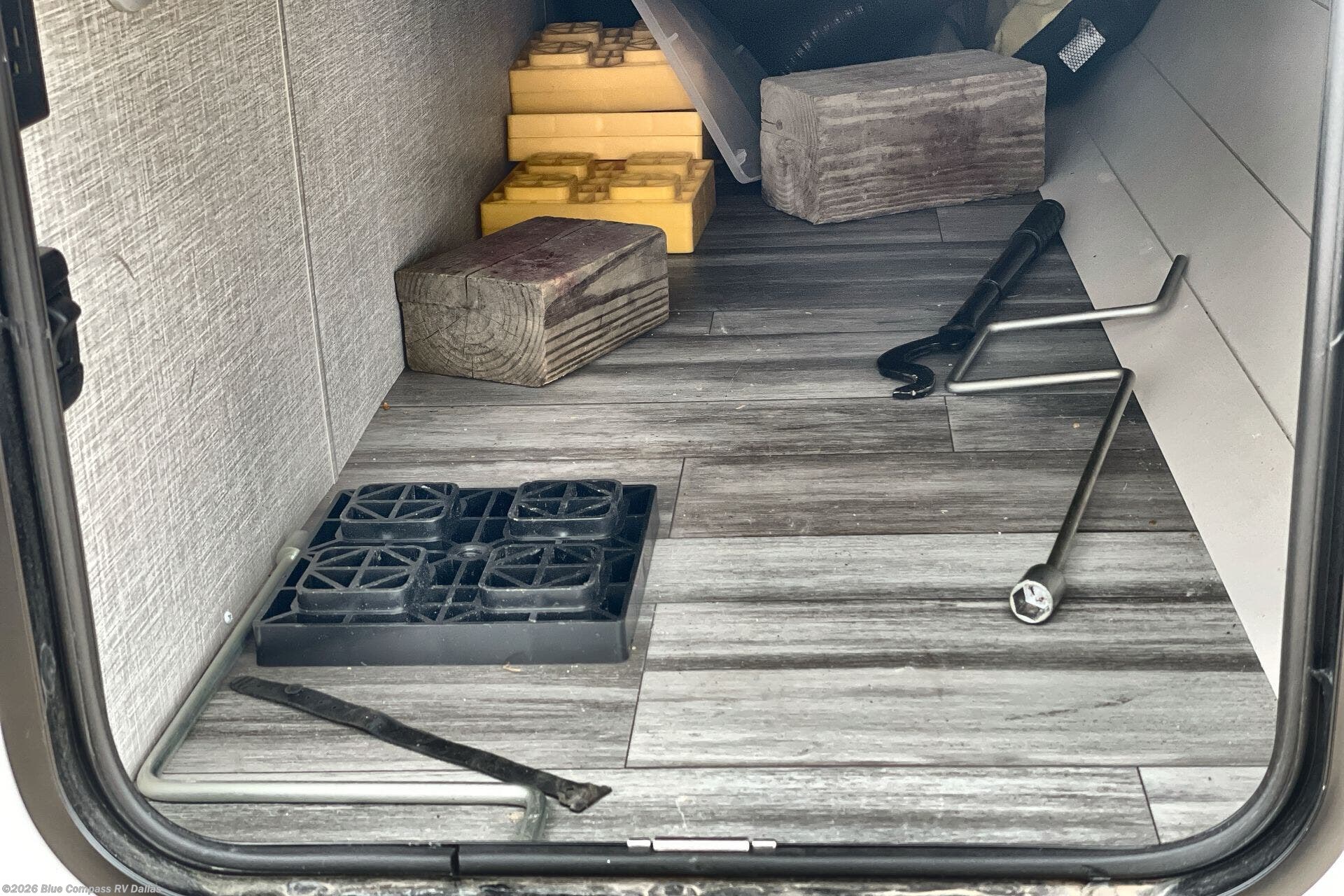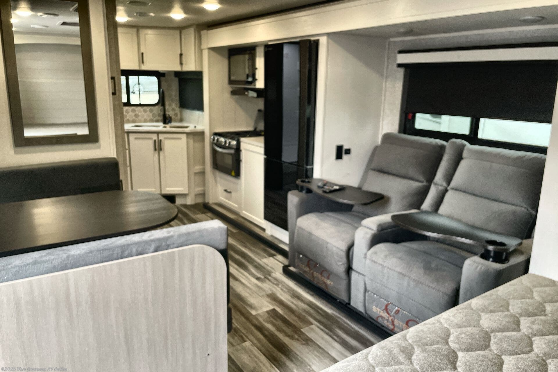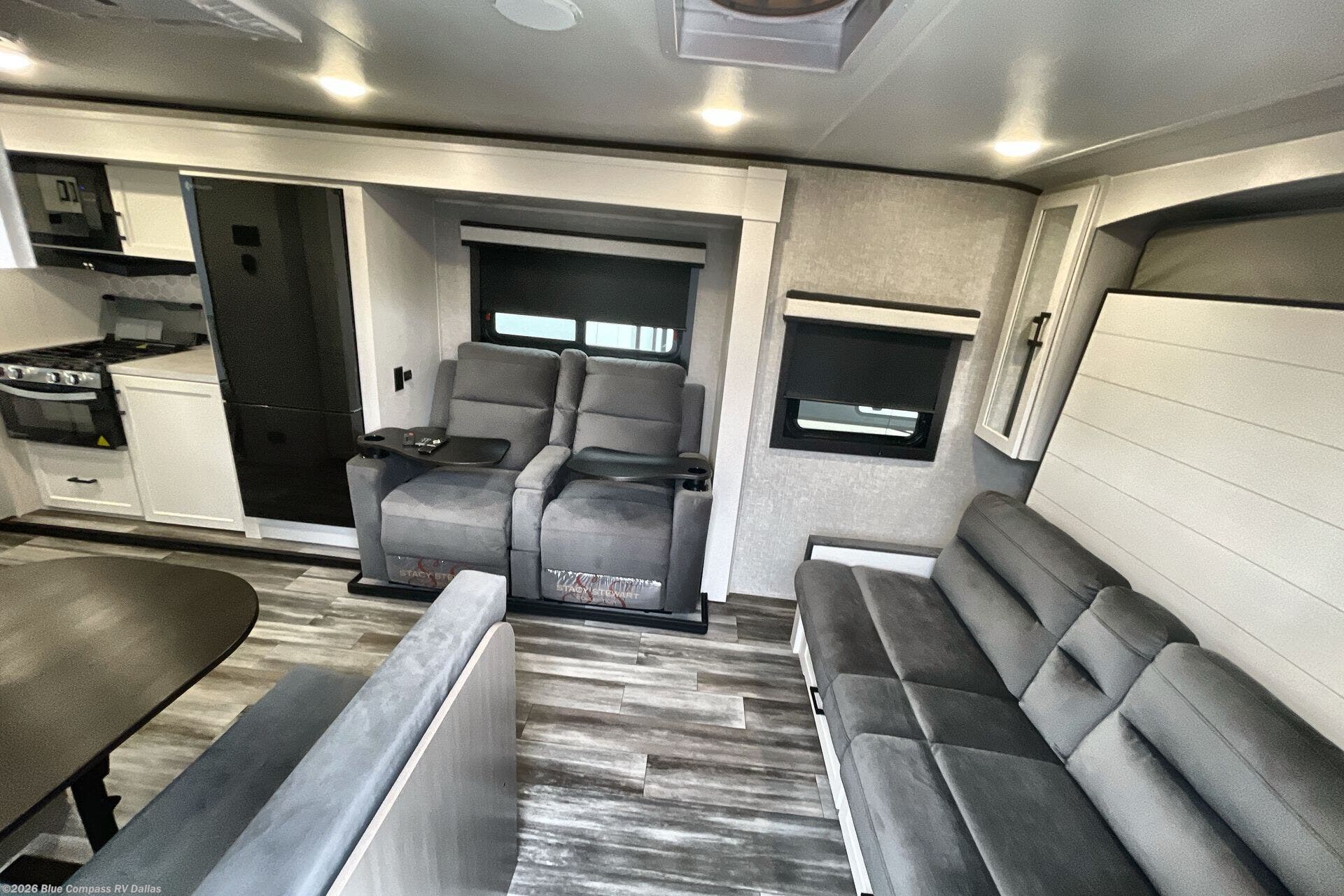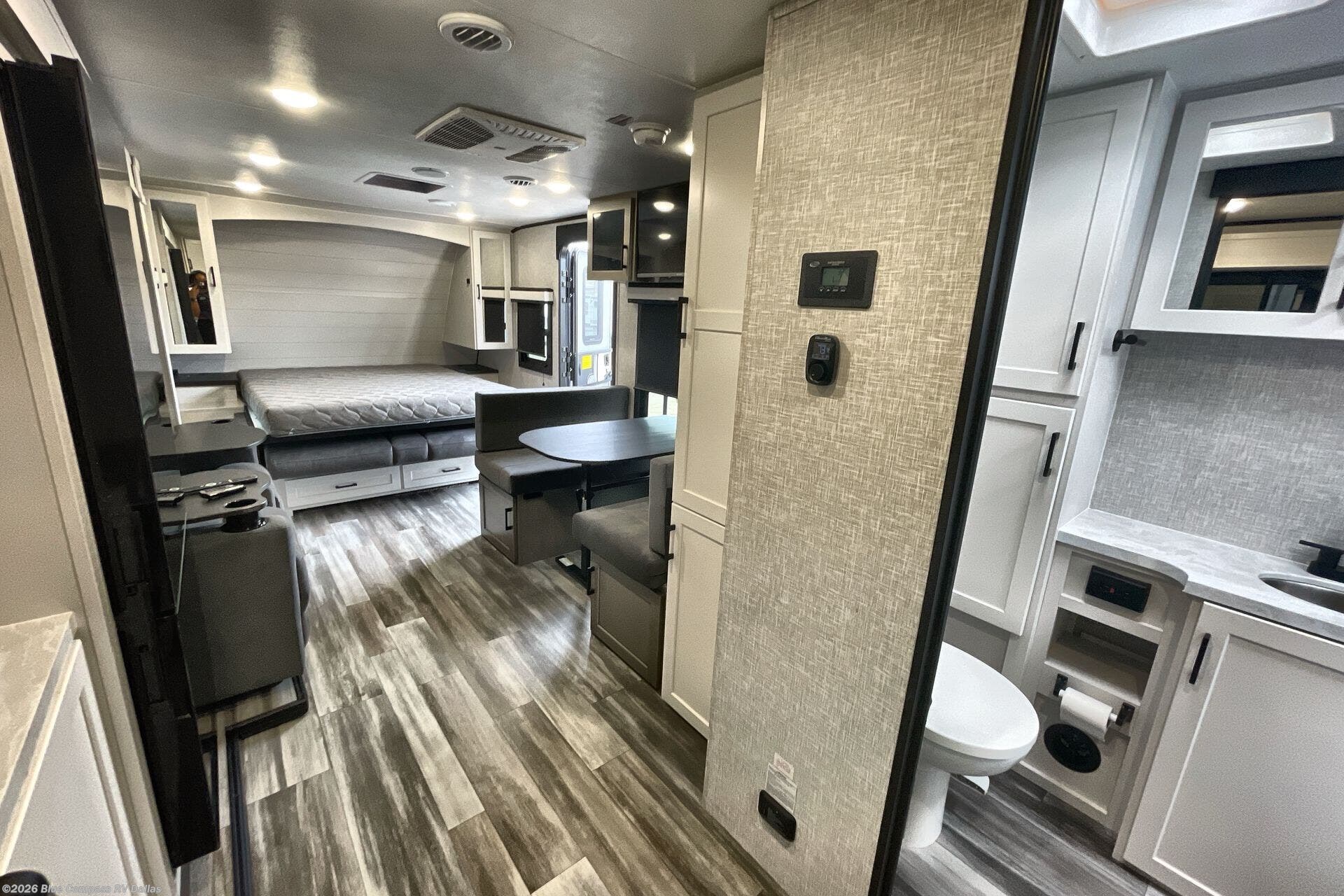 If you wish to escape the hustle and bustle of everyday life then you need this travel trailer! It features a front 60" x 75" Murphy bed with wardrobes on either side for bedtime and a jackknife sofa during the day. You can play games at the booth dinette after enjoying a delicious meal prepared with the three burner cooktop or relax at the theater seating with table trays and enjoy the LED TV. The rear corner bathroom has a shower with a skylight for you to get cleaned up in, as well as a linen closet to store your towels. There is exterior storage space to keep your outdoor gear, a 15' power awning to protect you from the elements.