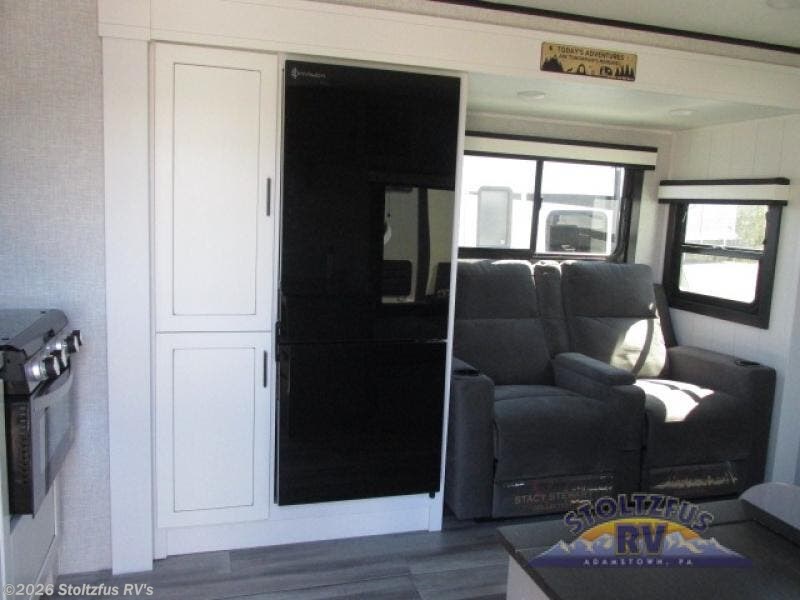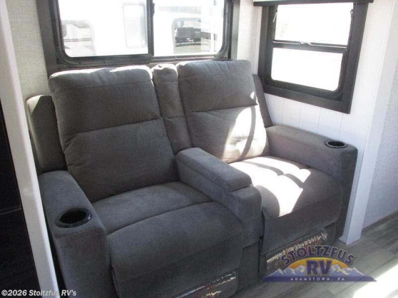 The chef of your group will love this rear kitchen trailer with generous counter space to prep meals! Your crew can dine at the booth dinette or under the 20' power awning with LED lights, and when you're ready to relax, the theater seat with table trays will provide comfort. There is also a storage/desk cabinet with a pull-out ottoman that will allow you to utilize this space however you need it! The spacious full bath will let you clean up each day, and the front private bedroom is sure to make you feel at home. Here, you'll find a queen bed, three wardrobes, plus one of the dual entry doors for added convenience!