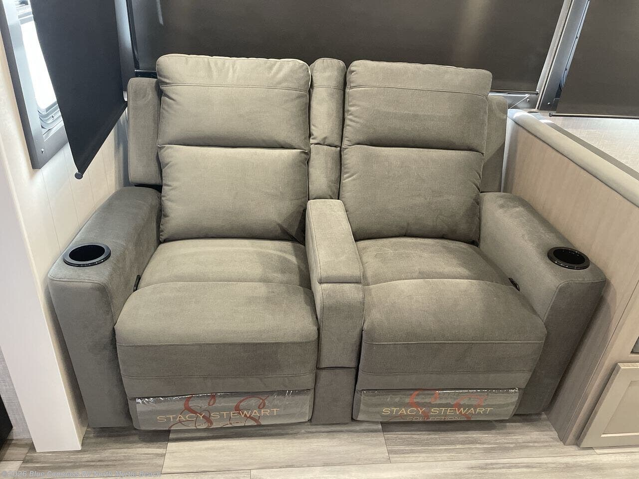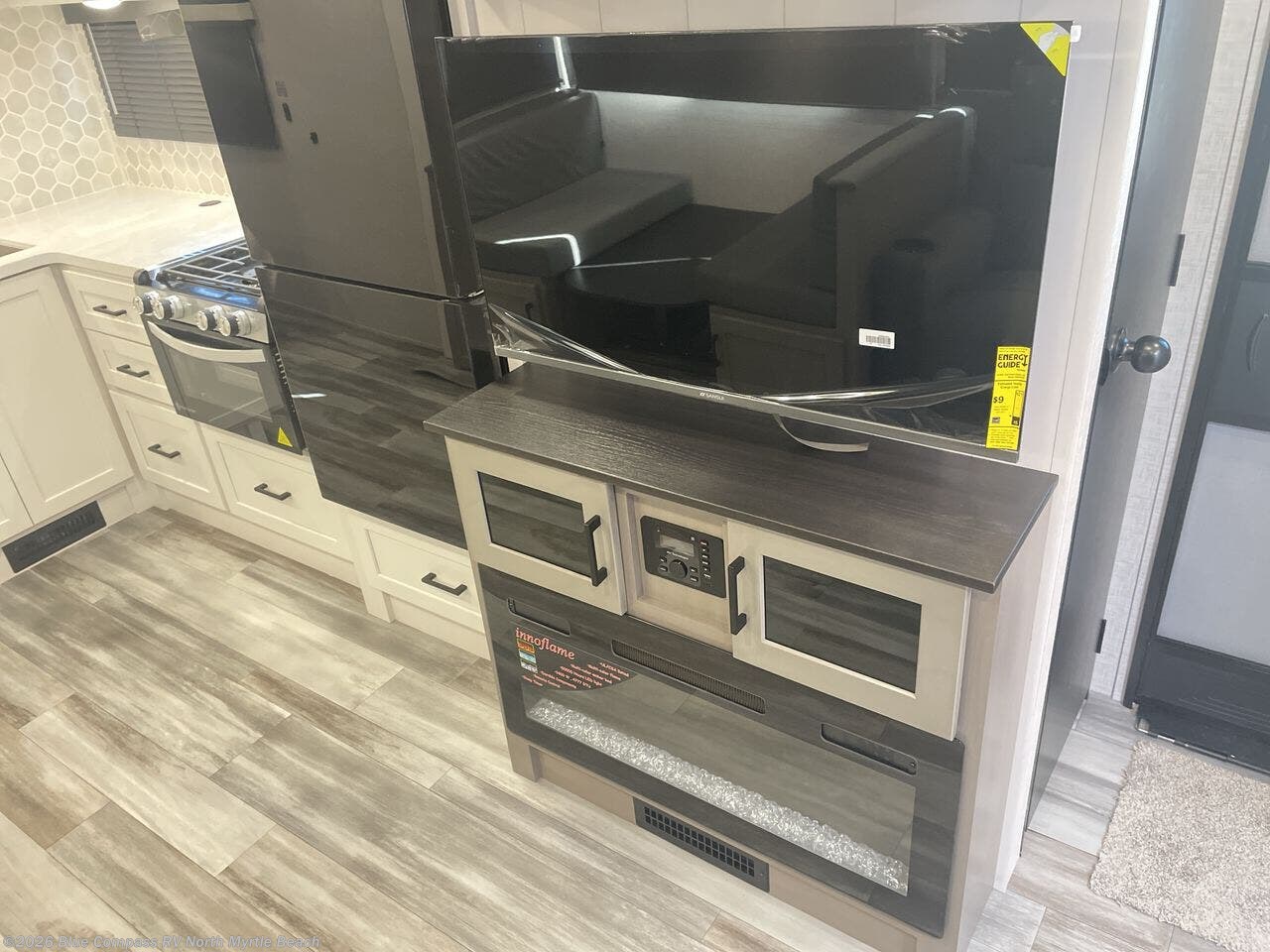This travel trailer with a full rear bath is sure to bring you comfort wherever you camp. The front private bedroom with queen bed and dual wardrobes will have you feeling right at home. You can enjoy home cooked meals while at the campsite thanks to the three burner cooktop and 11 cu. ft. 12V refrigerator, plus there is a walk-in pantry to store all of your favorite snacks. The tri-fold sofa and booth dinette within the slide out offer comfortable places to relax. You can even cook breakfast outdoors using the outside kitchen and stay protected from the elements by the 19' power awning!