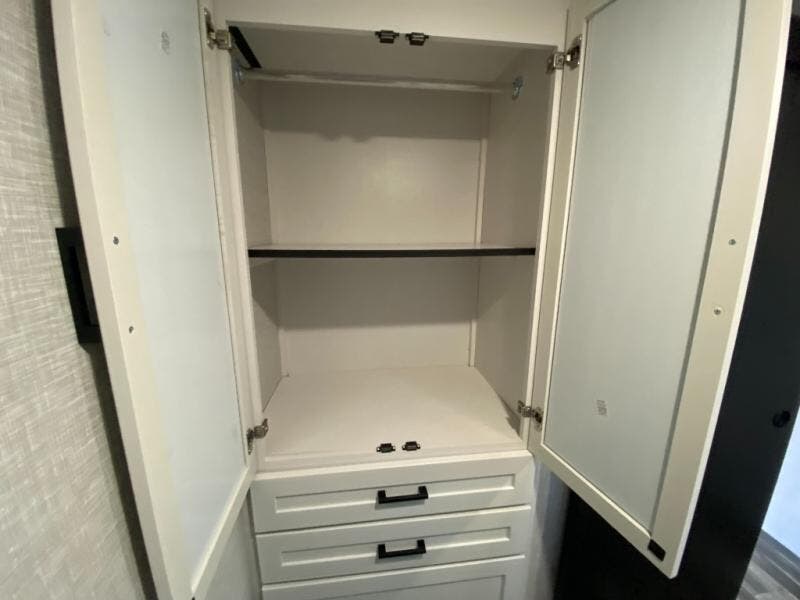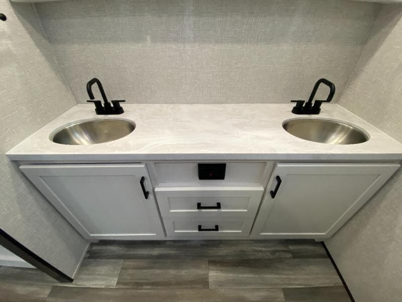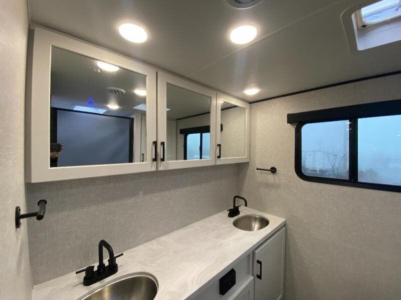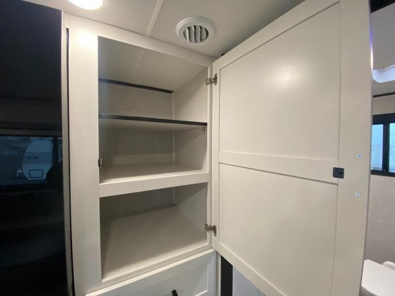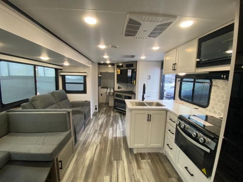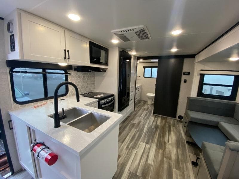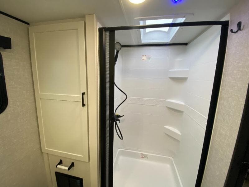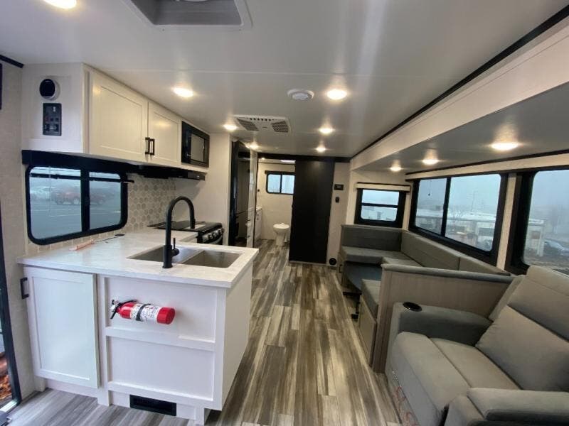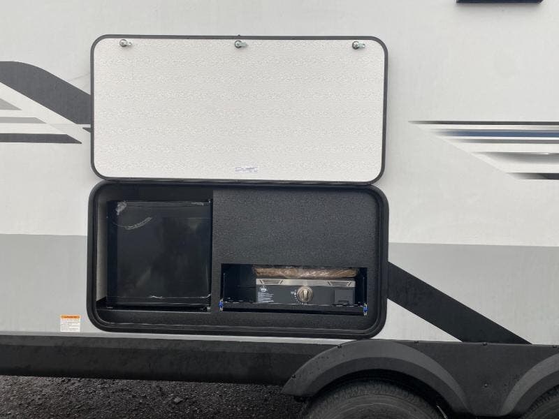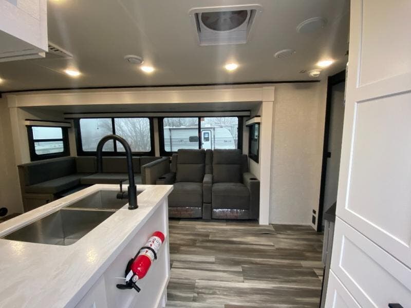 It won't be hard to find comfort in this spacious travel trailer! The large slide out in the main living area will provide more floor space to let the dog nap on the floor and let the cook whip up dinner in the kitchen. There is a tri-fold sofa and U-shaped dinette that will be perfect for meals times, relaxing, and extra sleeping space. This unit includes a full rear bath with dual bath sinks, a linen closet, plus a shower with a seat for added comfort. The front private bedroom includes a queen bed, dual nightstands, and a bedroom closet to keep your space tidy. Head outdoors to visit under the 20' awning, grab your fishing poles from the exterior storage, or fill the dogs water bowl with the external shower!