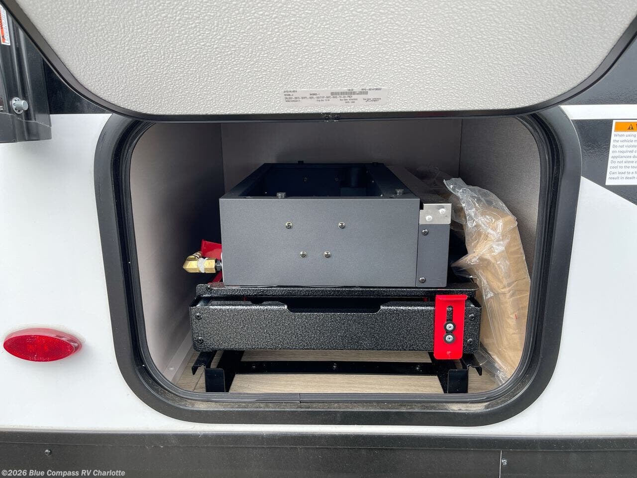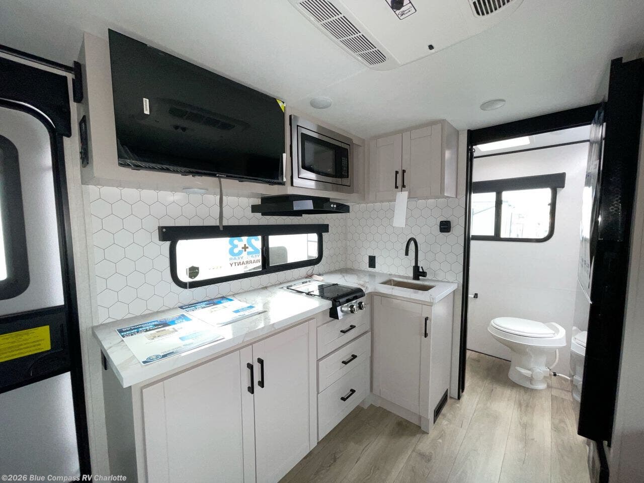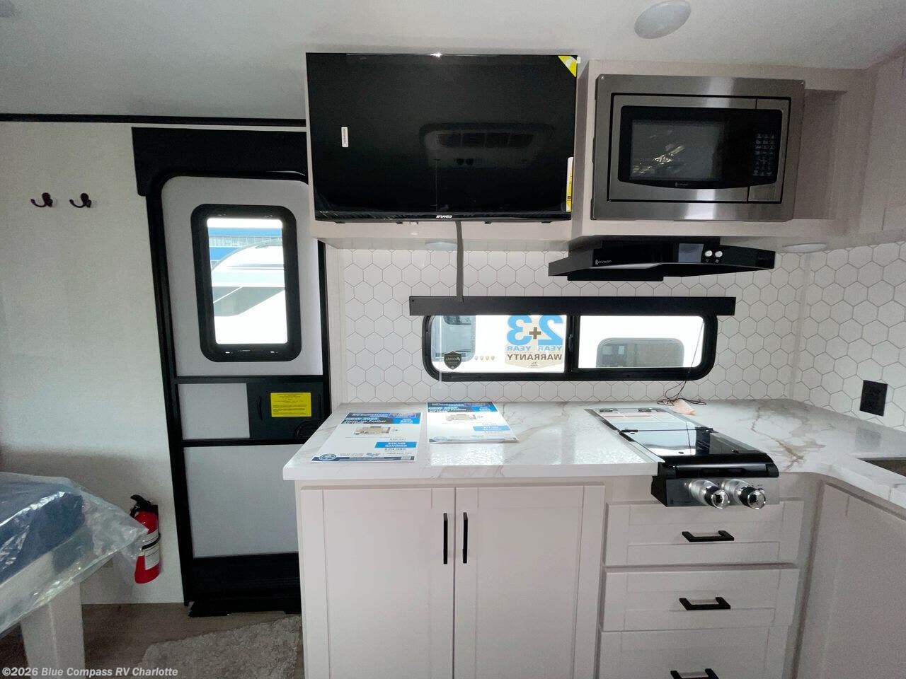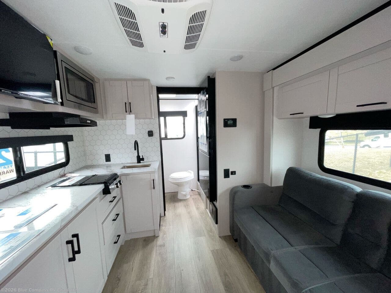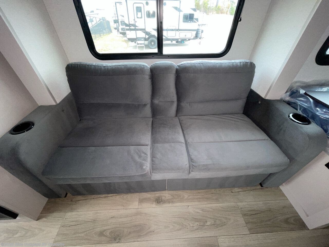 This travel trailer will feel just like home with its front queen bed, full rear bath, and fully-equipped kitchen! There is a jack-knife sofa slide out where you can relax each day, and there are swivel tables so you can enjoy meals here too. The LED Smart TV will let you stay in and watch movies if the weather isn't cooperating, or you can grab the fishing gear from the outside storage and weather the storm! You'll also find plenty of interior storage in the multiple overhead cabinets and the bath medicine cabinet!