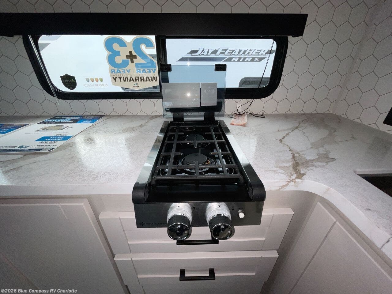 With any Jay Feather Air travel trailer by Jayco, you will enjoy lightweight towing and a variety of features to make each camping trip count! The Climate Shield insulation system helps extend your camping season by keeping you comfortable even in extreme weather conditions, and the Rock Solid stabilizer system means set up will be a breeze. An 18" rear roof ladder lets you easily clean the top of your Magnum Truss roof, and the 2" receiver will be perfect for your bike rack. The Overland 1 Solar Package with a 200W solar panel and 30-amp controller will provide off-grid capabilities, or you can can choose the optional Overland 2 Solar Package with two panels instead! Each Jay Feather Air includes residential-style seamless countertops inside, along with stainless steel sinks, decorative backsplash, and decorative roller shades with a reflective barrier to help keep the sun's rays out.