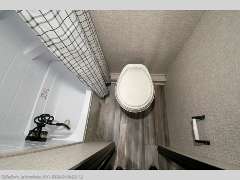 Modern Amenities: Equipped with a 13,500 BTU roof-mounted air conditioner, tankless water heater, and a 5 cu. ft. 12V refrigerator for added convenience.