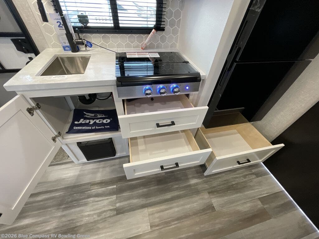 This cozy travel trailer is the perfect couple's trailer with space for an overnight guest on the jack-knife sofa with swivel tables. You'll sleep soundly each night on the front 60" x 75" queen bed, and there are dual wardrobes and nightstands to keep your space tidy. Whip up some eggs on the three burner cooktop, or use the microwave oven for instant oatmeal, plus there is an outside griddle for the JayPort system so you can make breakfast outside. You will also find plenty of storage space throughout, including a large kitchen pantry, overhead cabinets, and exterior storage!