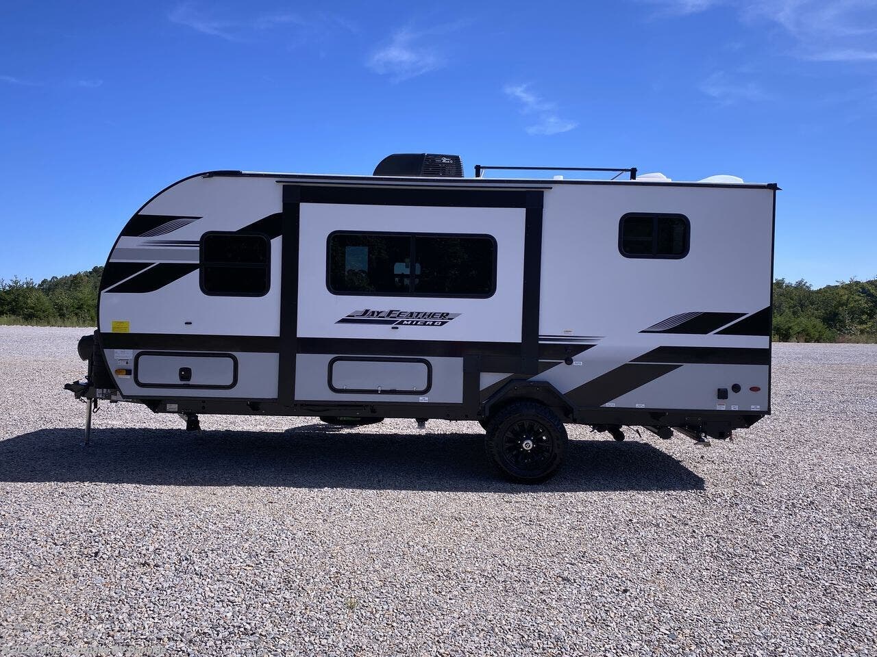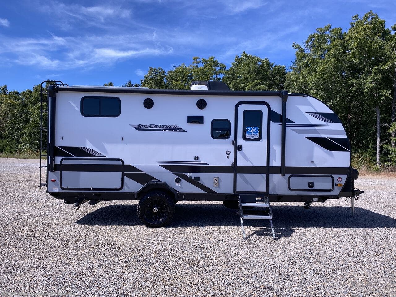 Jayco's lightest travel trailer, the Jay Feather Micro is ready for adventure at the drop of a hat! The Climate Shield weather protection will let you camp well into the colder months and the Stronghold VBL with double-sized Azdel is ultra durable. The Jay Pro Package includes 16-inch American-made Goodyear off-road tires with self-adjusting brakes, a rear-mounted roof ladder, and the Overlander 1 Solar Package with a 200W solar panel. Additional exterior features include marine grade exterior speakers with blue LED accent lighting, a swing-out entry door assist handle, a power tongue jack, and more! Inside, you will love the 4-inch high-density dinette cushions with vinyl backing for easy cleaning, along with the handcrafted hardwood door/drawer fronts, residential style kitchen countertops, and decorative roller shades with a reflective barrier for better insulation.