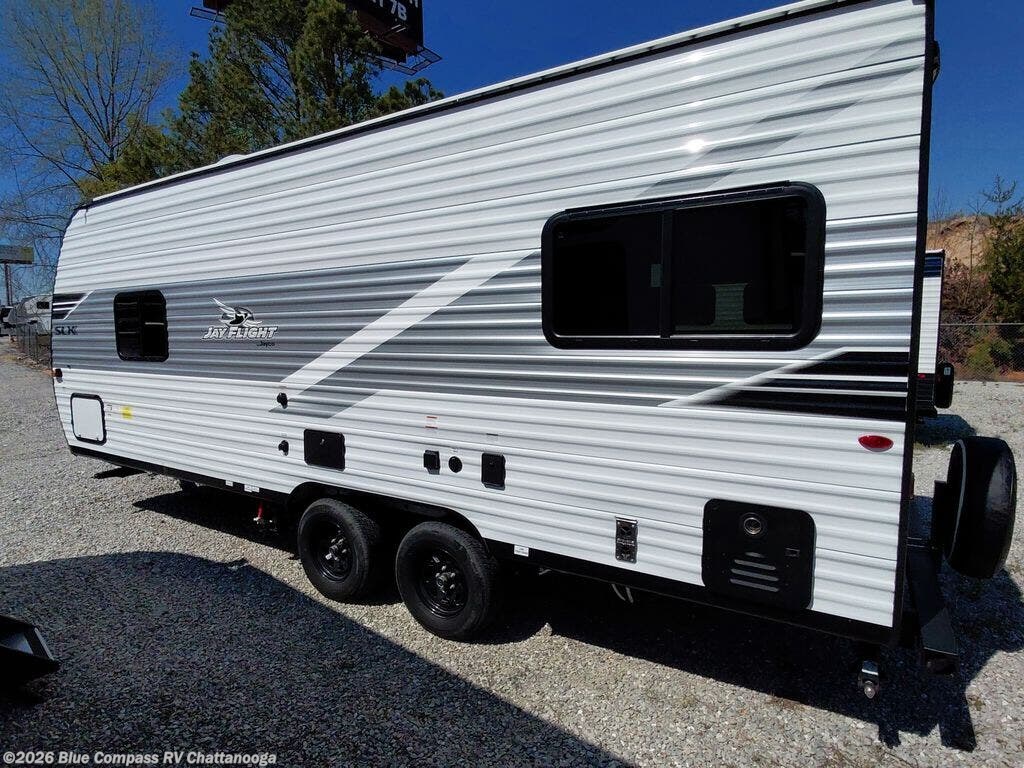 The Jayco Jay Flight SLX travel trailer is quite easy to own because it is lightweight for an easier towing experience. Built on a fully integrated A-frame with galvanized-steel, impact-resistant wheel wells, the Jay Flight SLX has quality at its very foundation. That quality continues on to the electric self-adjusting brakes, easy-lube hubs, Magnum Truss roof system, and LP quick connect. Some of what the mandatory Customer Value Package includes is backup camera prep, Keyed-Alike entry and baggage doors, and an on-demand tankless water heater.