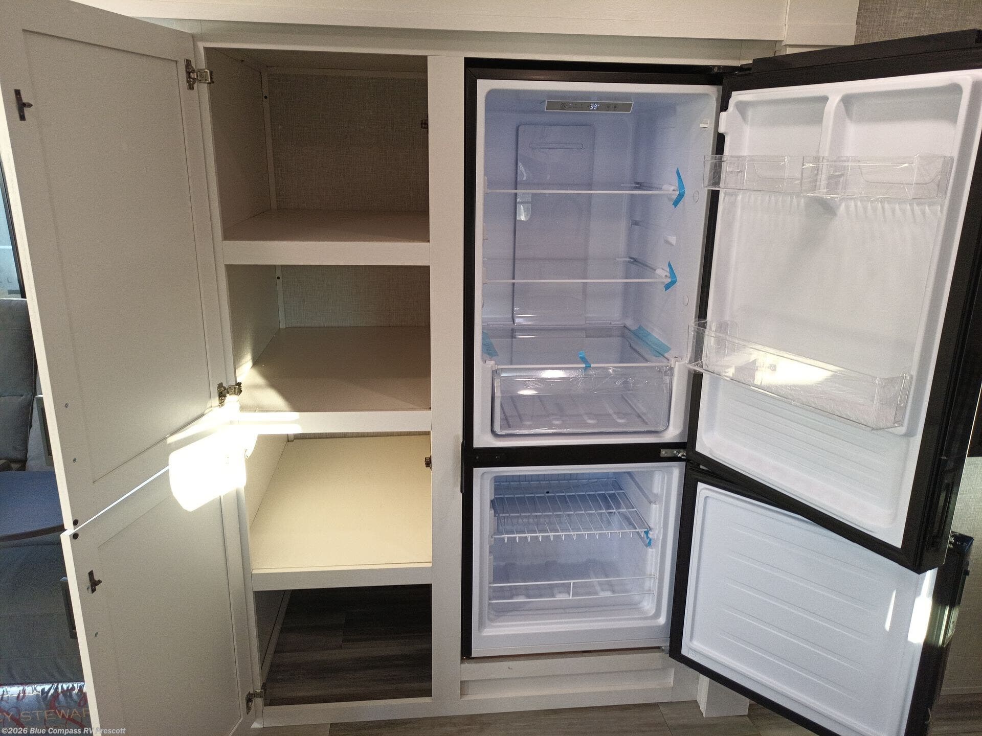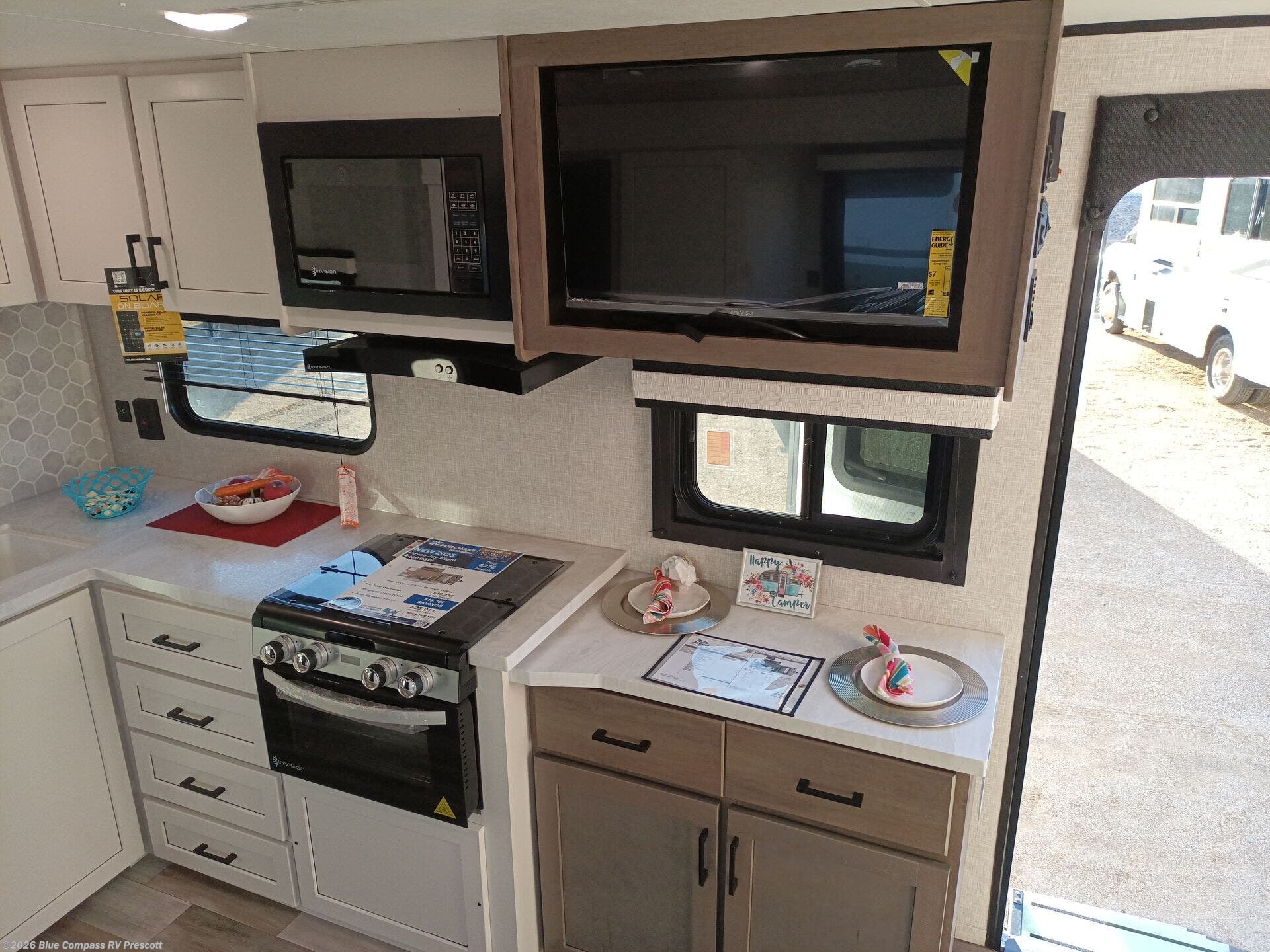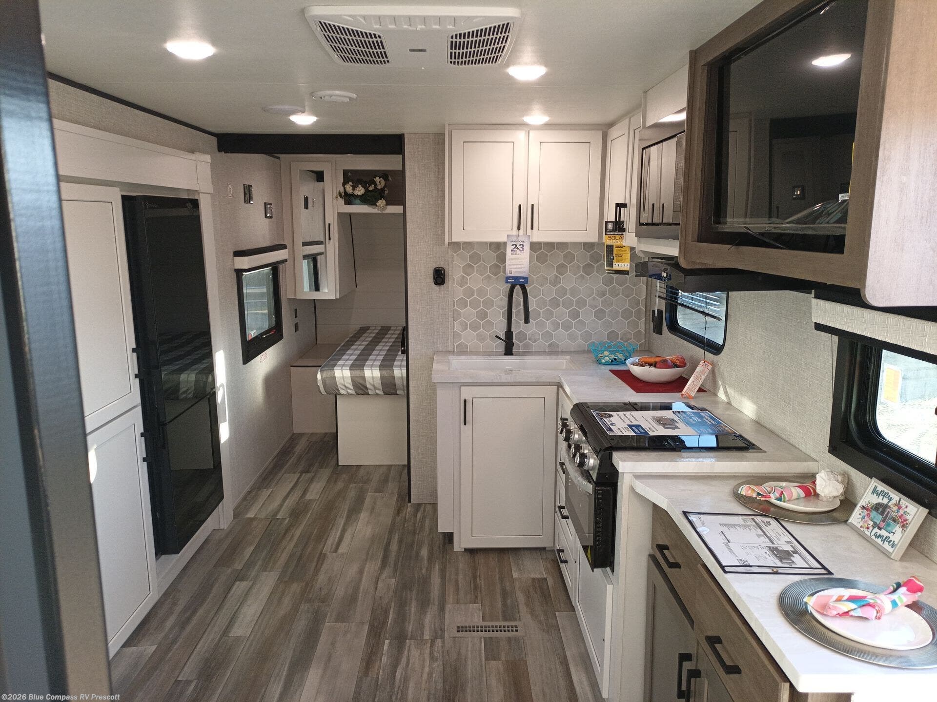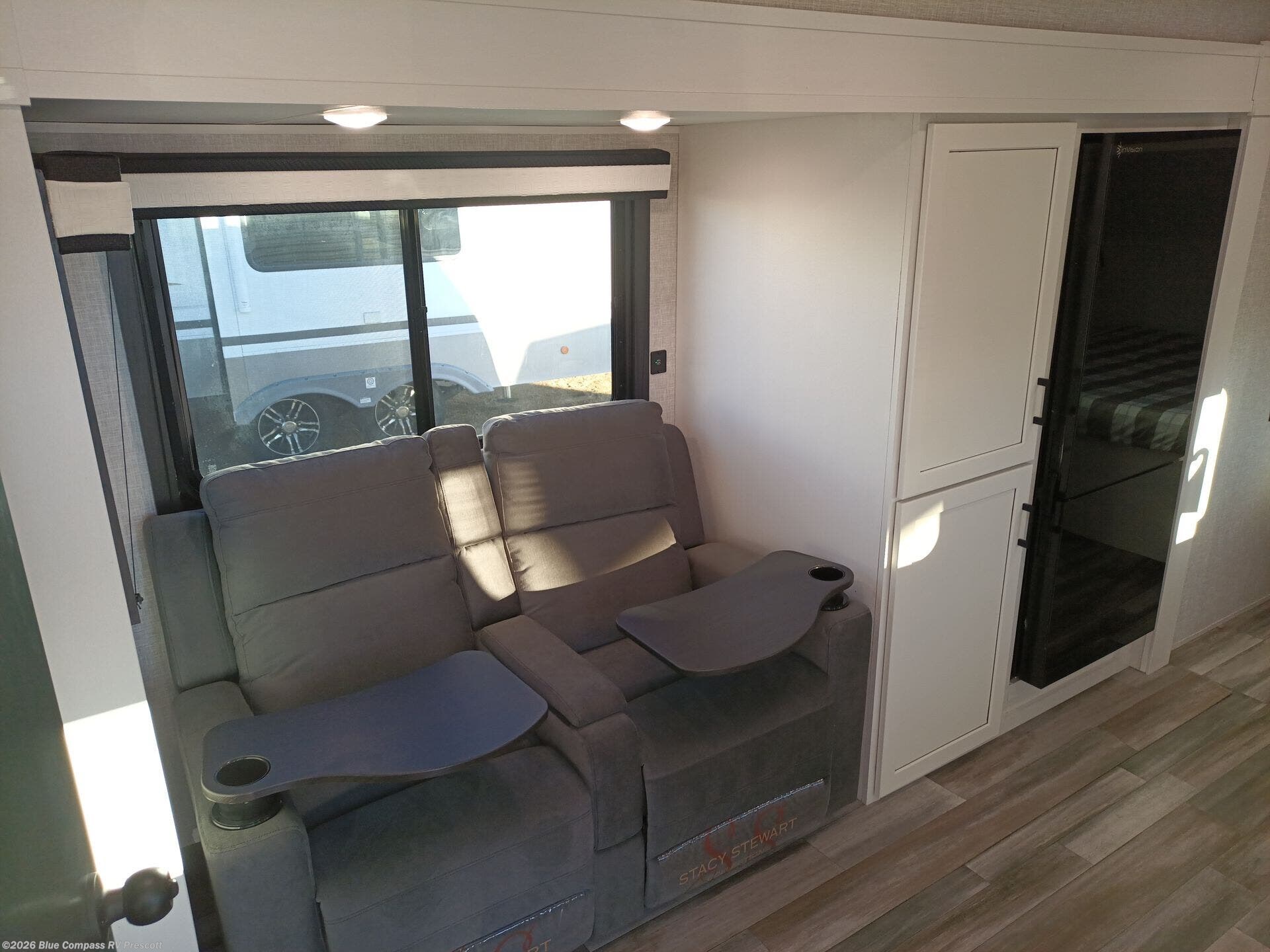 You will feel right at home in this travel trailer! It features a front private bedroom with a 60" x 75" queen bed that has wardrobes on either side and a shelf above to set your books. The kitchen has everything you will need to prepare a delicious home cooked meal including a large pantry to store your favorite snacks. The theater seats are directly across from the entertainment center and can also be switched out for an optional tri-fold sofa and you can choose to add an optional LED Smart TV as well. The full rear bathroom has an abundance of room for you to walk around as you get ready each morning. You can grab a jacket on those crisp mornings and head to the outdoor griddle with LP Quick Connect to make pancakes!