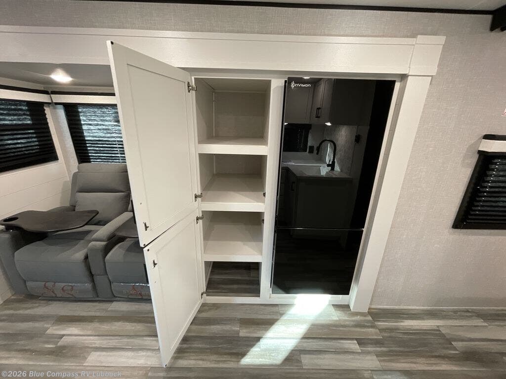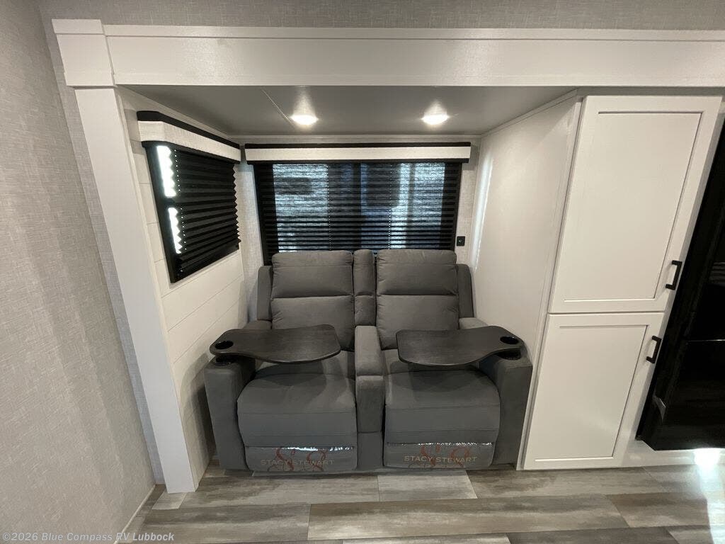 You will feel right at home in this travel trailer! It features a front private bedroom with a 60" x 75" queen bed that has wardrobes on either side and a shelf above to set your books. The kitchen has everything you will need to prepare a delicious home cooked meal including a large pantry to store your favorite snacks. The theater seats are directly across from the entertainment center and can also be switched out for an optional tri-fold sofa and you can choose to add an optional LED Smart TV as well. The full rear bathroom has an abundance of room for you to walk around as you get ready each morning. You can grab a jacket on those crisp mornings and head to the outdoor griddle with LP Quick Connect to make pancakes!
