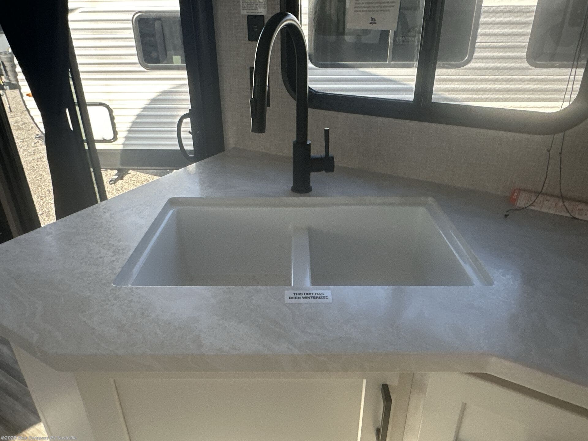 With two private bedrooms, everyone will have a comfortable place to sleep in this travel trailer! The front private bedroom has a 60" x 75" queen bed with wardrobes on either side and the rear private bedroom has a 60" x 80" queen bed slide with a dresser, a wardrobe, one of the exit/entrance doors, and an entrance into the walk-through bathroom which has a radius shower for everyone to stay squeaky clean. The patio doors not only make it easy to enter and exit the unit, but also bring in tons of natural lighting. After you have prepared a delicious home cooked meal, you can can head to the U-shaped dinette to enjoy it there comfortably then relax on the Jack-knife sofa across from the entertainment center!