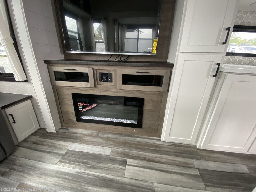 Wherever you choose you camp, you'll be camping in comfort with this travel trailer. There are dual opposing slides in the main living area, allowing everyone space to stretch out, and the cook will love having more space at the kitchen island. After dinner is cleaned up you can relax on the theater seat across from the TV and fireplace, or you can play a game at the free-standing table and chairs. The little ones are sure to head up to the double loft area to play or rest. Here, you'll find three bunk mats, two wardrobes, and shelves for plenty of storage space. The front private bedroom incudes a cozy queen bed, plus a dresser, wardrobe, and storage cabinets for all your belongings. You can even choose the king bed option in place of the queen bed if you want more space to stretch out!