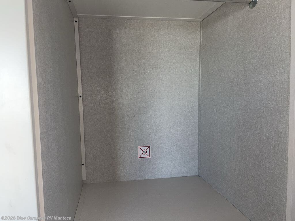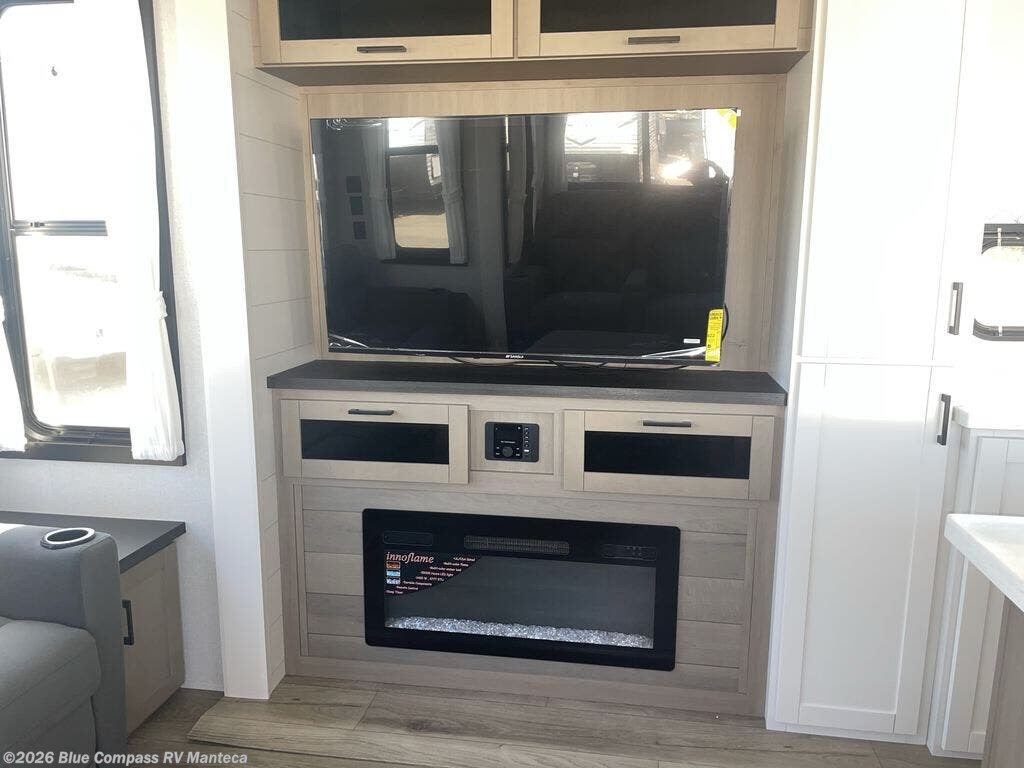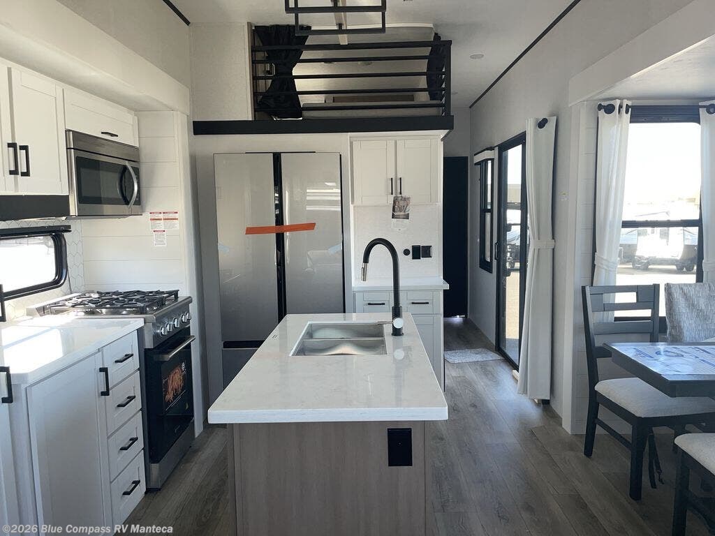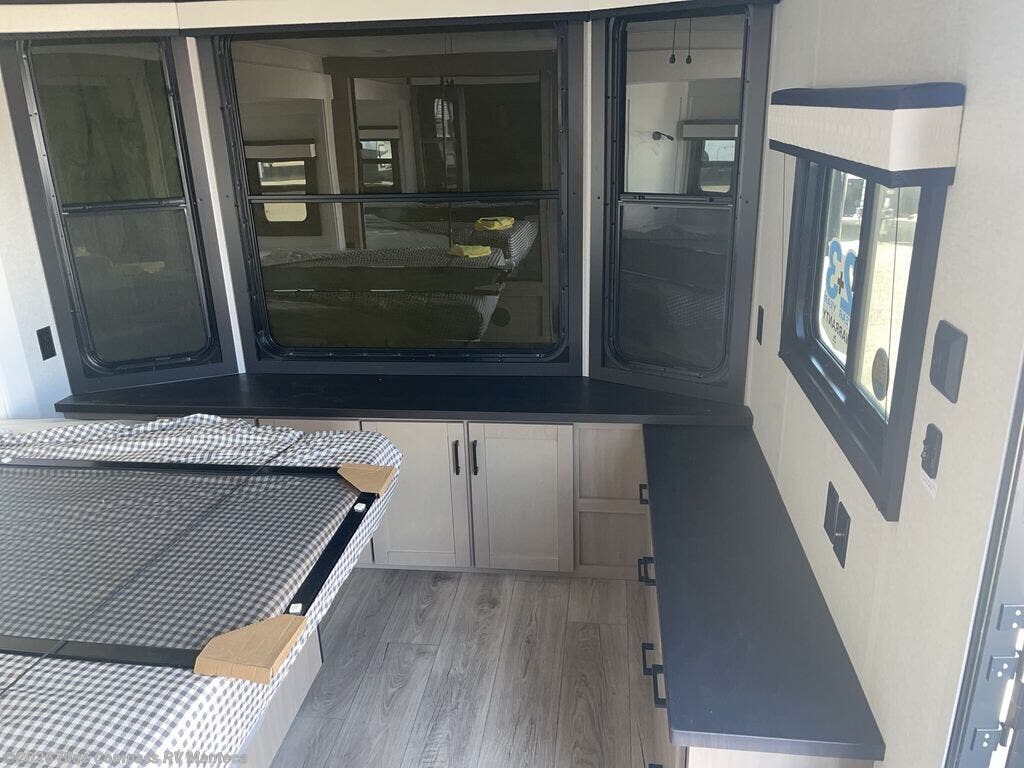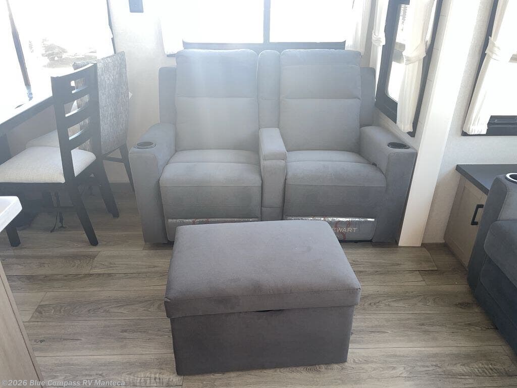 Wherever you choose you camp, you'll be camping in comfort with this travel trailer. There are dual opposing slides in the main living area, allowing everyone space to stretch out, and the cook will love having more space at the kitchen island. After dinner is cleaned up you can relax on the theater seat across from the TV and fireplace, or you can play a game at the free-standing table and chairs. The little ones are sure to head up to the double loft area to play or rest. Here, you'll find three bunk mats, two wardrobes, and shelves for plenty of storage space. The front private bedroom incudes a cozy queen bed, plus a dresser, wardrobe, and storage cabinets for all your belongings. You can even choose the king bed option in place of the queen bed if you want more space to stretch out!