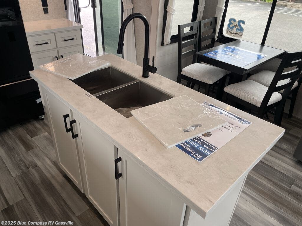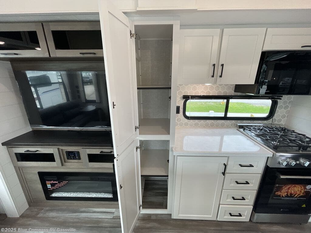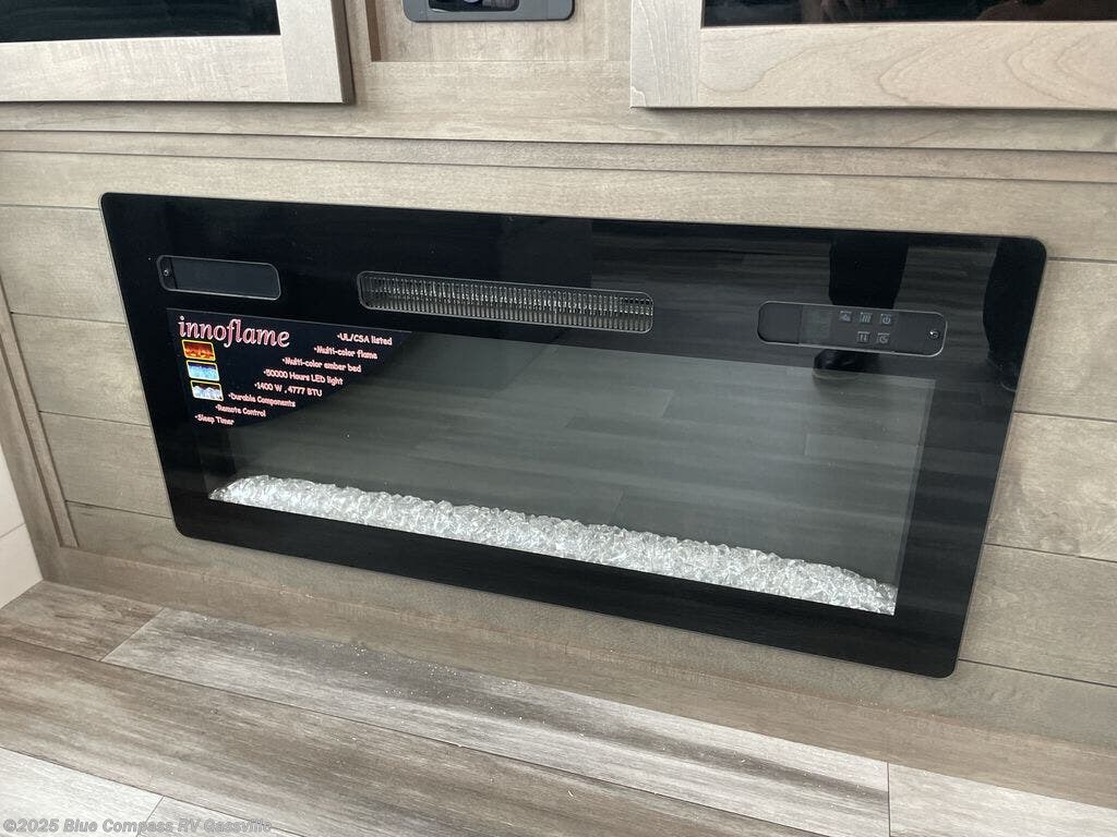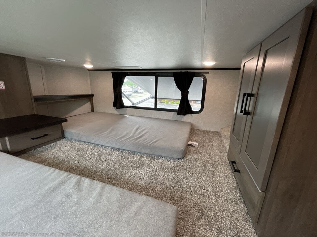 Wherever you choose you camp, you'll be camping in comfort with this travel trailer. There are dual opposing slides in the main living area, allowing everyone space to stretch out, and the cook will love having more space at the kitchen island. After dinner is cleaned up you can relax on the theater seat across from the TV and fireplace, or you can play a game at the free-standing table and chairs. The little ones are sure to head up to the double loft area to play or rest. Here, you'll find three bunk mats, two wardrobes, and shelves for plenty of storage space. The front private bedroom incudes a cozy queen bed, plus a dresser, wardrobe, and storage cabinets for all your belongings. You can even choose the king bed option in place of the queen bed if you want more space to stretch out!