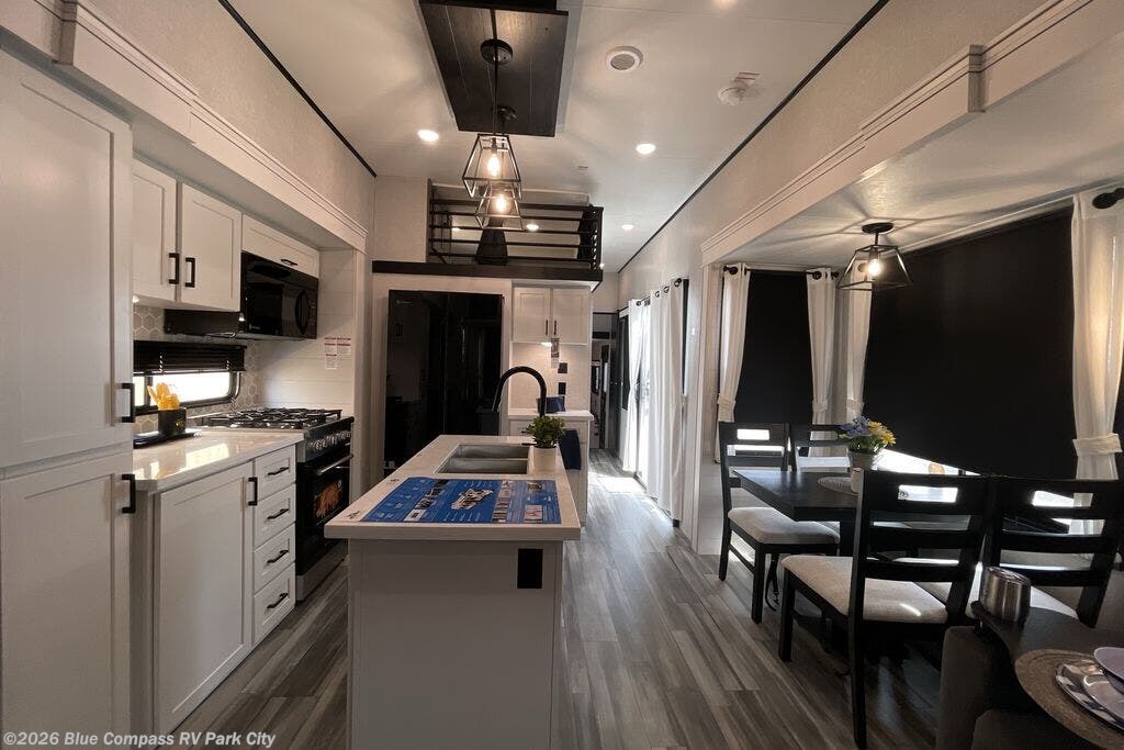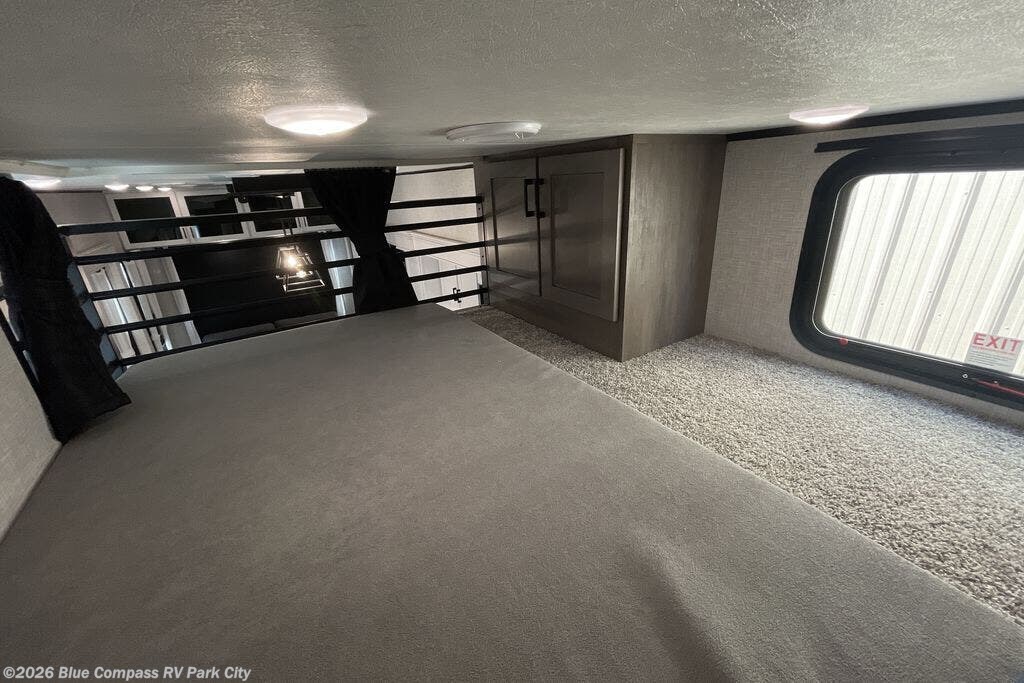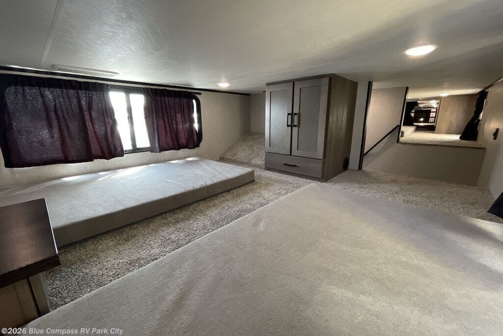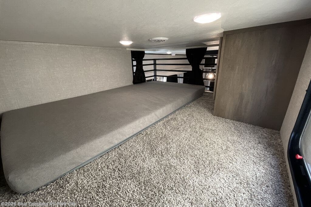 Wherever you choose you camp, you'll be camping in comfort with this travel trailer. There are dual opposing slides in the main living area, allowing everyone space to stretch out, and the cook will love having more space at the kitchen island. After dinner is cleaned up you can relax on the theater seat across from the TV and fireplace, or you can play a game at the free-standing table and chairs. The little ones are sure to head up to the double loft area to play or rest. Here, you'll find three bunk mats, two wardrobes, and shelves for plenty of storage space. The front private bedroom incudes a cozy queen bed, plus a dresser, wardrobe, and storage cabinets for all your belongings. You can even choose the king bed option in place of the queen bed if you want more space to stretch out!