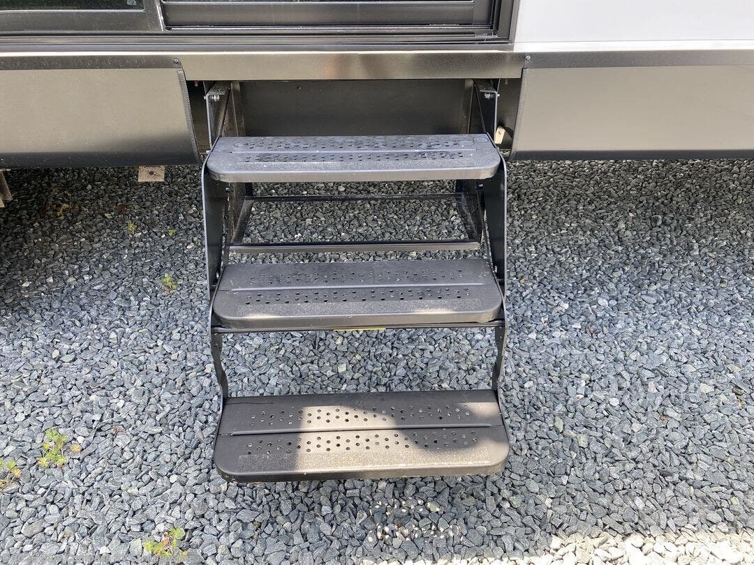 Extended stays are made easy in this travel trailer for four. You will love having your own bedroom up front with a queen bed slide, a wardrobe, plus two chests for your things, and your guests can sleep on the tri-fold sofa in the rear living area. A ceiling fan will keep the air moving while the chef makes eggs and bacon in the morning, and you all can dine at the free-standing table with chairs. Spend your day outdoors hiking, biking, or swimming, and the full bath will allow you to clean up after your adventures. You may want to make it a movie night since there is an entertainment center with a TV, or you can just relax by the fireplace and visit!
