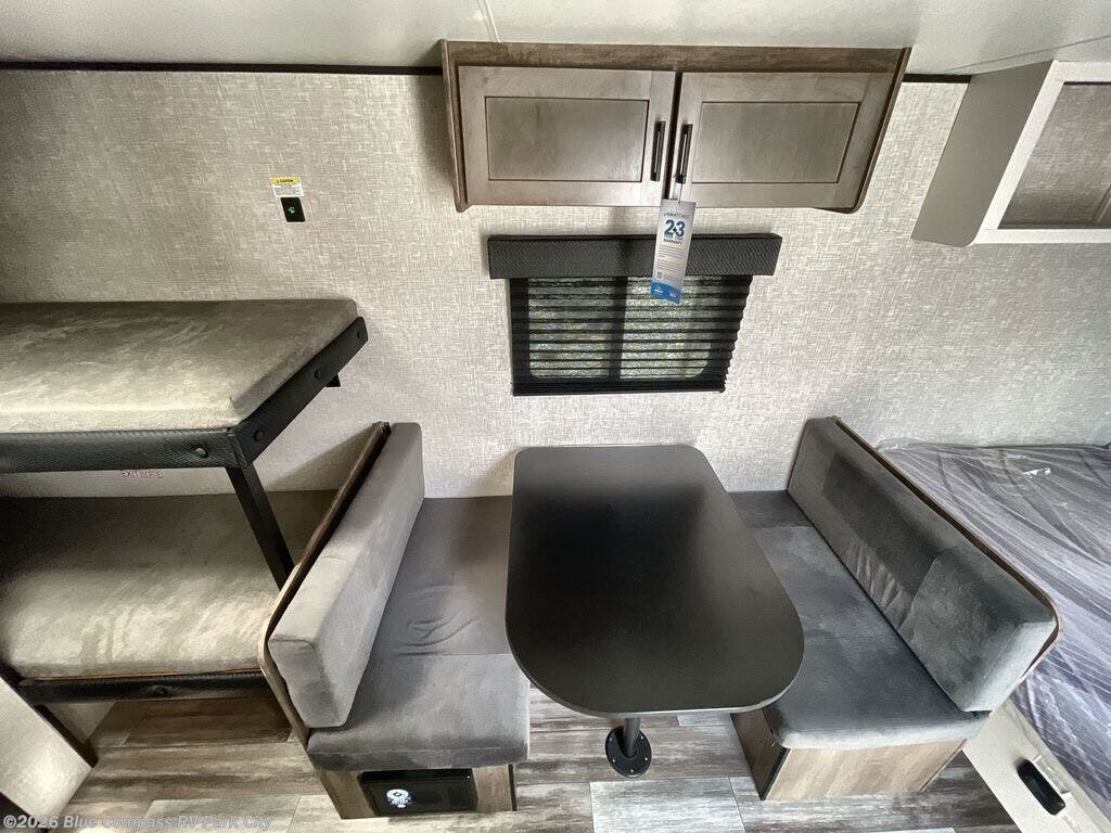 Your crew of five will love camping in this single-axle travel trailer! There are bunk beds in the rear corner and a full bath in the other rear corner for easy nighttime use. You will have the front queen bed to yourselves, along with an overhead shelf and a nightstand/wardrobe for your clothes. The booth dinette provides a place to dine, play games, and even let an extra guest stay over. The Customer Value Package on this Sport Edition model includes a 19K BTU furnace, stabilizer jacks, a power awning, an entry door with a window and shade prep, and many more stand-out features!