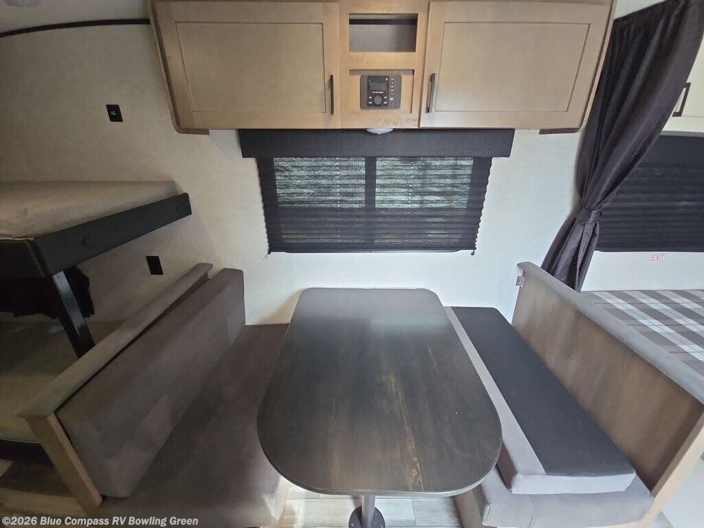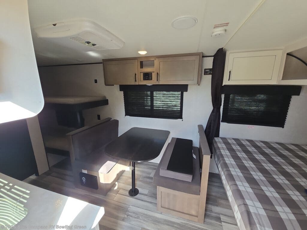 Your crew of five will love camping in this single-axle travel trailer! There are bunk beds in the rear corner and a full bath in the other rear corner for easy nighttime use. You will have the front queen bed to yourselves, along with a privacy curtain, overhead shelf, and a nightstand/wardrobe for your clothes. The booth dinette provides a place to dine, play games, and even let an extra guest stay over. The optional STX Edition can be added on this model which includes 16 in. off-road tires, triple entry steps, a power tongue jack, and more!