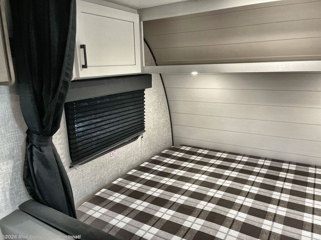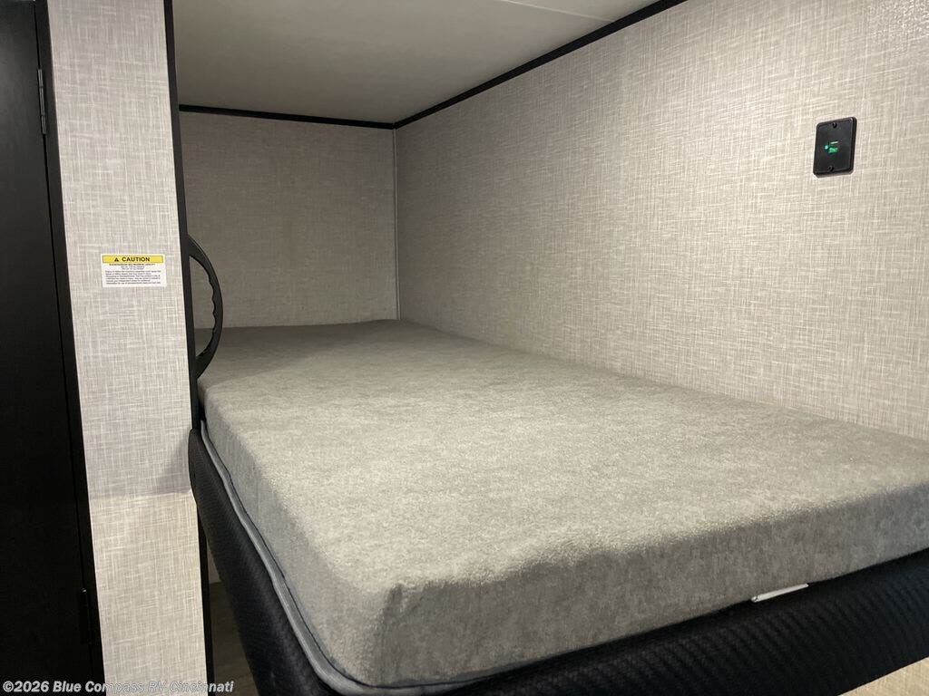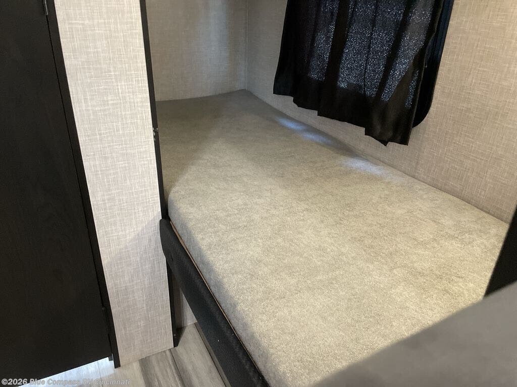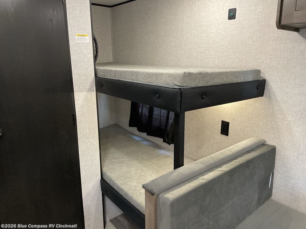 Your crew of five will love camping in this single-axle travel trailer! There are bunk beds in the rear corner and a full bath in the other rear corner for easy nighttime use. You will have the front queen bed to yourselves, along with a privacy curtain, overhead shelf, and a nightstand/wardrobe for your clothes. The booth dinette provides a place to dine, play games, and even let an extra guest stay over. The optional STX Edition can be added on this model which includes 16 in. off-road tires, triple entry steps, a power tongue jack, and more!
