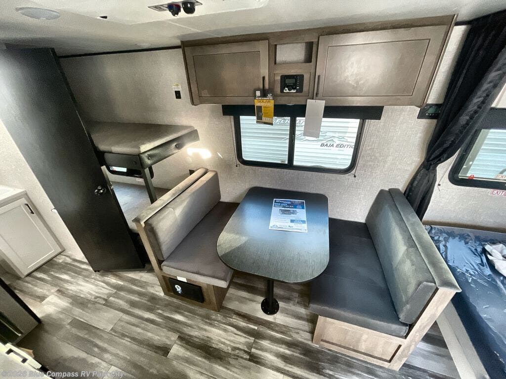 Your crew of five will love camping in this single-axle travel trailer! There are bunk beds in the rear corner and a full bath in the other rear corner for easy nighttime use. You will have the front queen bed to yourselves, along with a privacy curtain, overhead shelf, and a nightstand/wardrobe for your clothes. The booth dinette provides a place to dine, play games, and even let an extra guest stay over. The optional Baja Package can be added on this model which includes 16 in. off-road tires, a deluxe graphics package, triple entry steps, and more!