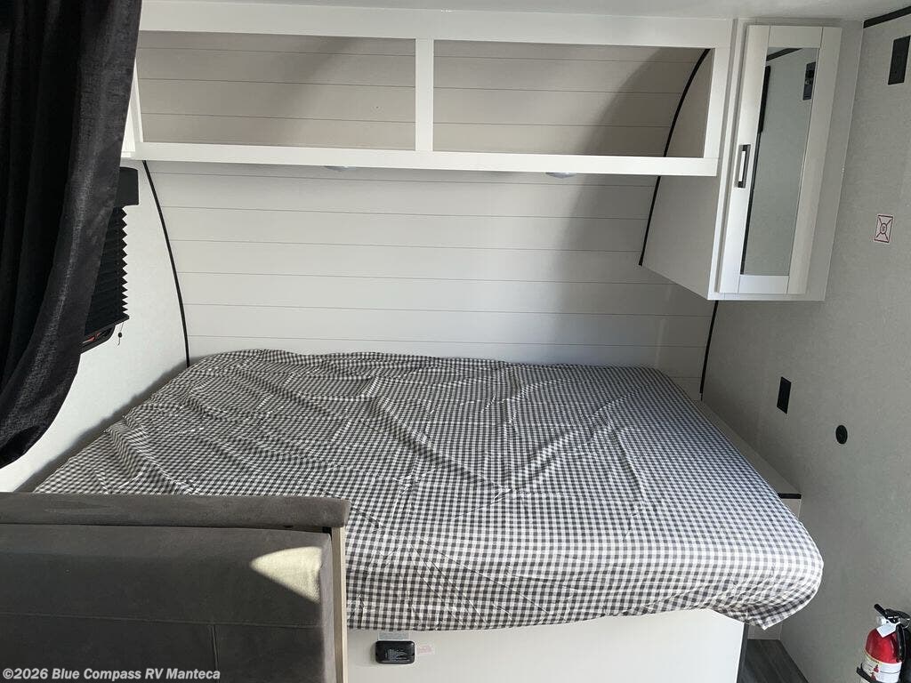 Your crew of five will love camping in this single-axle travel trailer! There are bunk beds in the rear corner and a full bath in the other rear corner for easy nighttime use. You will have the front queen bed to yourselves, along with a privacy curtain, overhead shelf, and a nightstand/wardrobe for your clothes. The booth dinette provides a place to dine, play games, and even let an extra guest stay over. The optional Baja Package can be added on this model which includes 16 in. off-road tires, a deluxe graphics package, triple entry steps, and more!