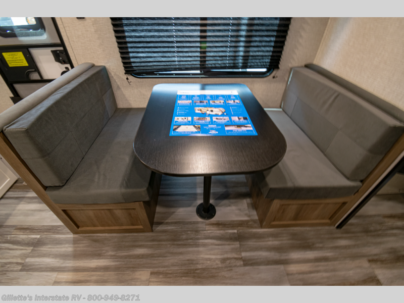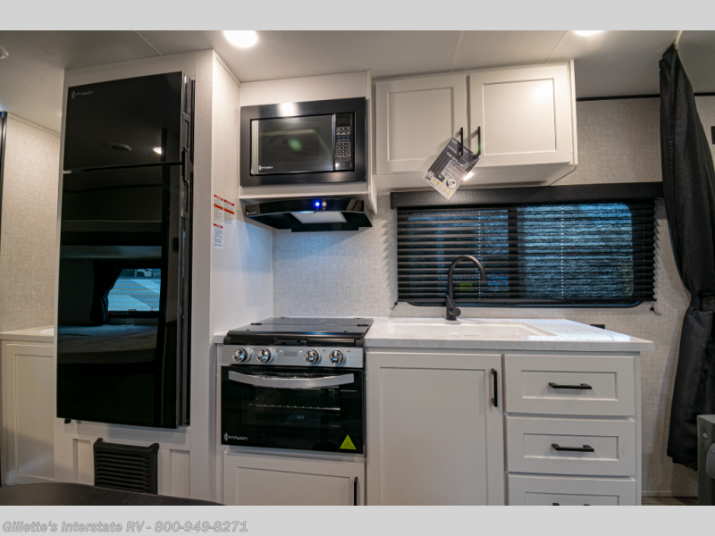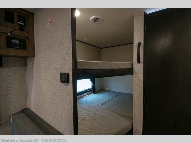 You'll love camping at the lake in this versatile travel trailer. Since there is a Murphy bed up front, you can fold it away in the morning to enjoy the Jack-knife sofa, plus there is a booth dinette for even more seating space. The microwave oven and cooktop in the kitchen allow you to make meals each day, and the 8 cu. ft. 12V refrigerator will keep perishables fresh. Your guests or the little ones are sure to love the double-size bunks, and the rear corner bath is right next to the bunks for easy nighttime use!