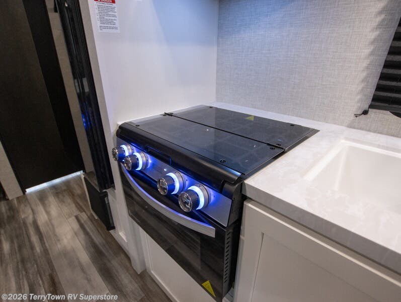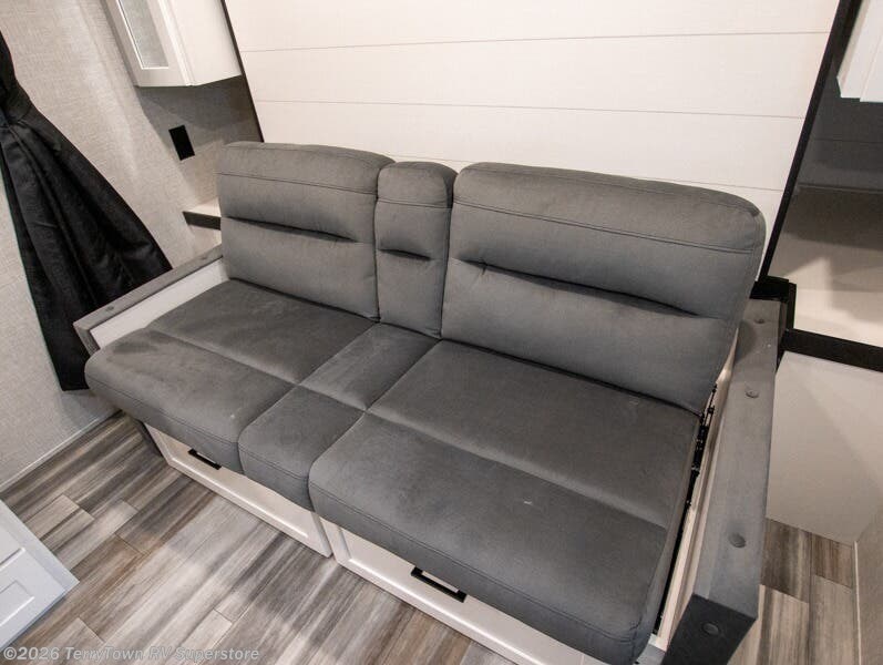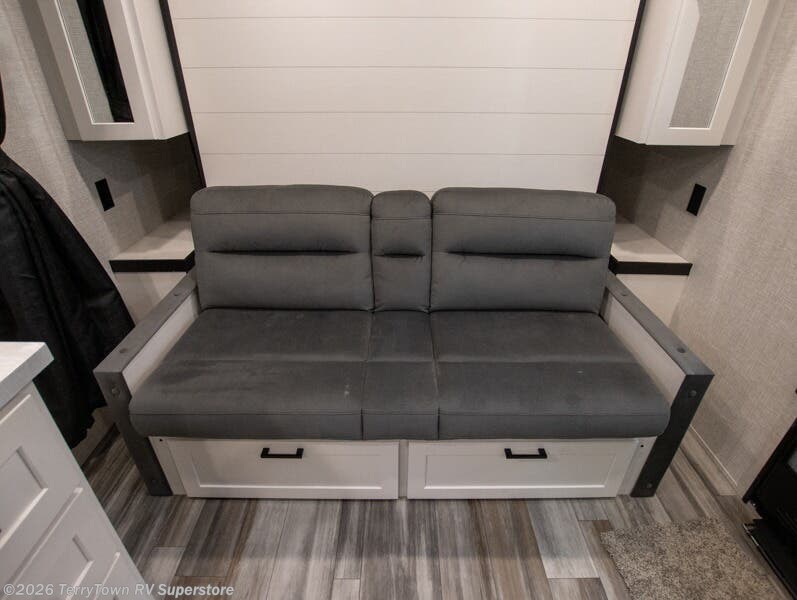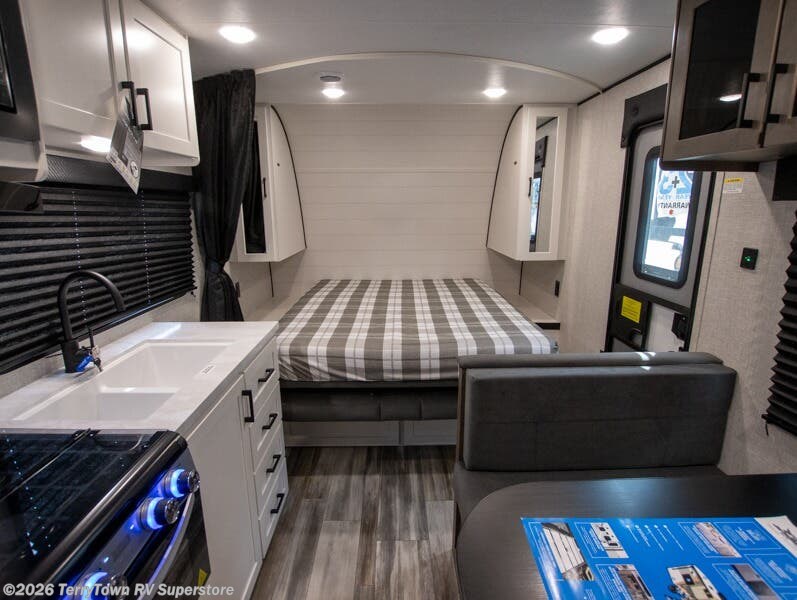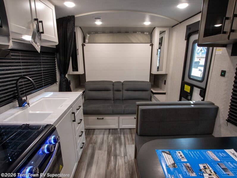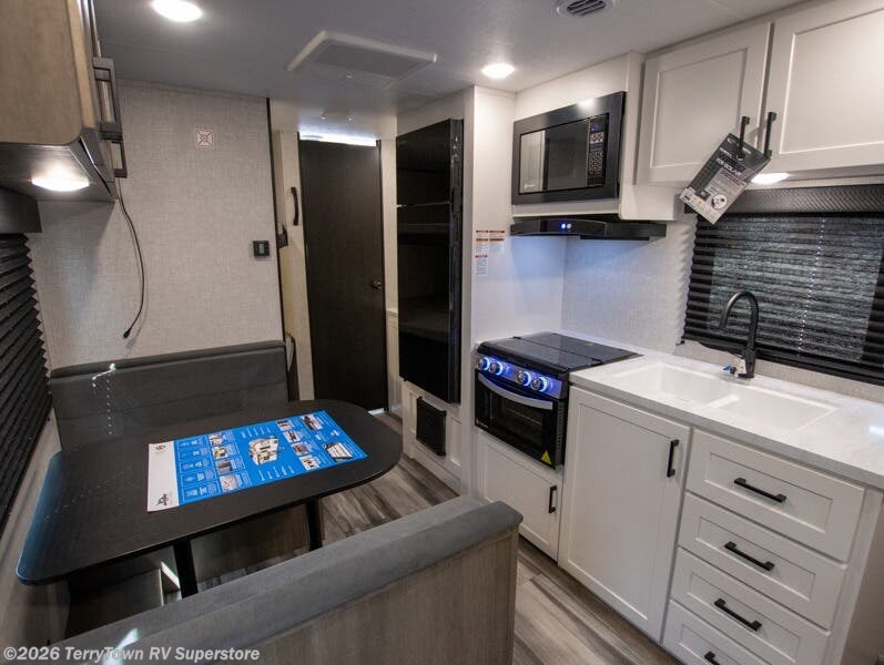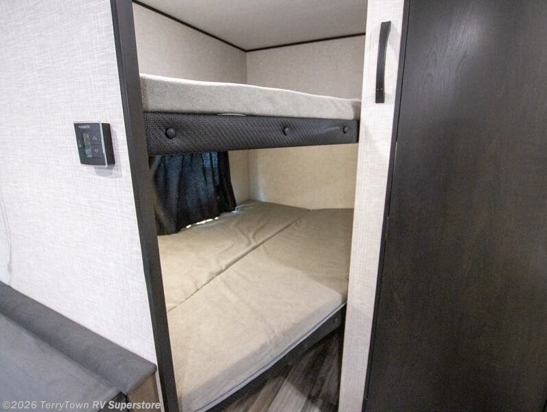 You'll love camping at the lake in this versatile travel trailer. Since there is a Murphy bed up front, you can fold it away in the morning to enjoy the Jack-knife sofa, plus there is a booth dinette for even more seating space. The microwave oven and cooktop in the kitchen allow you to make meals each day, and the 8 cu. ft. 12V refrigerator will keep perishables fresh. Your guests or the little ones are sure to love the double-size bunks, and the rear corner bath is right next to the bunks for easy nighttime use!
