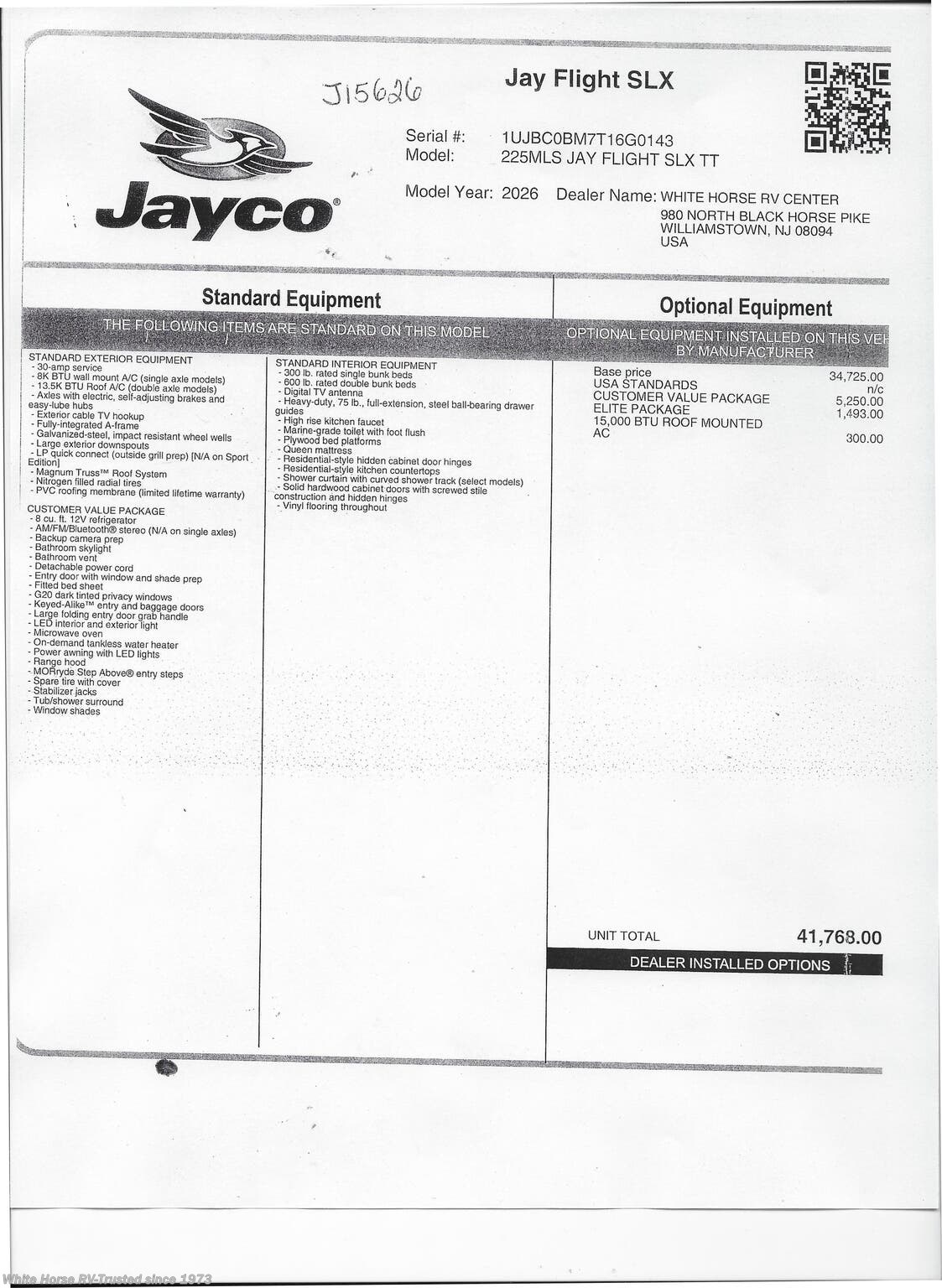This Stock #J15626 also has the following factory options included: ...Country Linen Interior Decor, &15,000 BTU Roof Mounted AC all backed by Jayco’s 2+3-year warranty! MSRP $41,768.00.