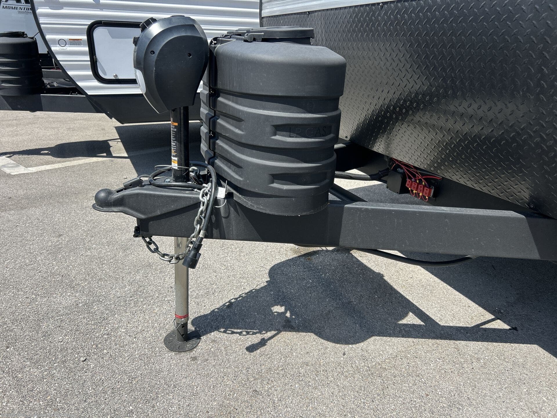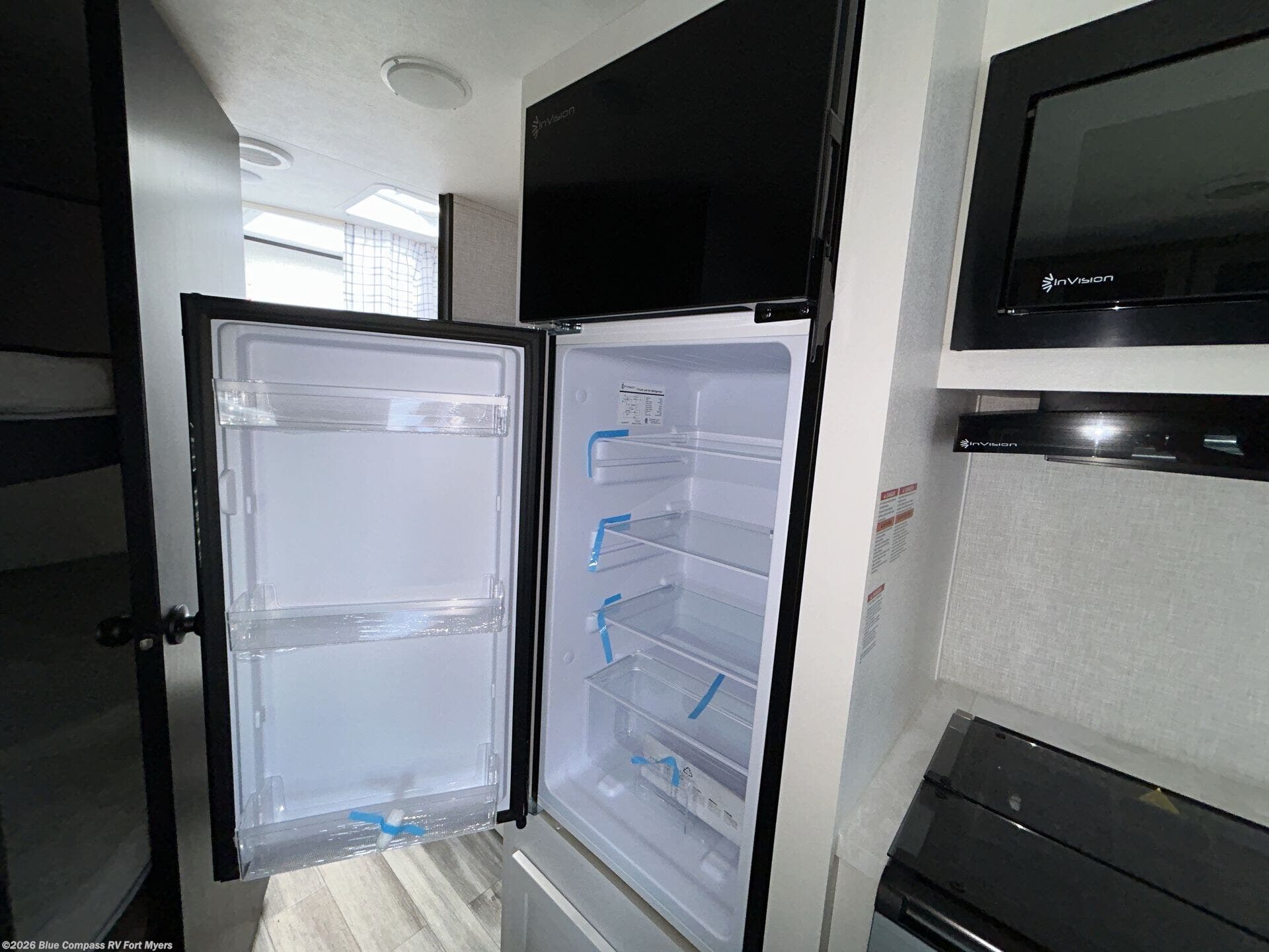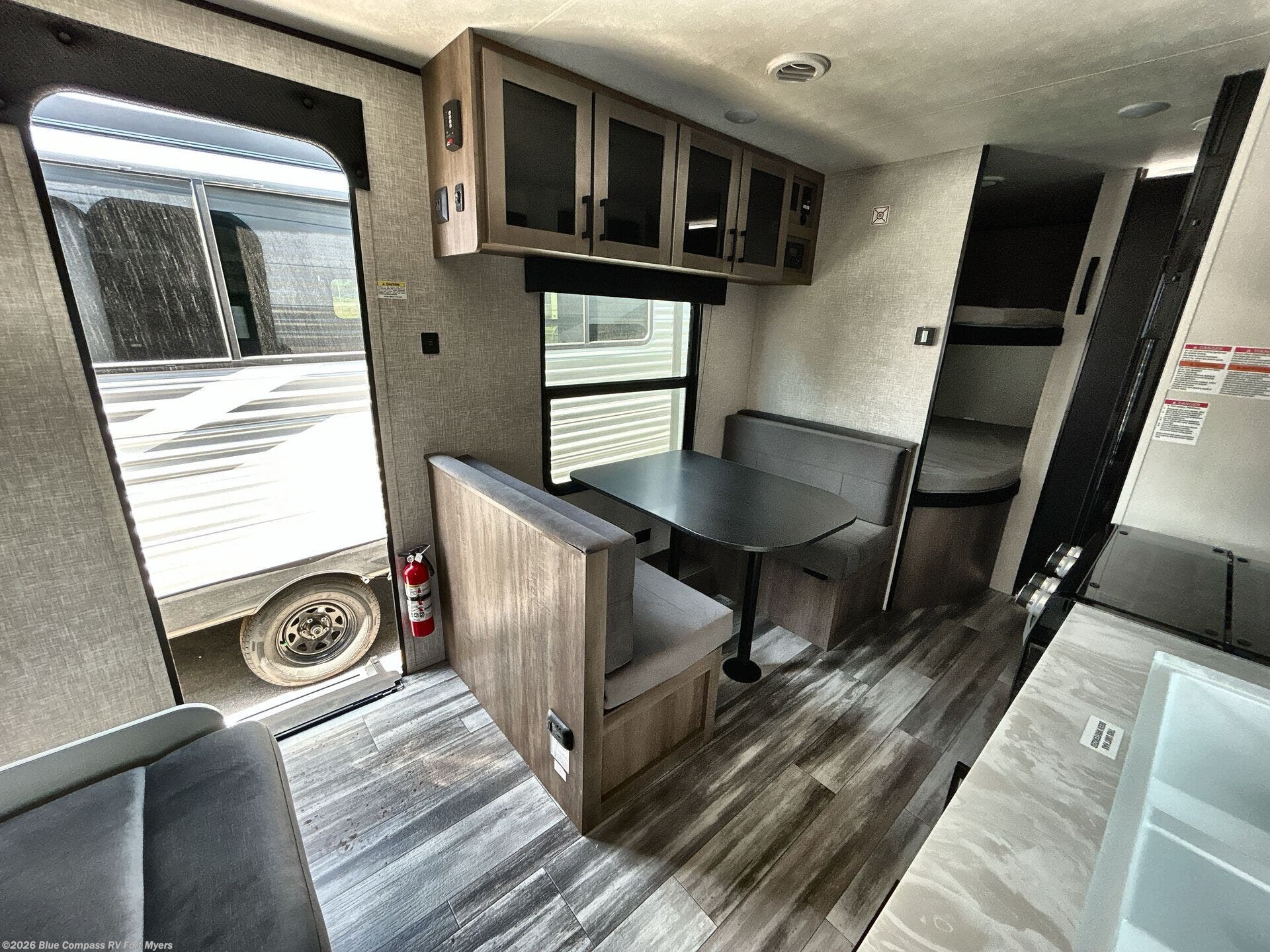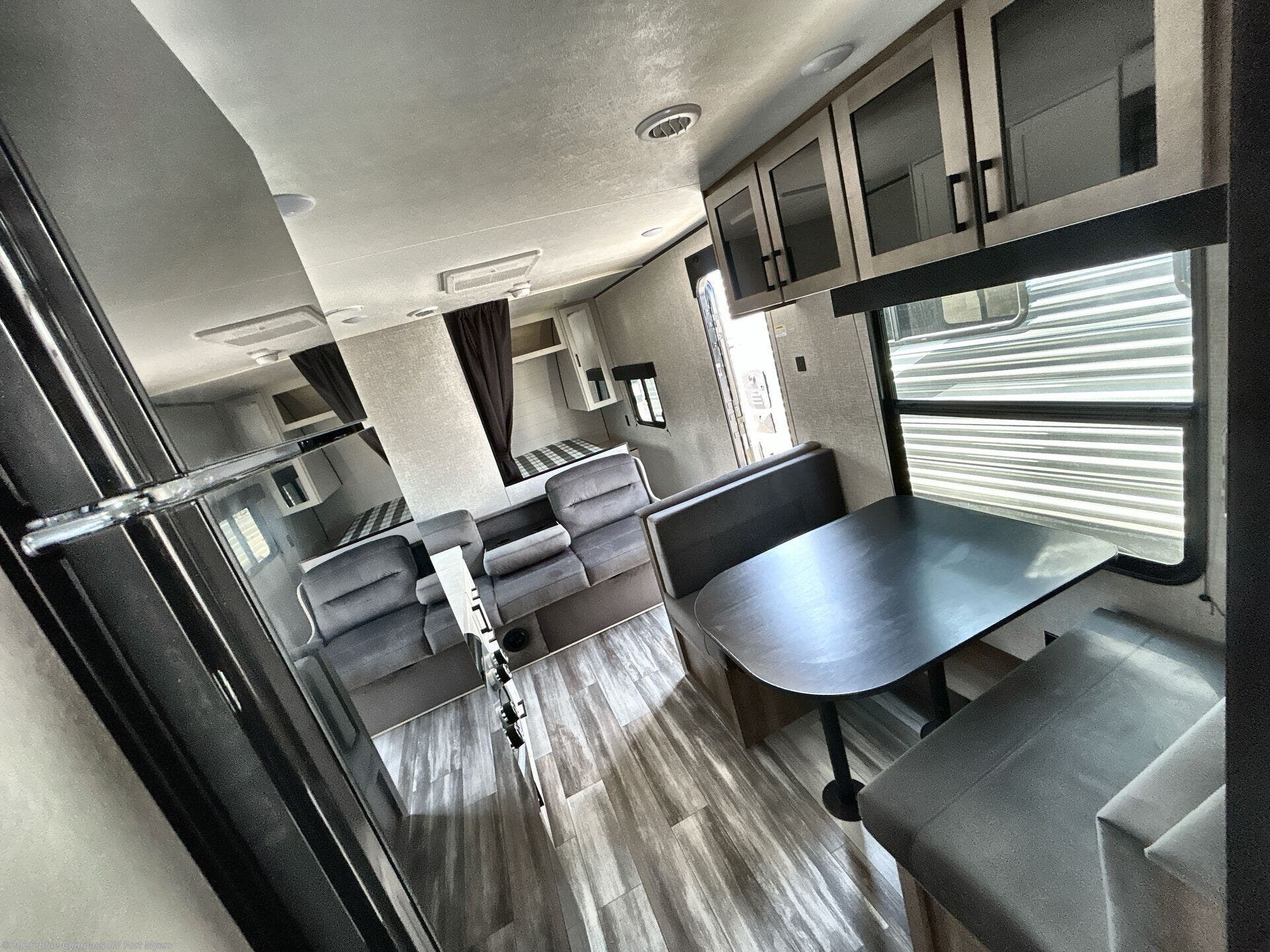 You can comfortably sleep eight to ten people in this trailer thanks to the double-size bunks, the RV queen bed in the front bedroom, plus the booth dinette and jack-knife sofa in the main living area! The chef of your crew will have a three burner cooktop and microwave oven to prepare meals, and everyone can store their favorite drinks in the 8 cu. ft. 12V refrigerator. The bathroom includes a tub/shower and a toilet, with the sink just outside of this room so others can brush their teeth if one is taking a shower before bed. The outside storage will let you bring along fishing poles and the 16' power awning with LED lights will create a nice place to gather in the evenings!