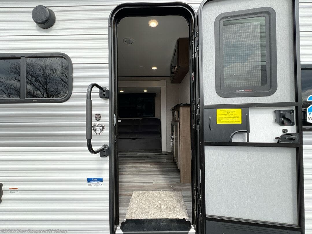 You can comfortably sleep eight to ten people in this trailer thanks to the double-size bunks, the RV queen bed in the front bedroom, plus the booth dinette and jack-knife sofa in the main living area! The chef of your crew will have a three burner cooktop and microwave oven to prepare meals, and everyone can store their favorite drinks in the 8 cu. ft. 12V refrigerator. The bathroom includes a tub/shower and a toilet, with the sink just outside of this room so others can brush their teeth if one is taking a shower before bed. The outside storage will let you bring along fishing poles and the 16' power awning with LED lights will create a nice place to gather in the evenings!