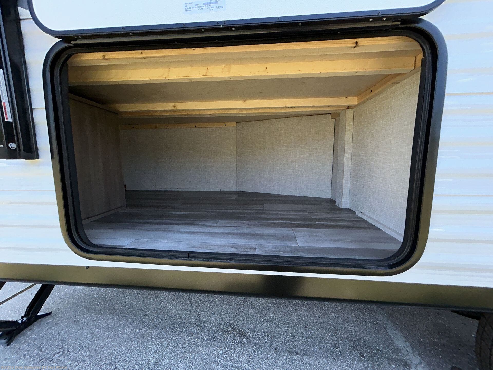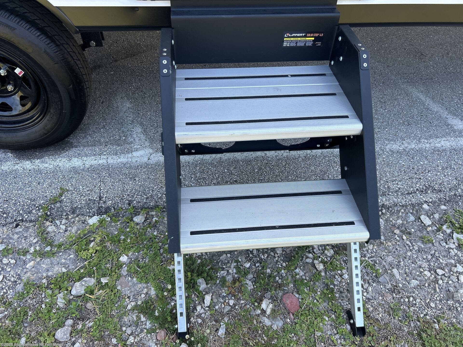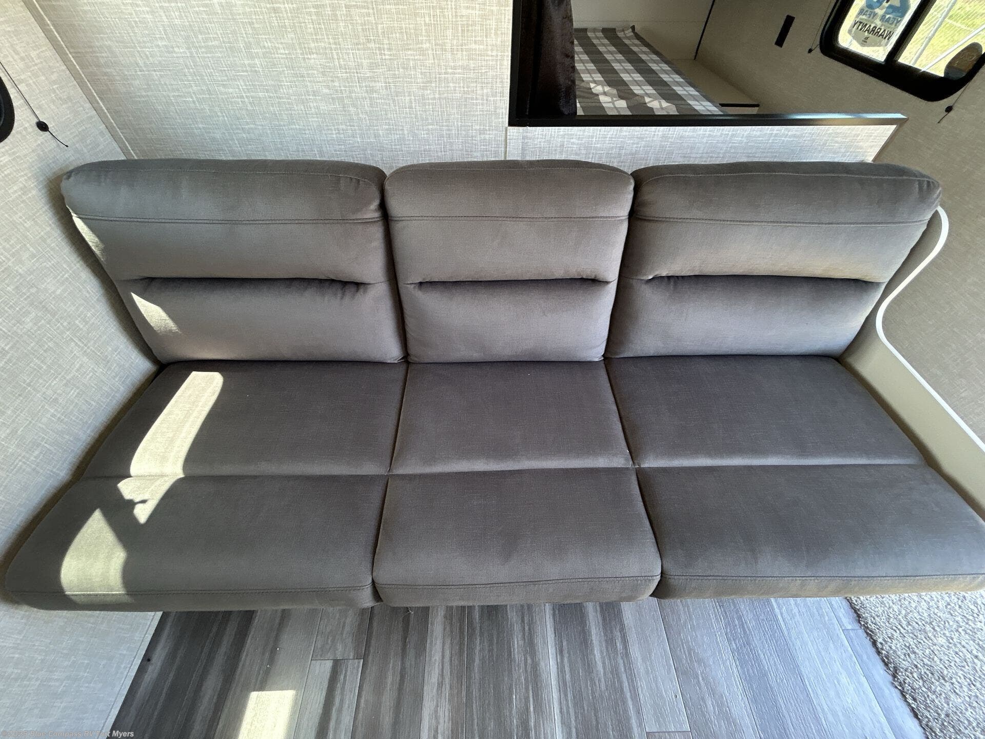 You can comfortably sleep eight to ten people in this trailer thanks to the double-size bunks, the RV queen bed in the front bedroom, plus the booth dinette and jack-knife sofa in the main living area! The chef of your crew will have a three burner cooktop and microwave oven to prepare meals, and everyone can store their favorite drinks in the 8 cu. ft. 12V refrigerator. The bathroom includes a tub/shower and a toilet, with the sink just outside of this room so others can brush their teeth if one is taking a shower before bed. The outside storage will let you bring along fishing poles and the 16' power awning with LED lights will create a nice place to gather in the evenings!