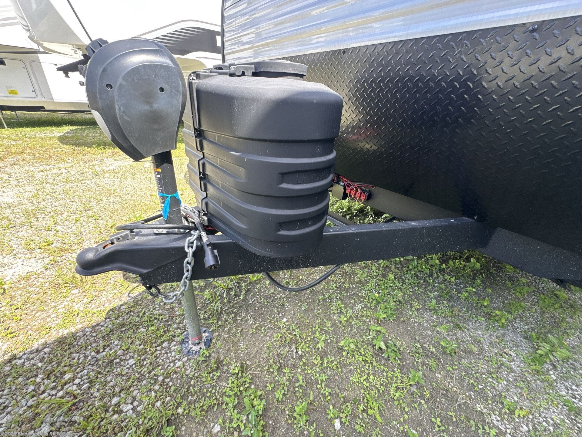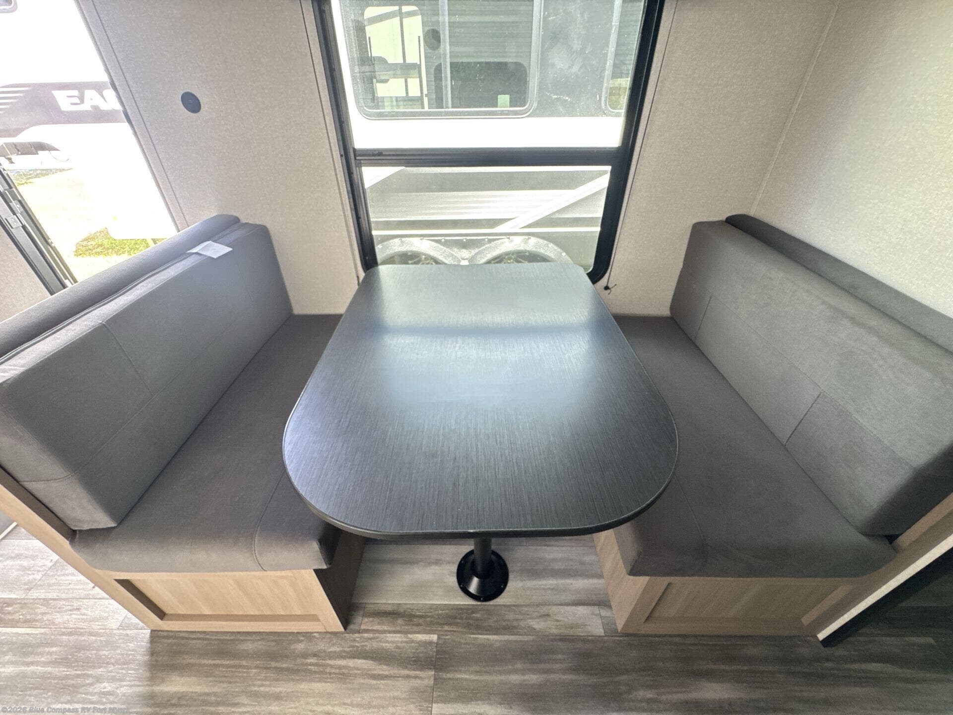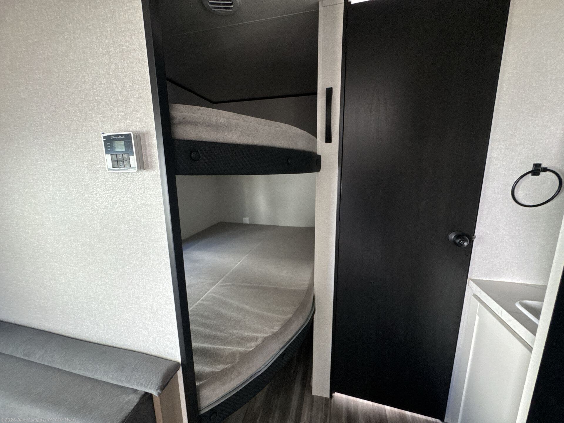 You can comfortably sleep eight to ten people in this trailer thanks to the double-size bunks, the RV queen bed in the front bedroom, plus the booth dinette and jack-knife sofa in the main living area! The chef of your crew will have a three burner cooktop and microwave oven to prepare meals, and everyone can store their favorite drinks in the 8 cu. ft. 12V refrigerator. The bathroom includes a tub/shower and a toilet, with the sink just outside of this room so others can brush their teeth if one is taking a shower before bed. The outside storage will let you bring along fishing poles and the 16' power awning with LED lights will create a nice place to gather in the evenings!