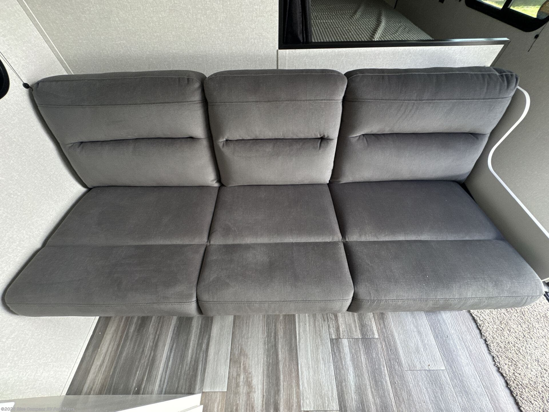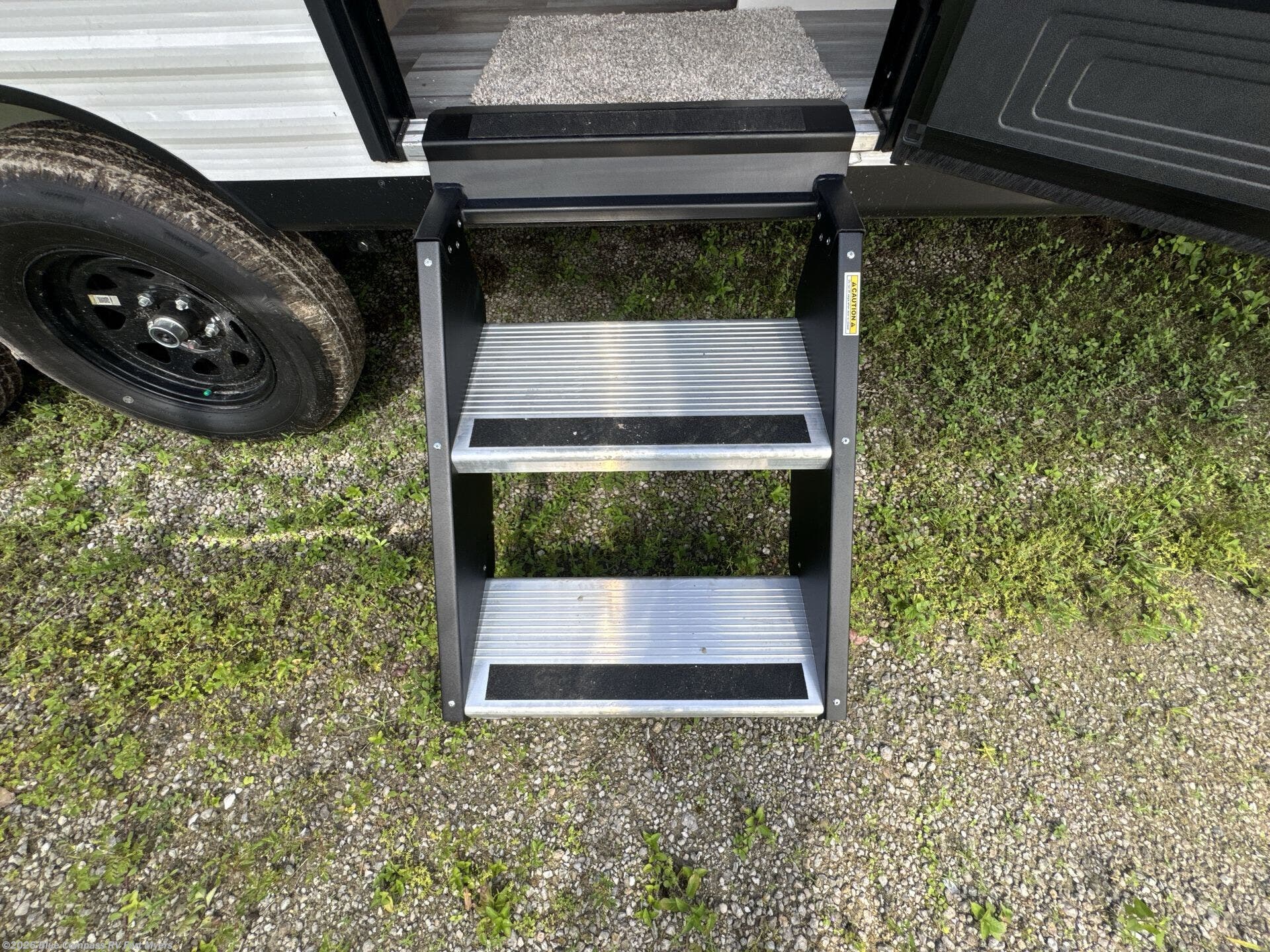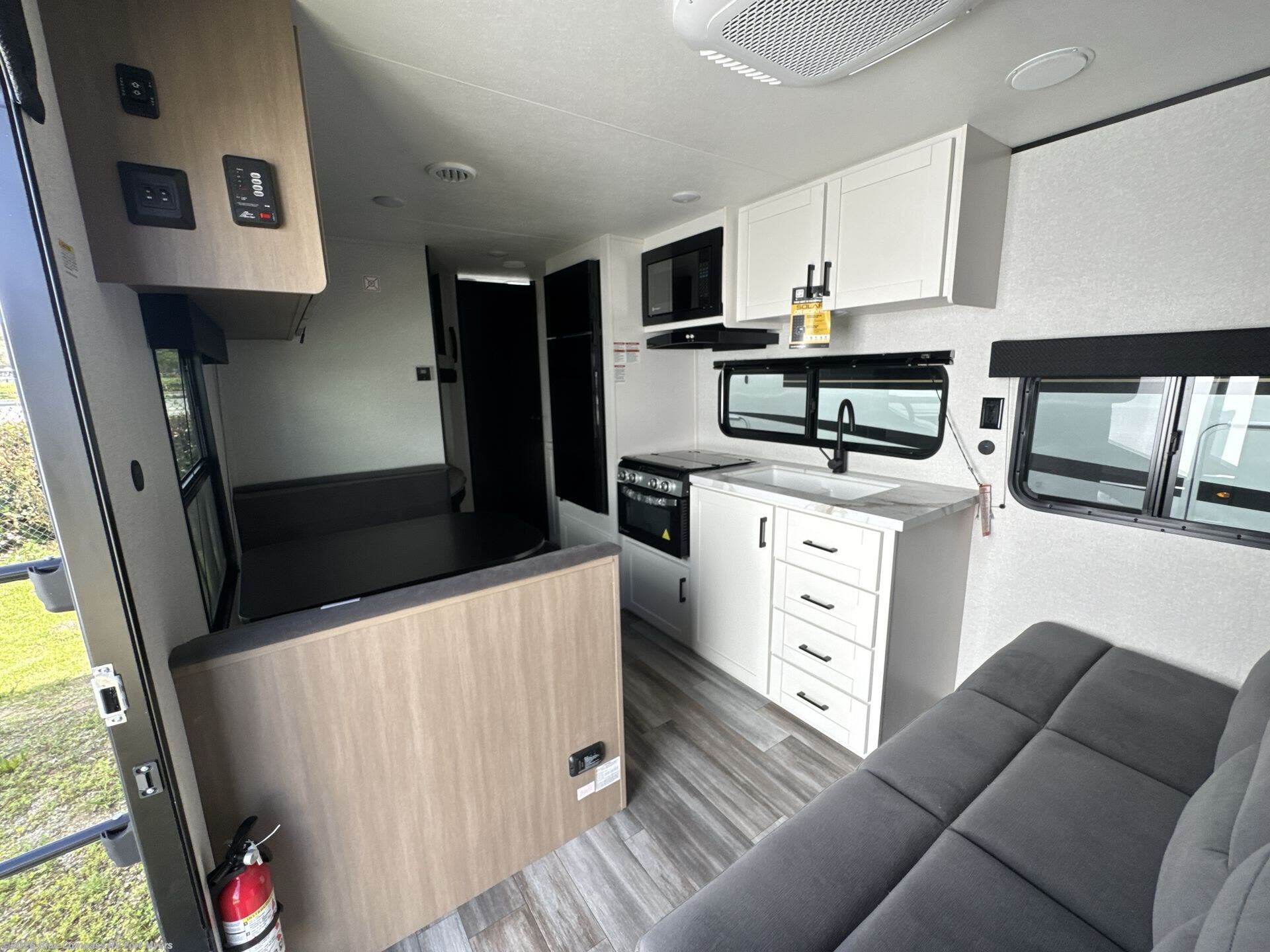 You can comfortably sleep eight to ten people in this trailer thanks to the double-size bunks, the RV queen bed in the front bedroom, plus the booth dinette and jack-knife sofa in the main living area! The chef of your crew will have a three burner cooktop and microwave oven to prepare meals, and everyone can store their favorite drinks in the 8 cu. ft. 12V refrigerator. The bathroom includes a tub/shower and a toilet, with the sink just outside of this room so others can brush their teeth if one is taking a shower before bed. The outside storage will let you bring along fishing poles and the 16' power awning with LED lights will create a nice place to gather in the evenings!