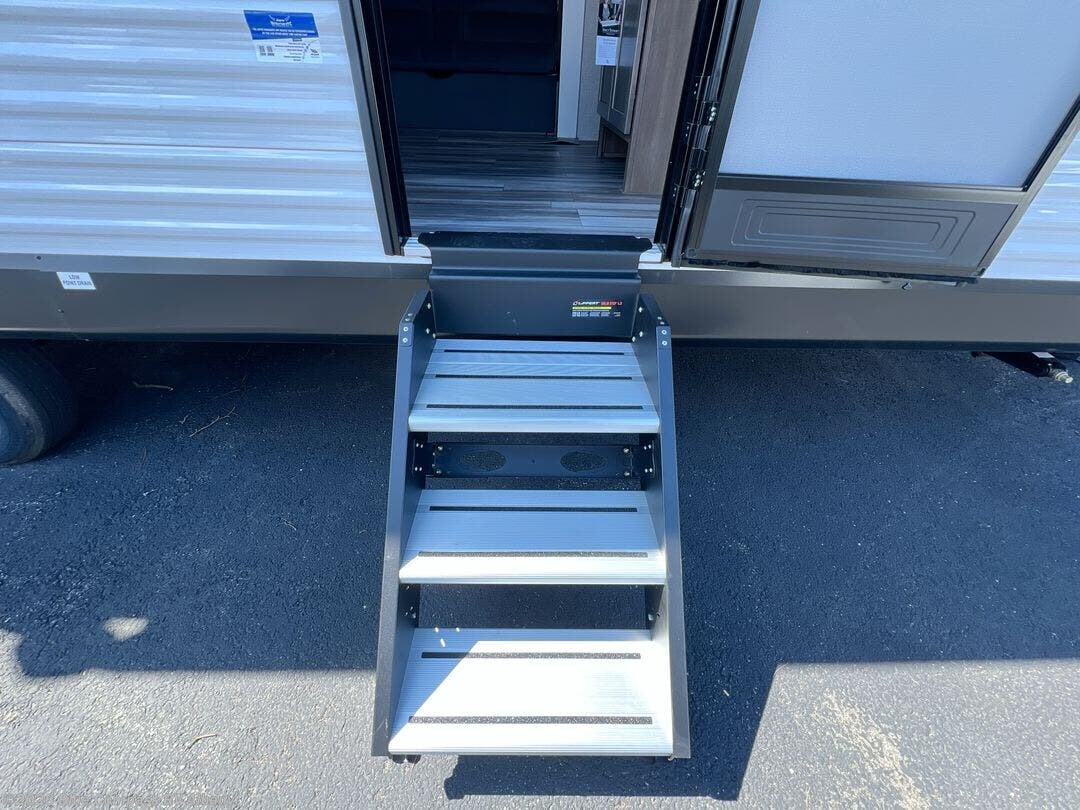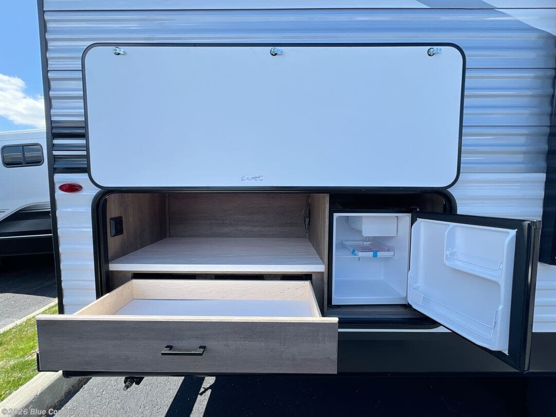 You can comfortably sleep up to ten people in this trailer thanks to the double-size bunks in back, the RV queen bed in the front bedroom, plus the booth dinette and jack-knife sofa in the main living area! The chef of your crew will have a three burner cooktop and microwave oven to prepare meals, and everyone can store their favorite drinks in the 8 cu. ft. 12V refrigerator inside, or in the outdoor refrigerator for convenience. The rear corner bathroom includes a tub/shower and a toilet, with the sink just outside of this room so others can brush their teeth if one is taking a shower before bed. The outside storage is accessible on both sides of the unit and will easily allow you bring along camp chairs, yard games and more. A 16' powered awning with LED lights will create a nice place to gather in the evenings with family and friends!