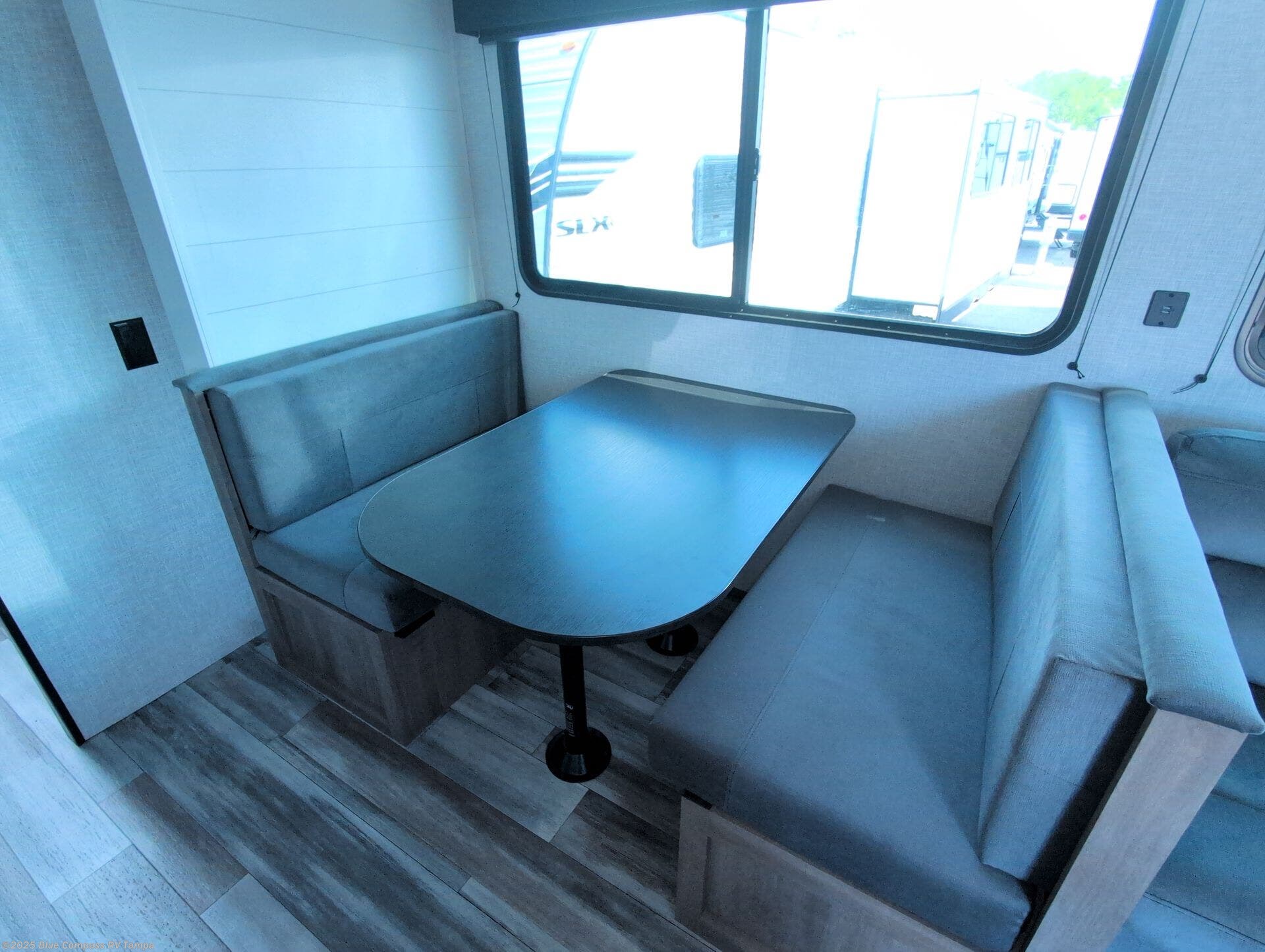 You can comfortably sleep up to ten people in this trailer thanks to the double-size bunks in back, the RV queen bed in the front bedroom, plus the booth dinette and jack-knife sofa in the main living area! The chef of your crew will have a three burner cooktop and microwave oven to prepare meals, and everyone can store their favorite drinks in the 8 cu. ft. 12V refrigerator inside, or in the outdoor refrigerator for convenience. The rear corner bathroom includes a tub/shower and a toilet, with the sink just outside of this room so others can brush their teeth if one is taking a shower before bed. The outside storage is accessible on both sides of the unit and will easily allow you bring along camp chairs, yard games and more. A 16' powered awning with LED lights will create a nice place to gather in the evenings with family and friends!