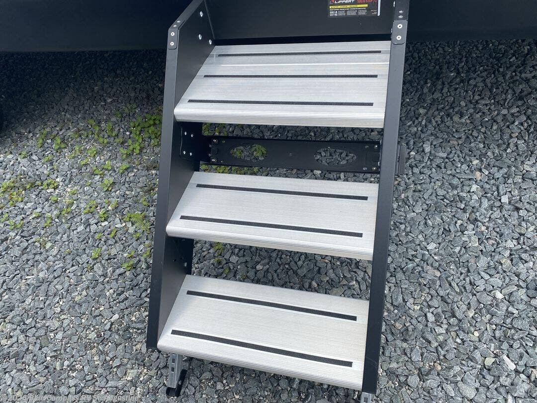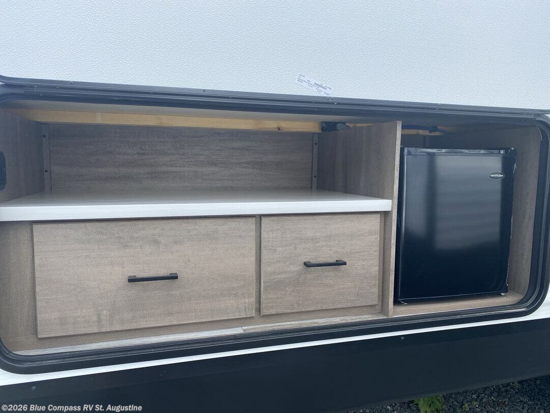 You can comfortably sleep up to ten people in this trailer thanks to the double-size bunks in back, the RV queen bed in the front bedroom, plus the booth dinette and jack-knife sofa in the main living area! The chef of your crew will have a three burner cooktop and microwave oven to prepare meals, and everyone can store their favorite drinks in the 8 cu. ft. 12V refrigerator inside, or in the outdoor refrigerator for convenience. The rear corner bathroom includes a tub/shower and a toilet, with the sink just outside of this room so others can brush their teeth if one is taking a shower before bed. The outside storage is accessible on both sides of the unit and will easily allow you bring along camp chairs, yard games and more. A 16' powered awning with LED lights will create a nice place to gather in the evenings with family and friends!