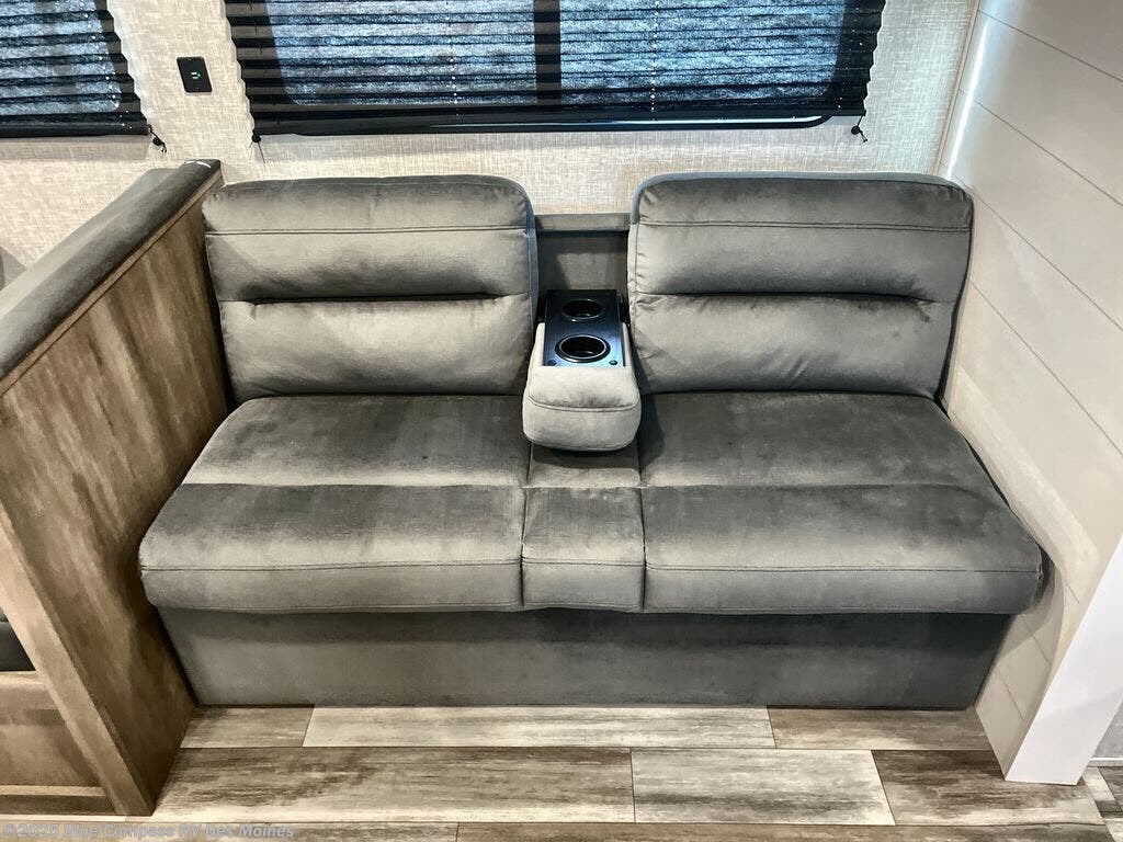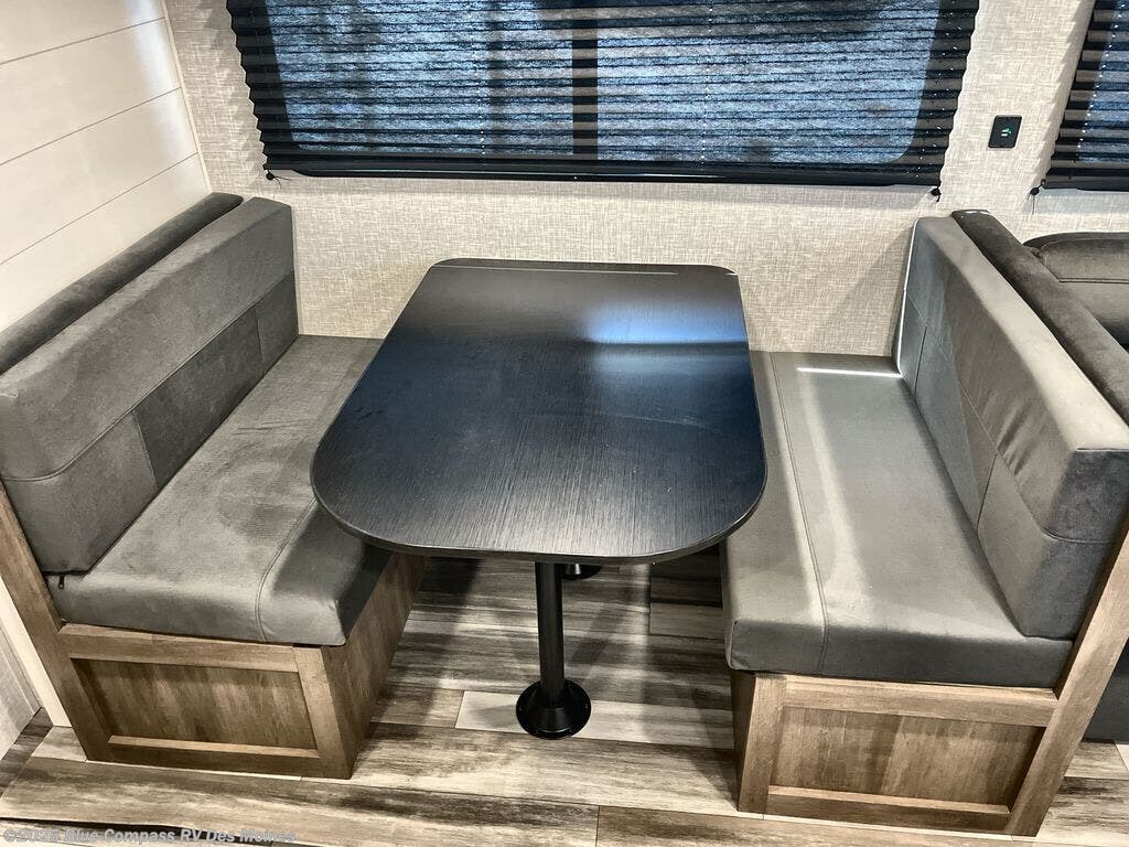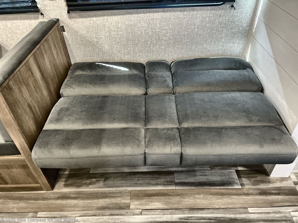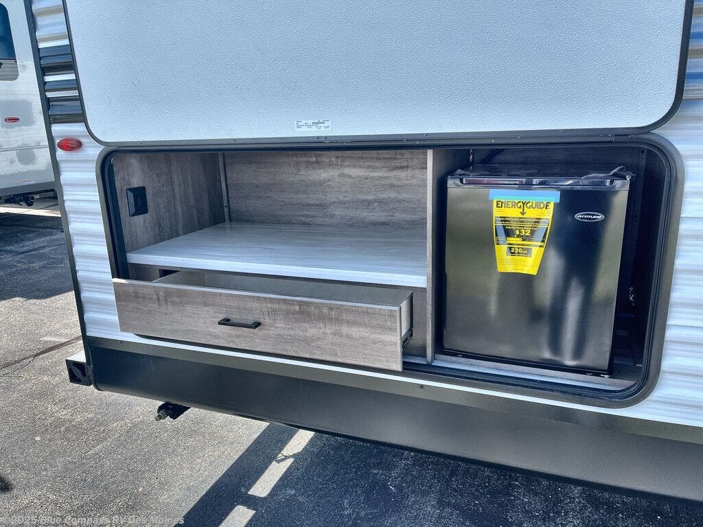 You can comfortably sleep up to ten people in this trailer thanks to the double-size bunks in back, the RV queen bed in the front bedroom, plus the booth dinette and jack-knife sofa in the main living area! The chef of your crew will have a three burner cooktop and microwave oven to prepare meals, and everyone can store their favorite drinks in the 8 cu. ft. 12V refrigerator inside, or in the outdoor refrigerator for convenience. The rear corner bathroom includes a tub/shower and a toilet, with the sink just outside of this room so others can brush their teeth if one is taking a shower before bed. The outside storage is accessible on both sides of the unit and will easily allow you bring along camp chairs, yard games and more. A 16' powered awning with LED lights will create a nice place to gather in the evenings with family and friends!